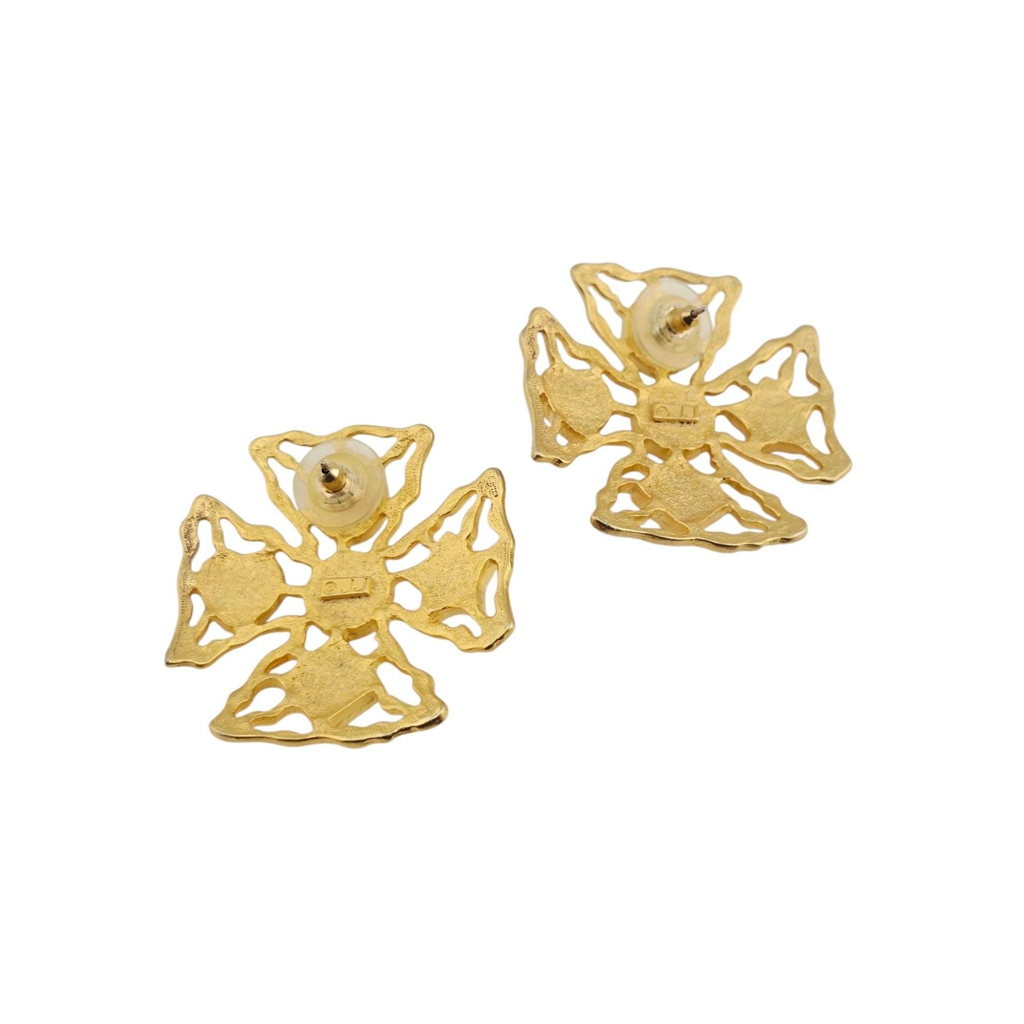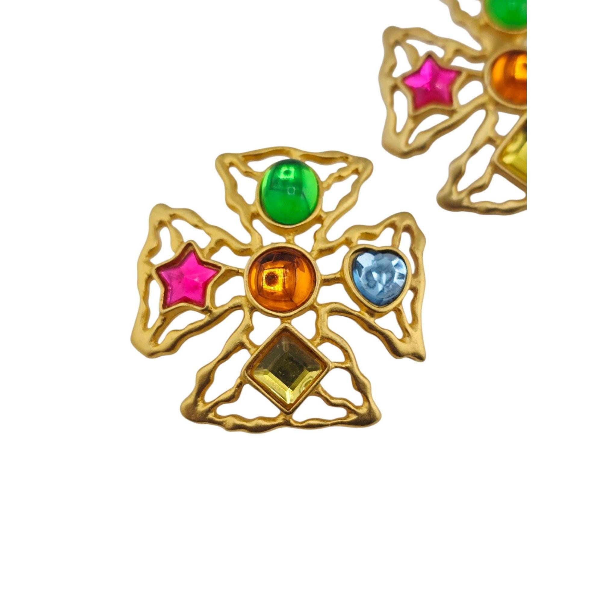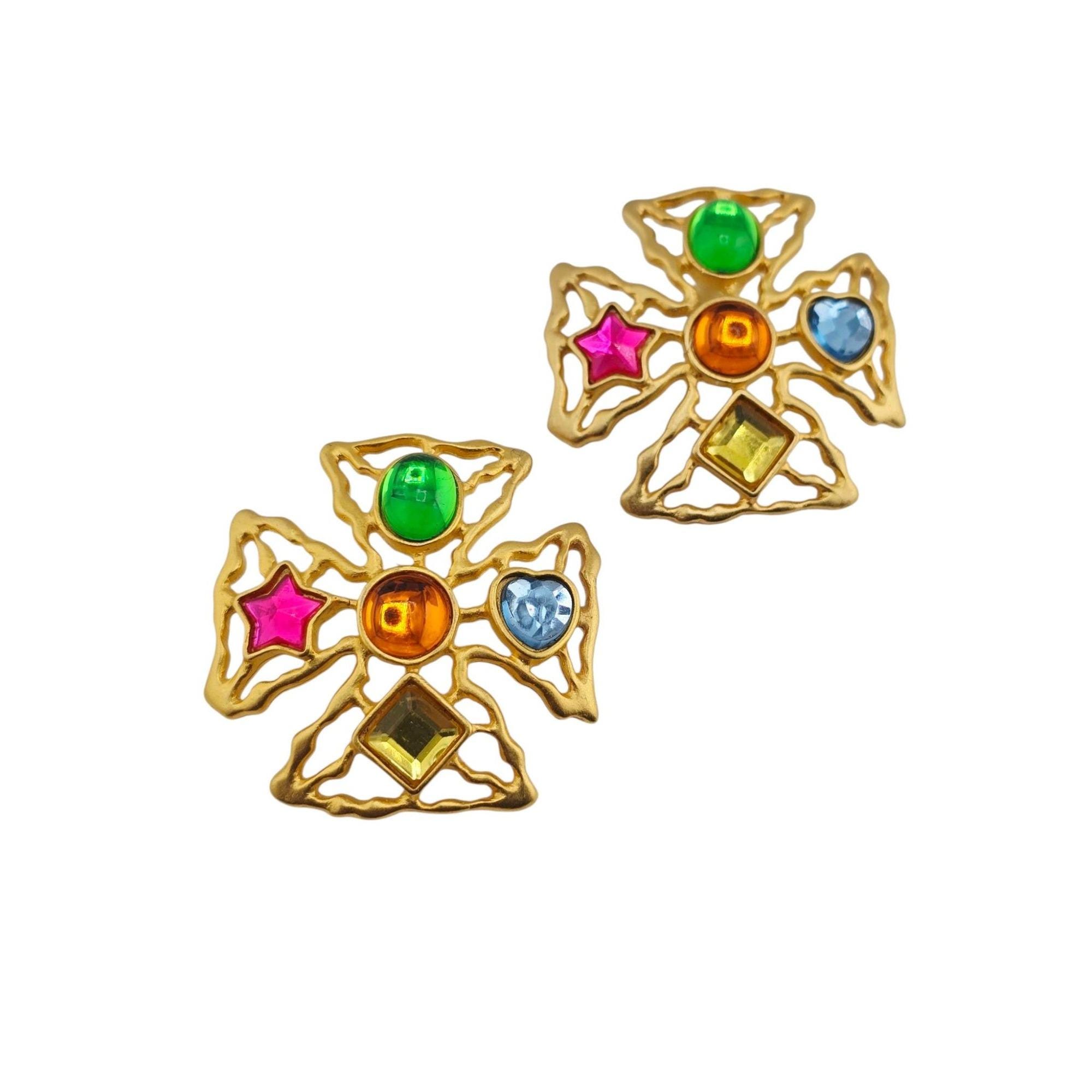 Vintage JJ Signed Colorful Maltese Cross Pierced Earrings (A8875)
