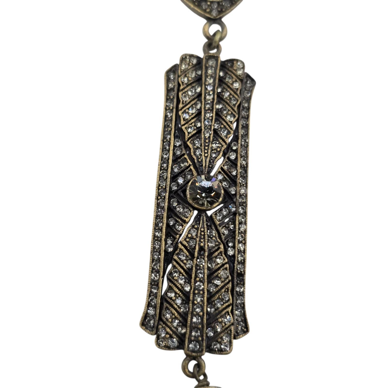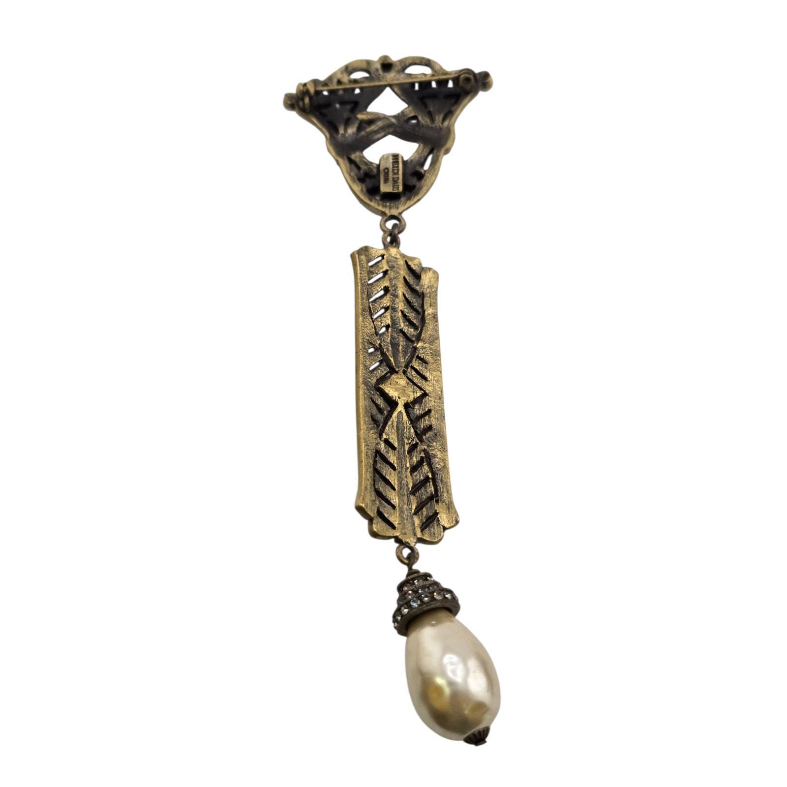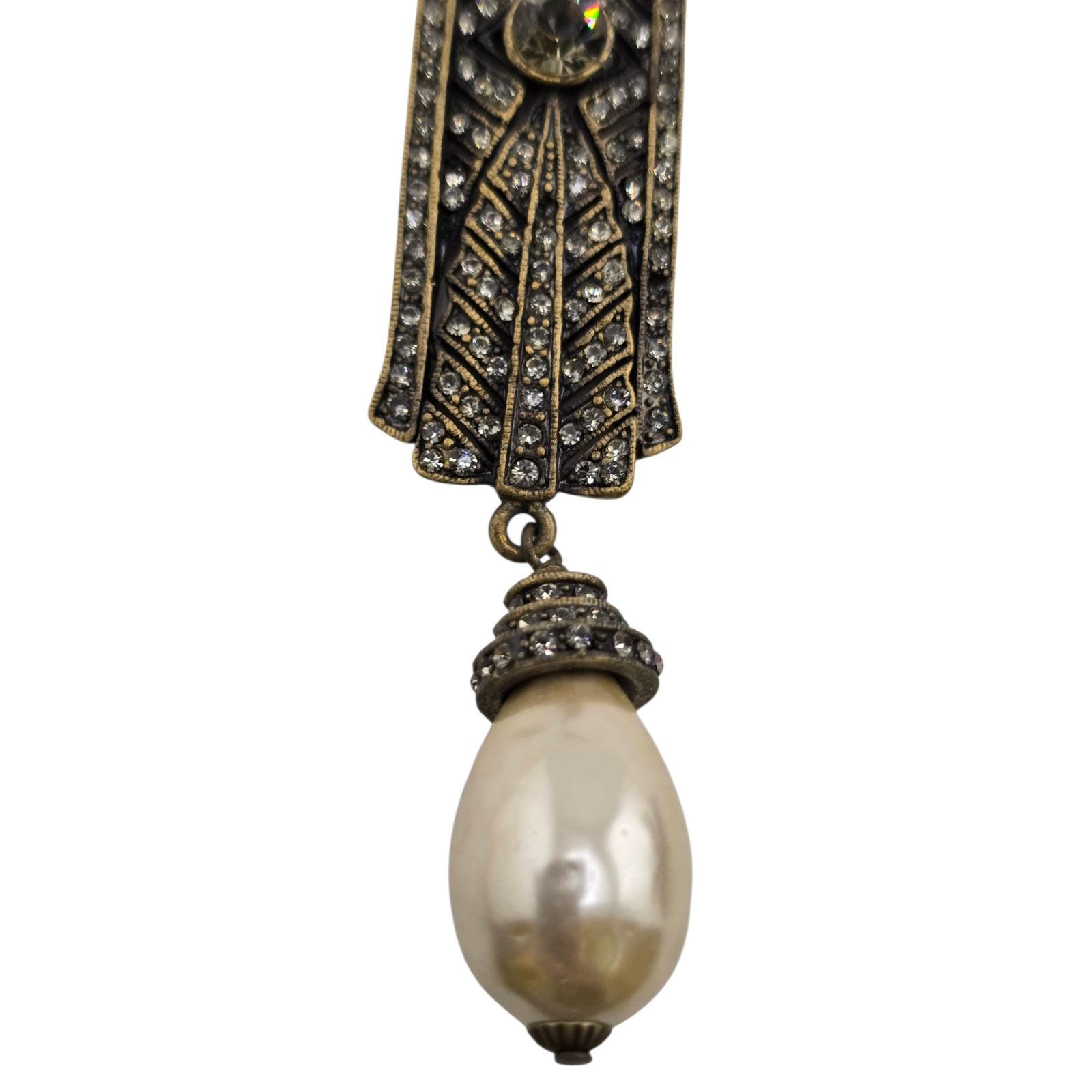 Details: This lovely vintage brooch by Heidi Daus features a beautiful Art Deco design. The top has a fan-shaped pattern with sparkling rhinestones, leading to a center section with a round stone and chevron details. A large teardrop pearl hangs from the bottom, adding charm and elegance