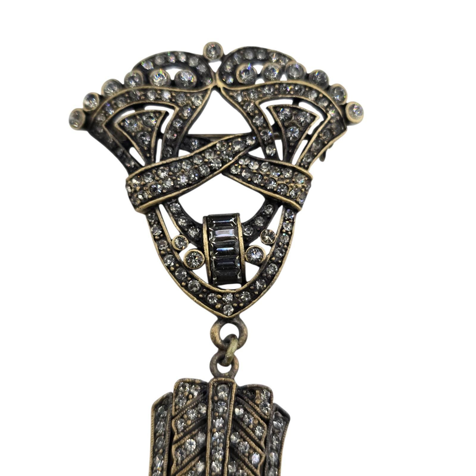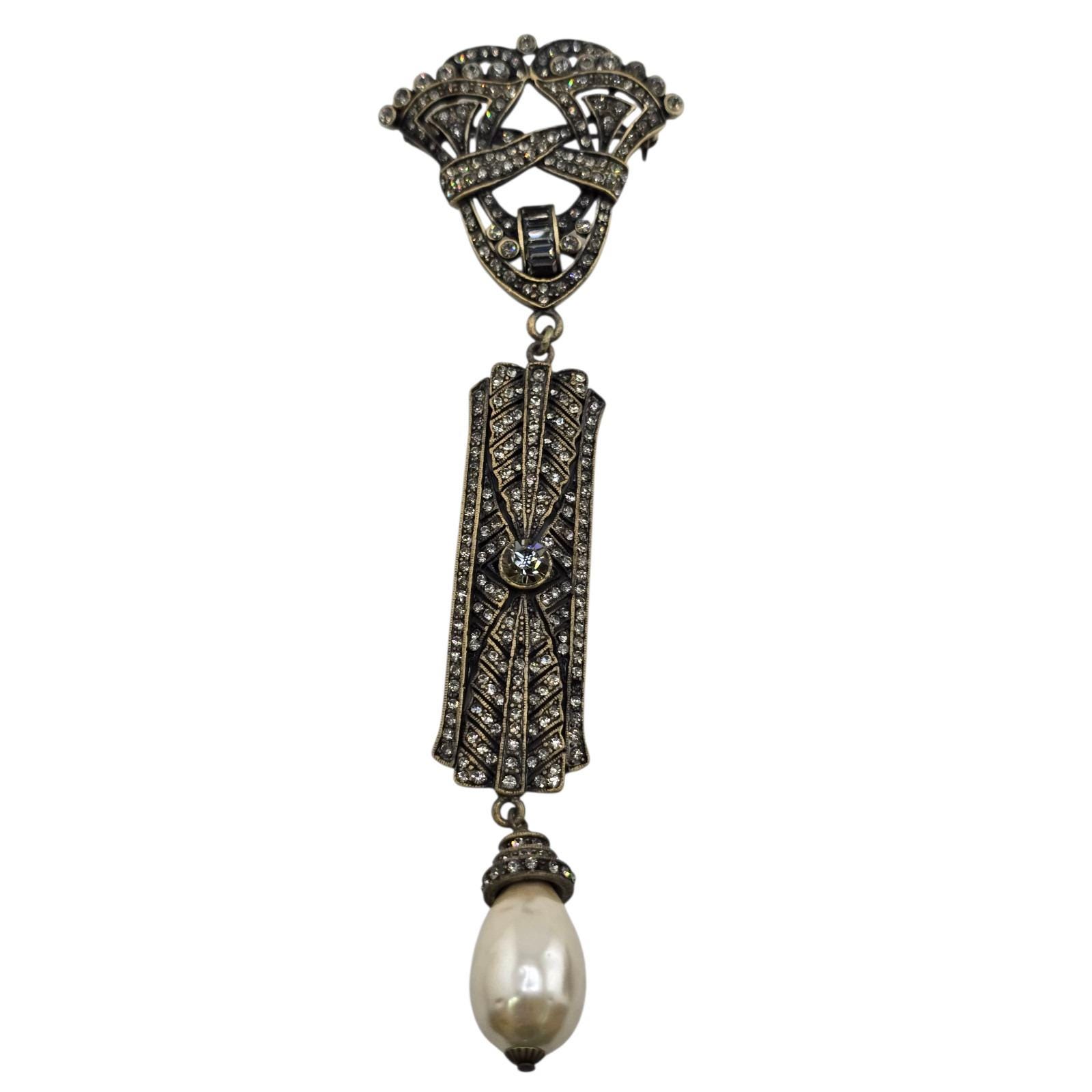 Signed Heidi Daus China Deco Style Rhinestone Pearl Dangle Brooch (A9169)