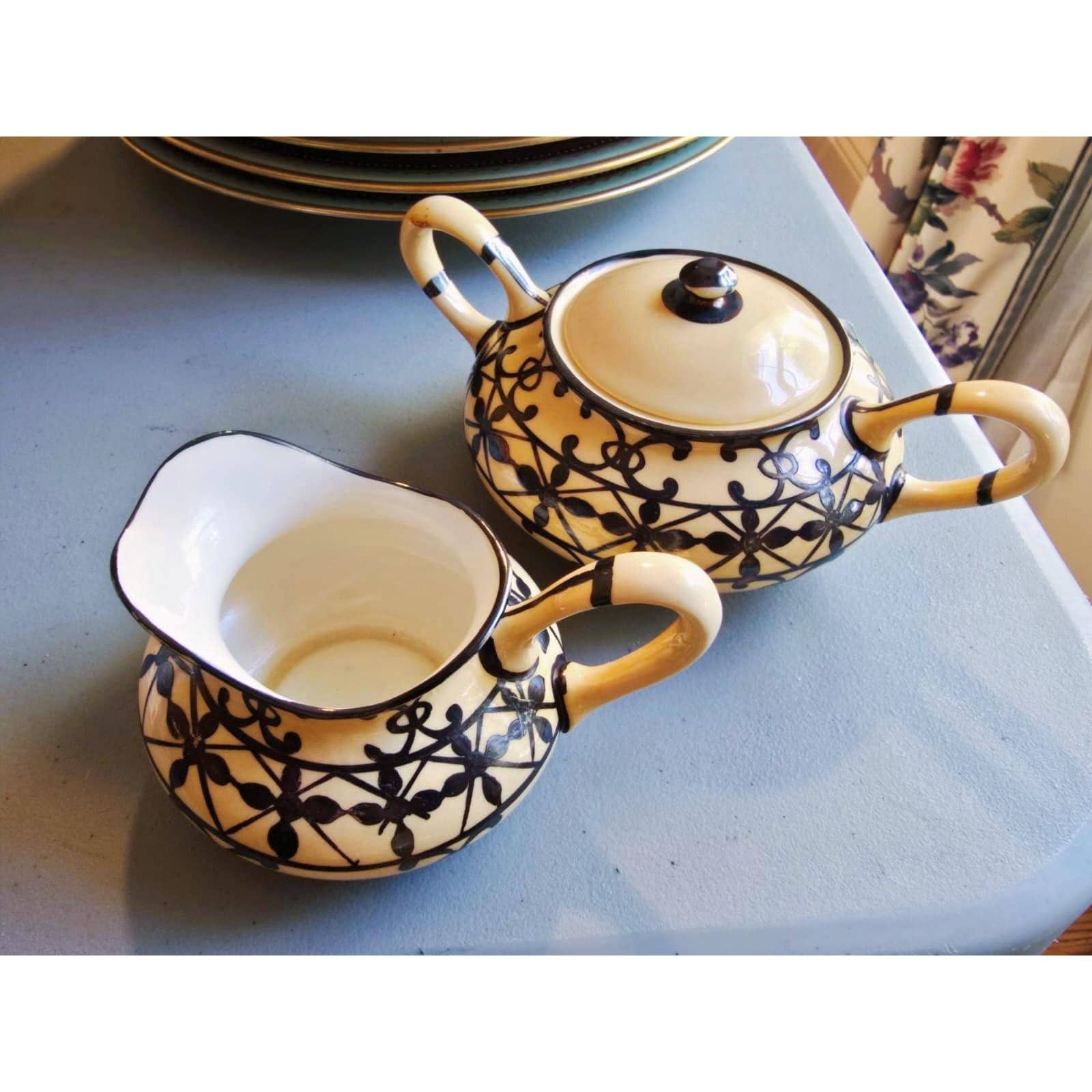 This vintage Lenox cream and sugar set showcases exquisite porcelain with an intricate silver overlay. It exudes timeless elegance, ideal for antique table settings or collections.