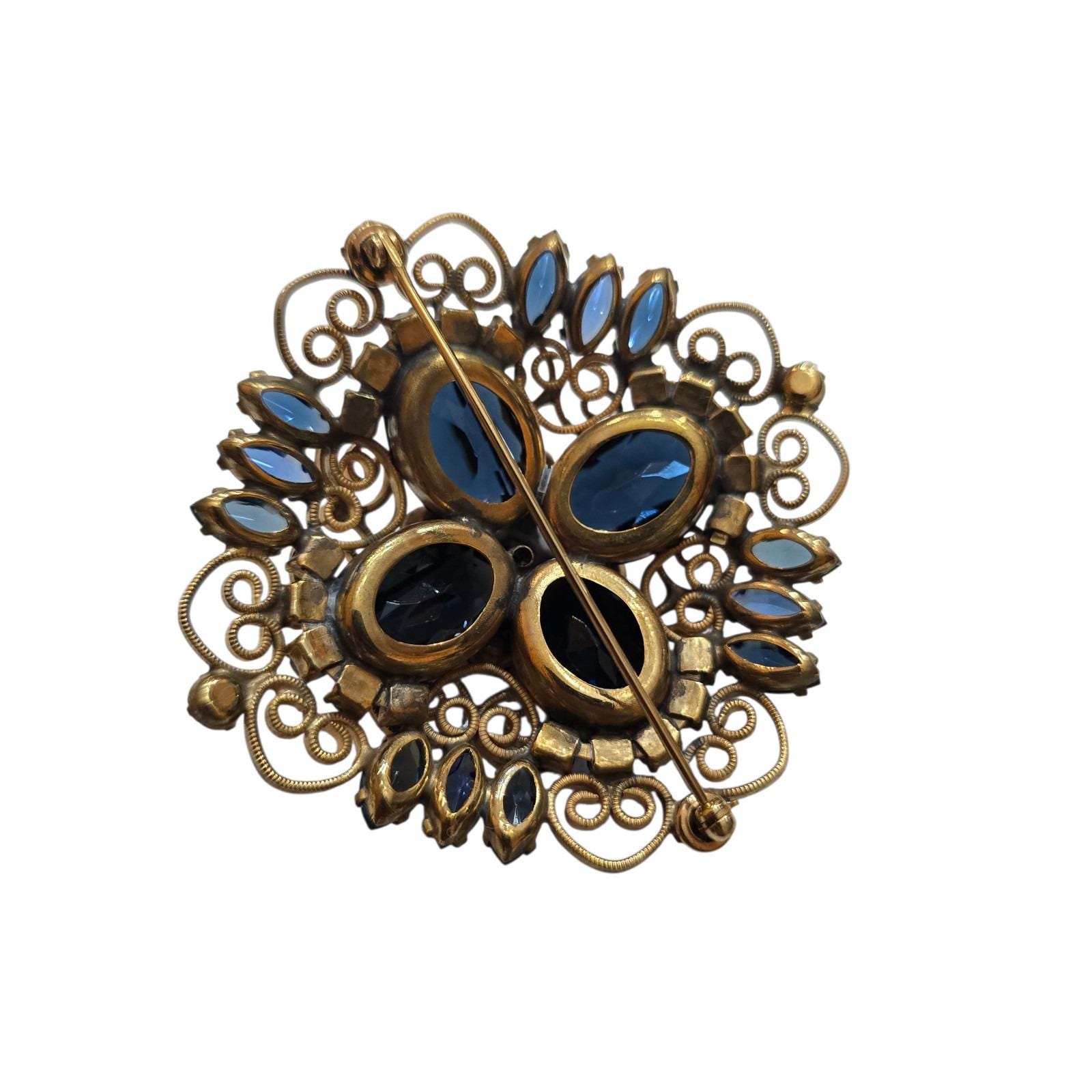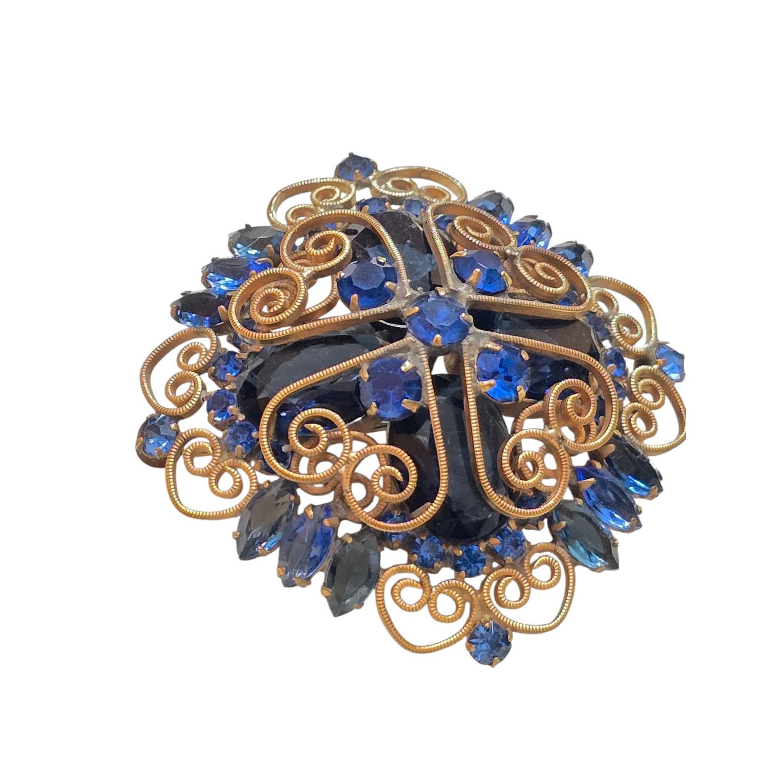 Vintage Beauty Royal Blues Rhinestone And Brass Filigree Domed Brooch (A9014)