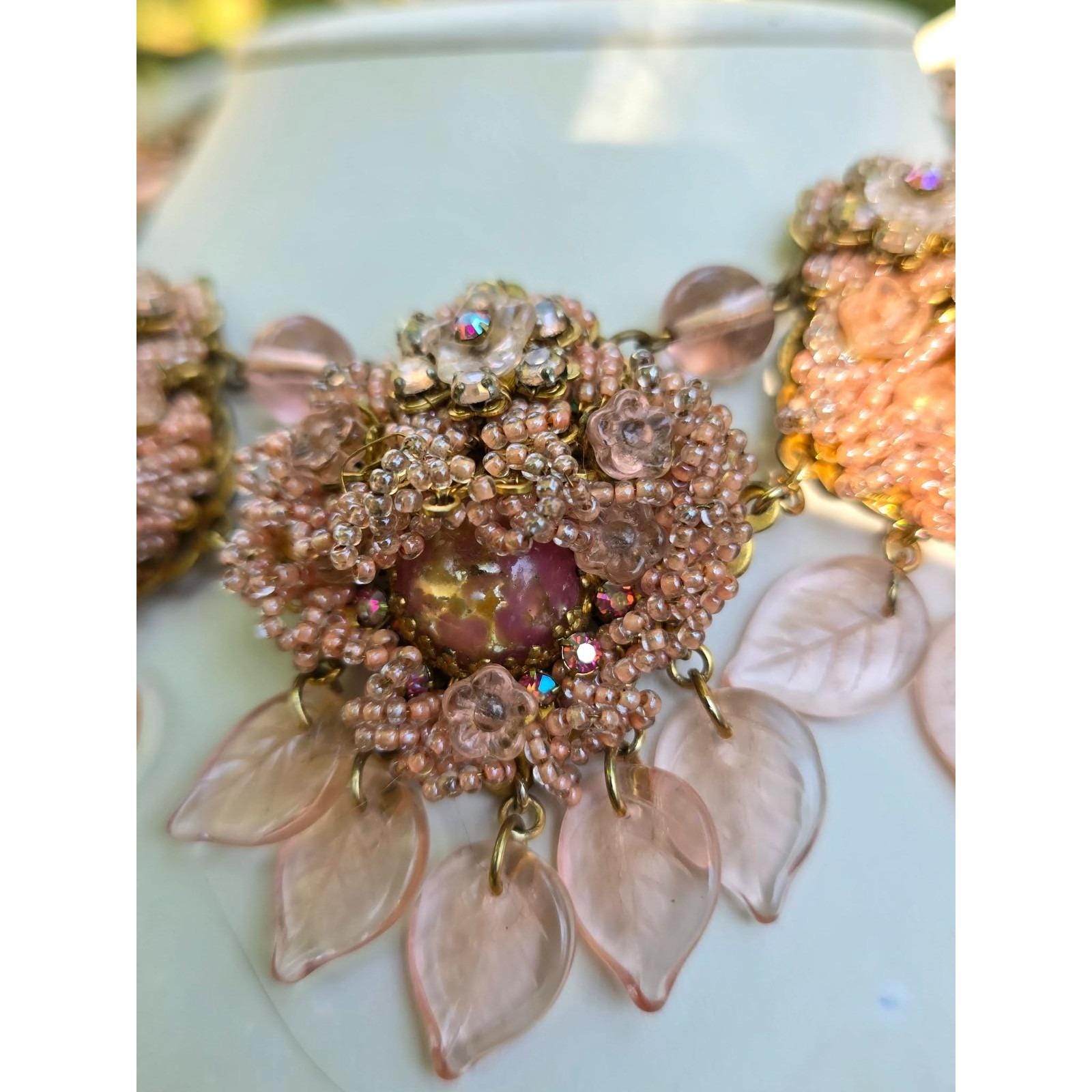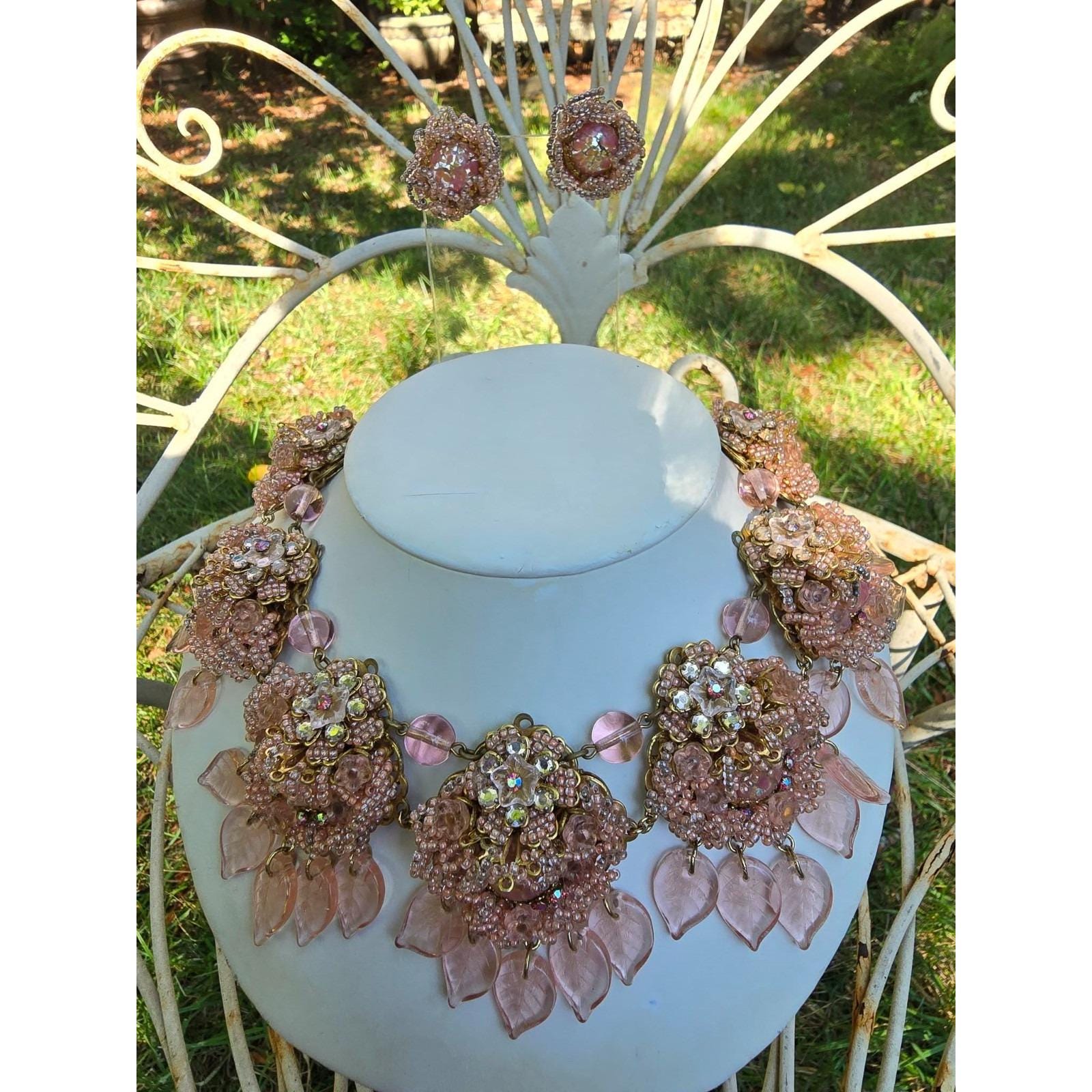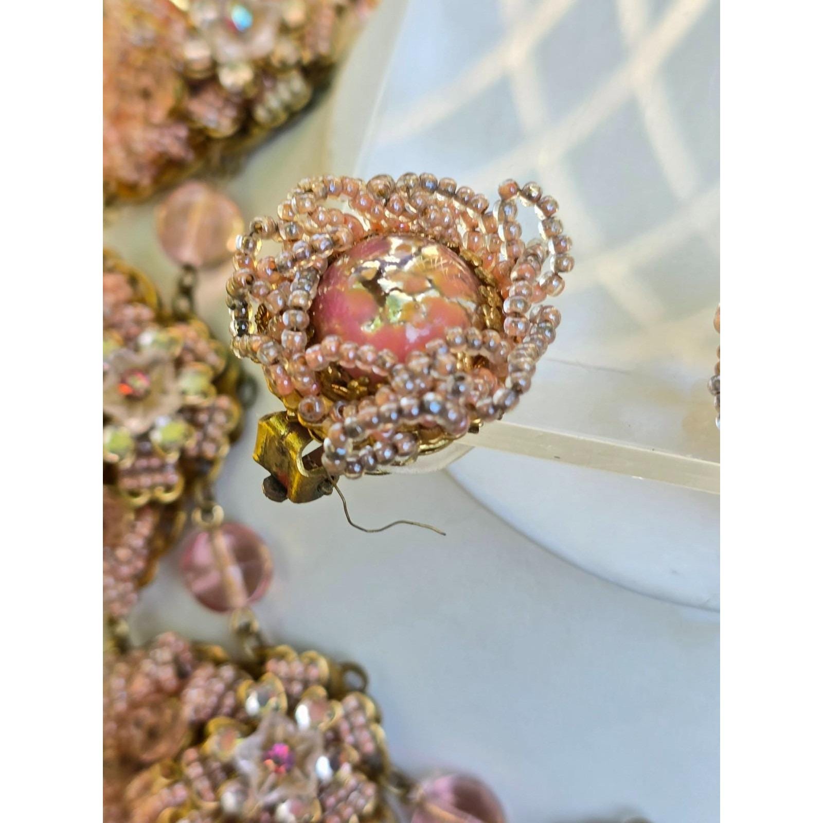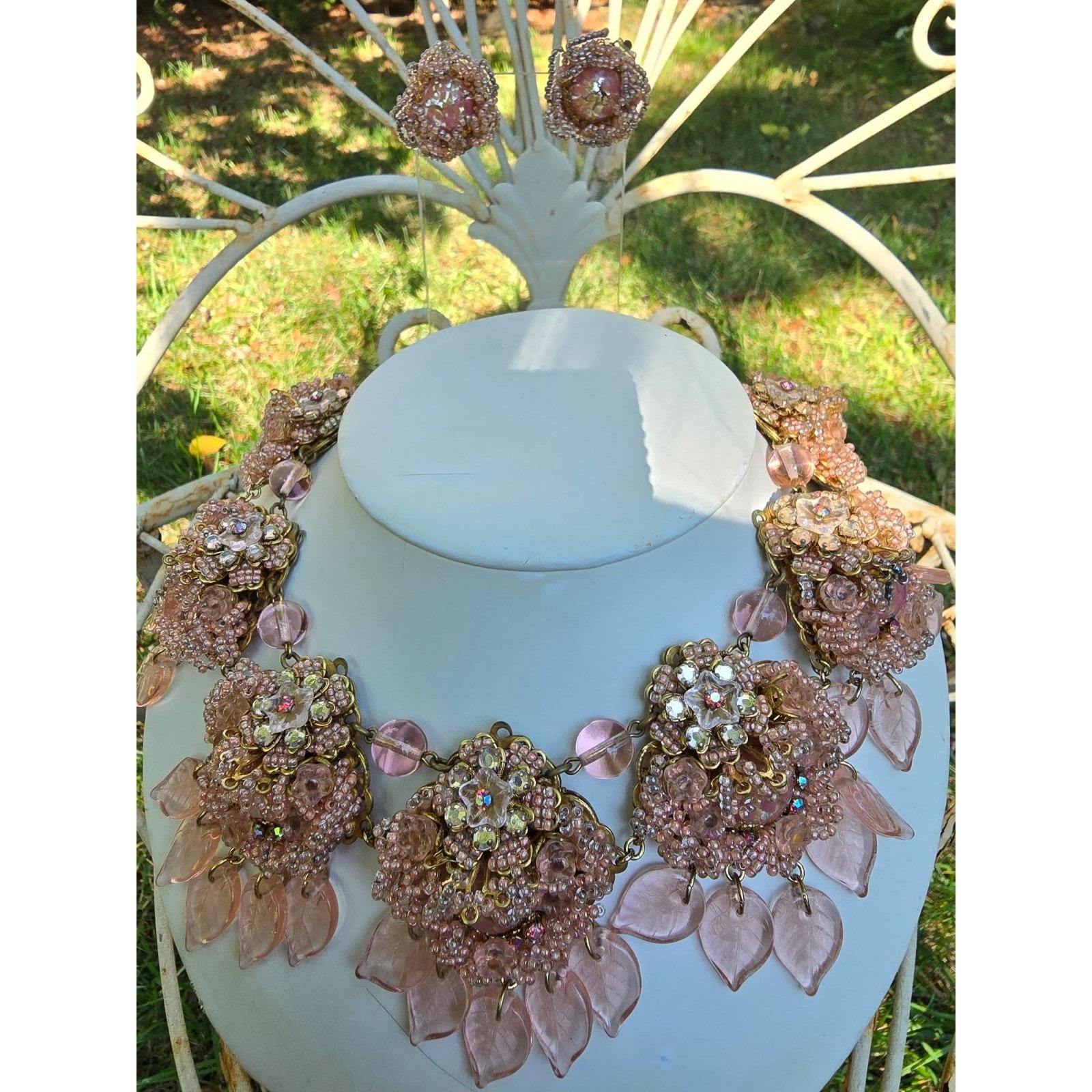 This is an exceptional set featuring a necklace and matching earrings; the necklace and one earring are signed. The color is a soft, pale pink with confetti-style glass cabochons and dangling glass leaves. The necklace has a J-hook closure with a glass-beaded extension tail.