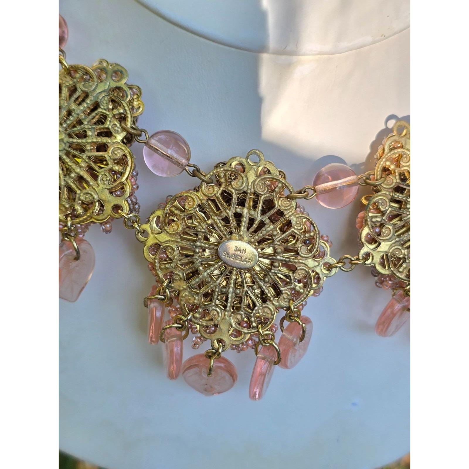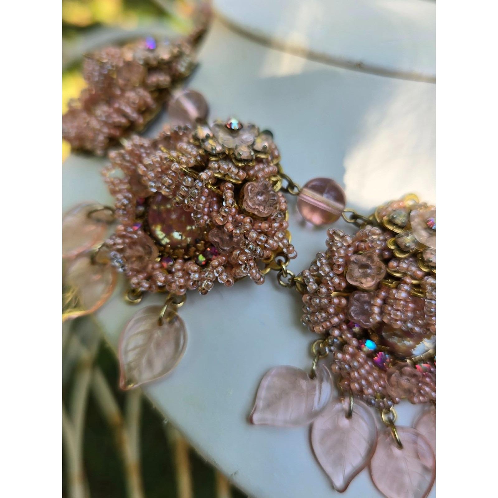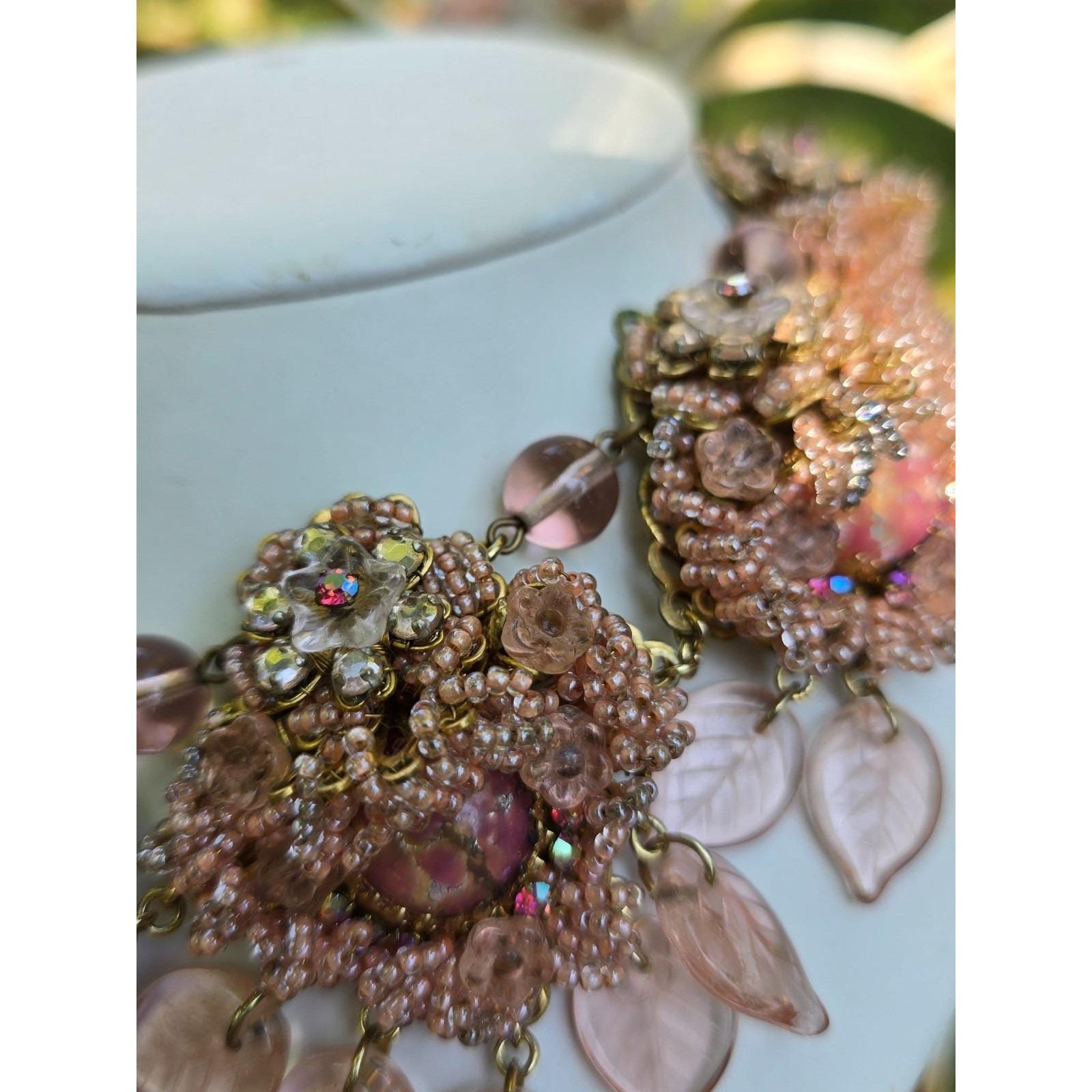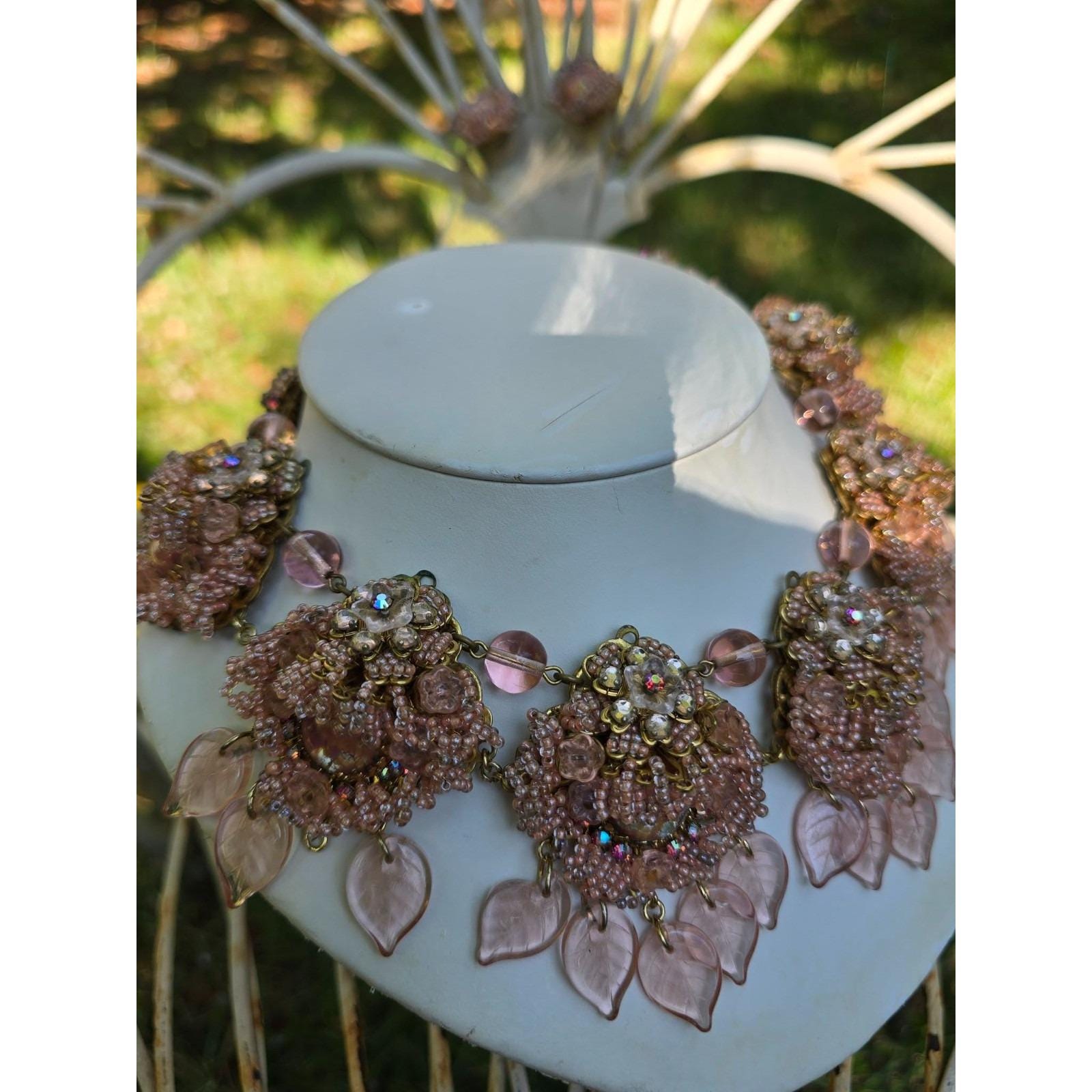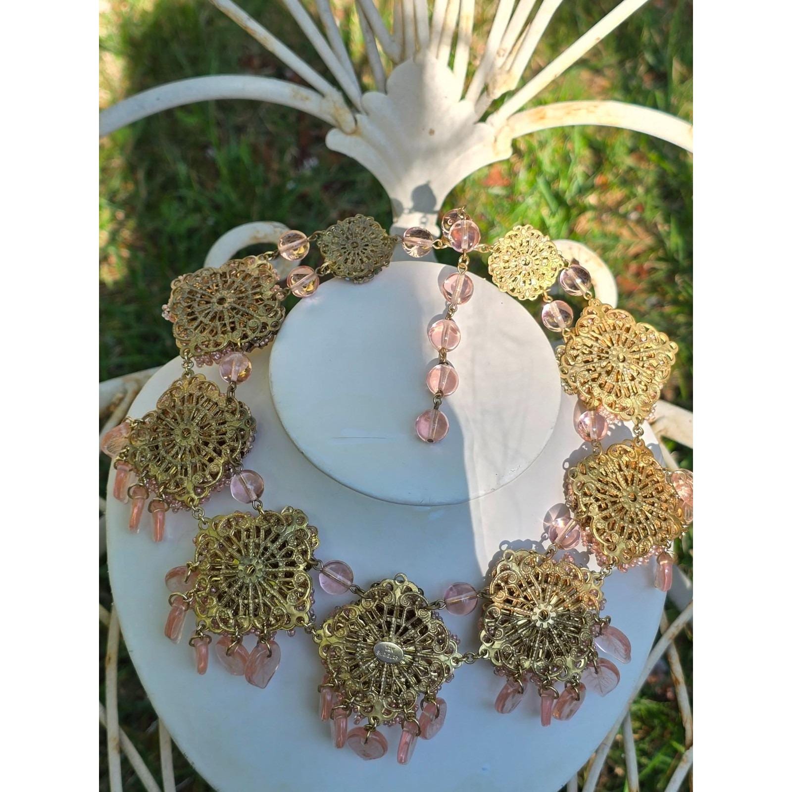 This is an exceptional set featuring a necklace and matching earrings; the necklace and one earring are signed. The color is a soft, pale pink with confetti-style glass cabochons and dangling glass leaves. The necklace has a J-hook closure with a glass-beaded extension tail.