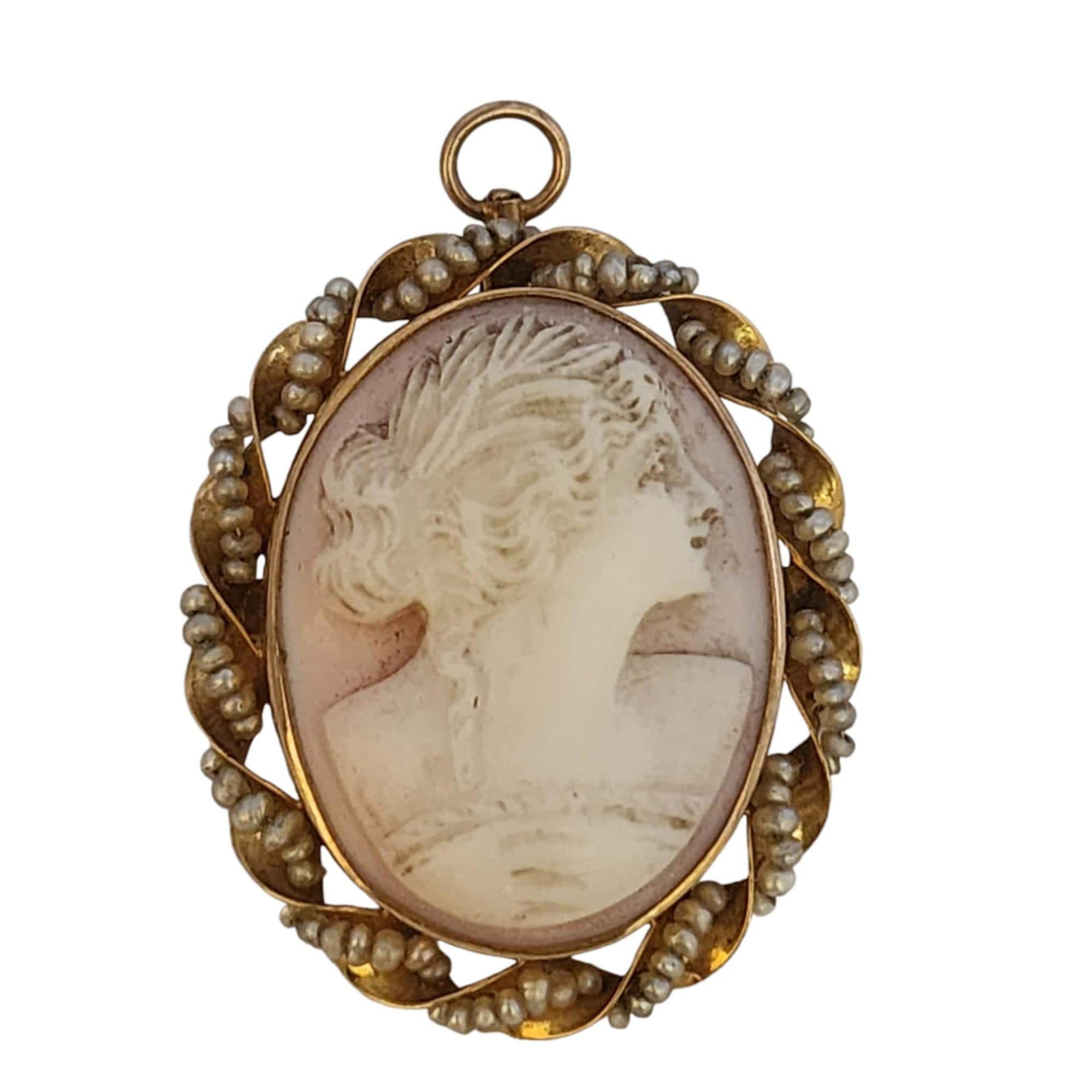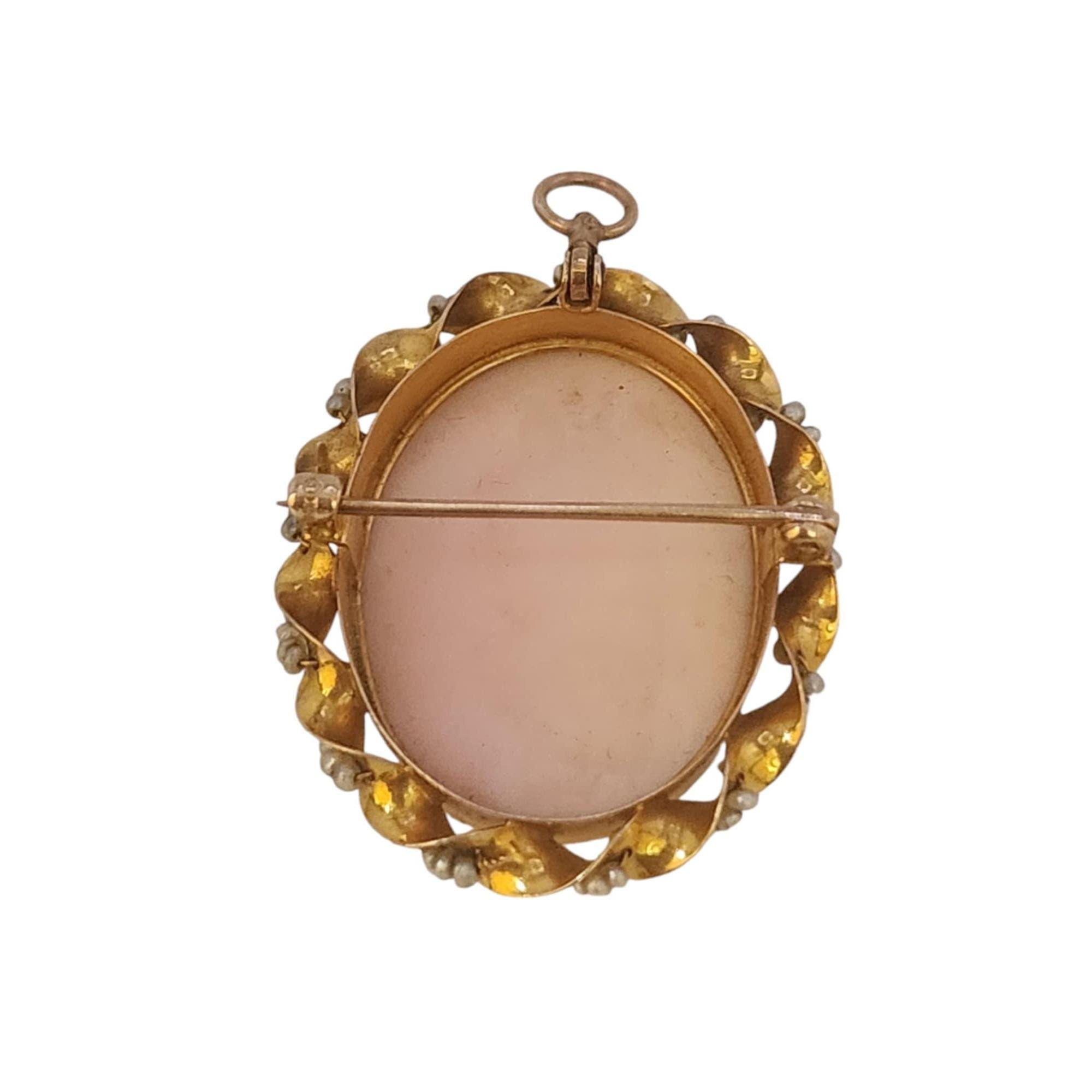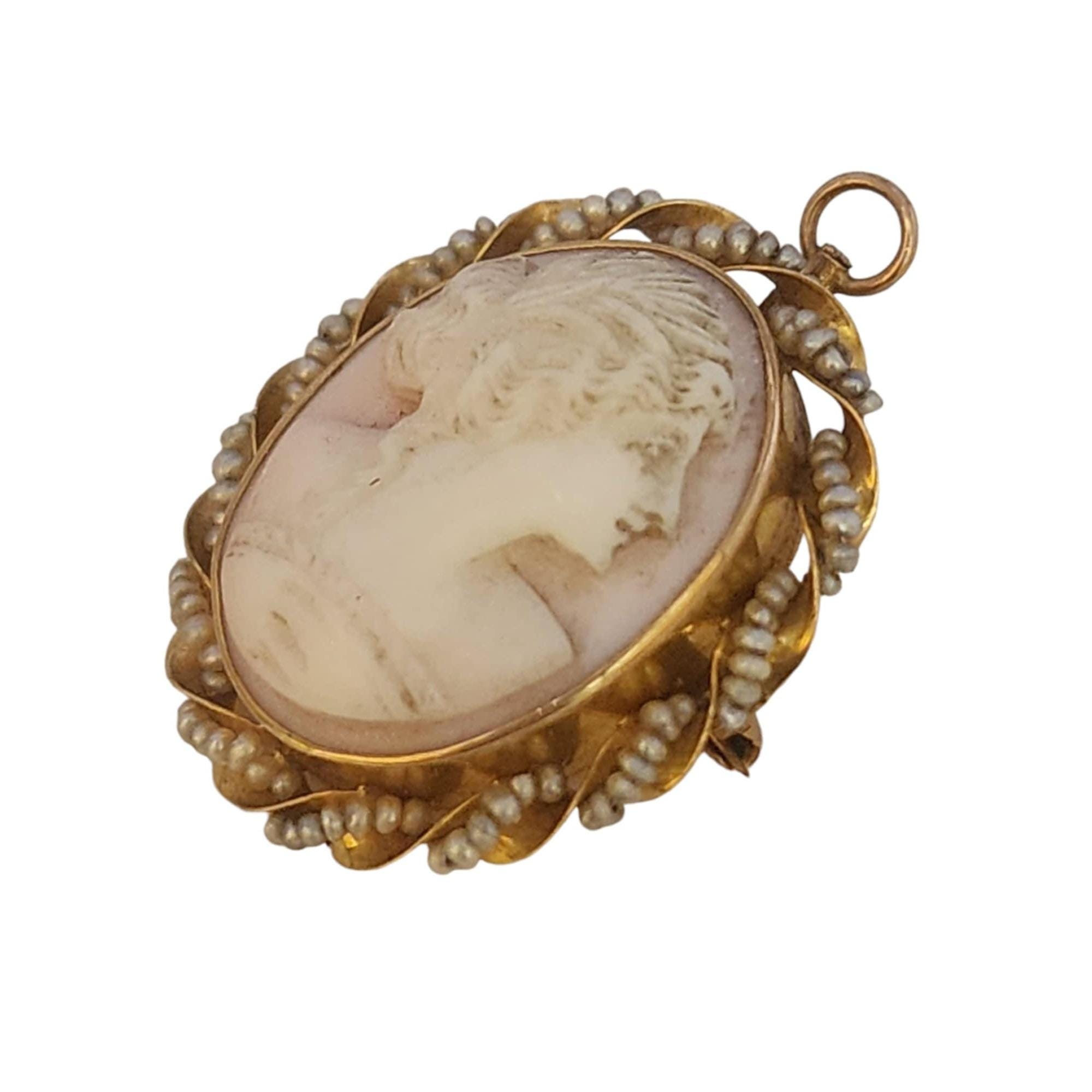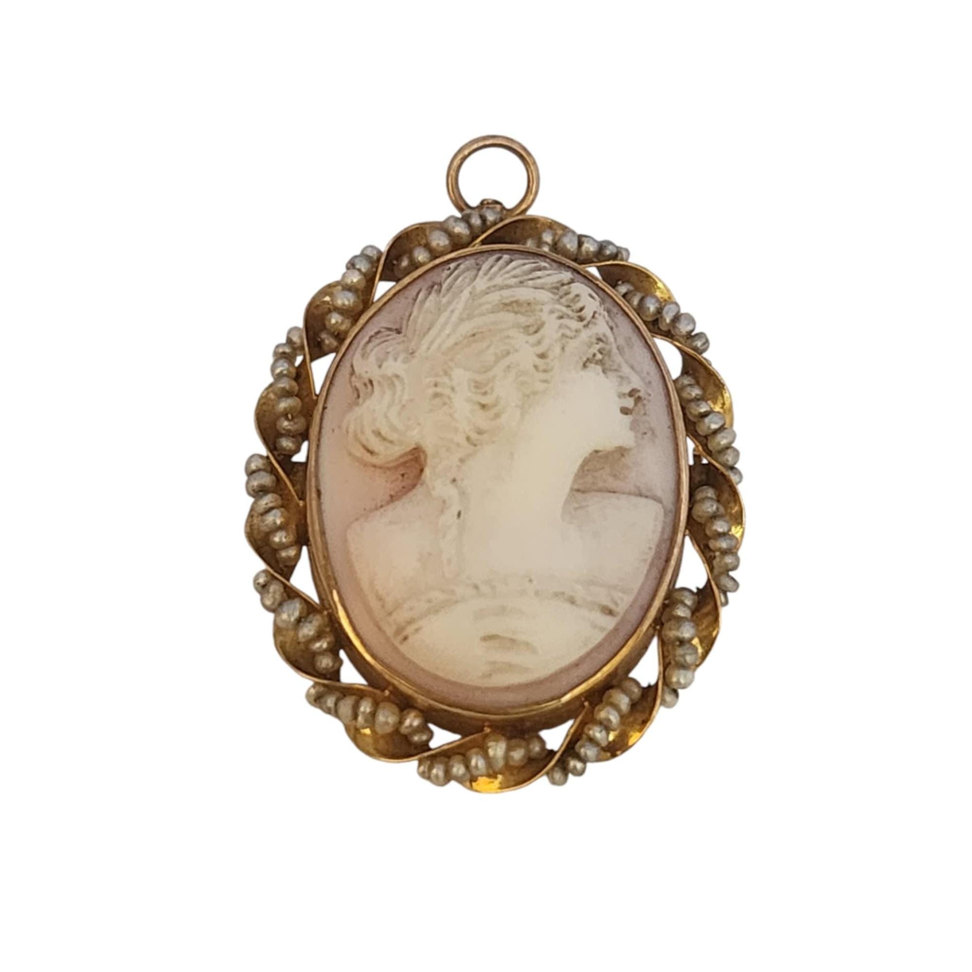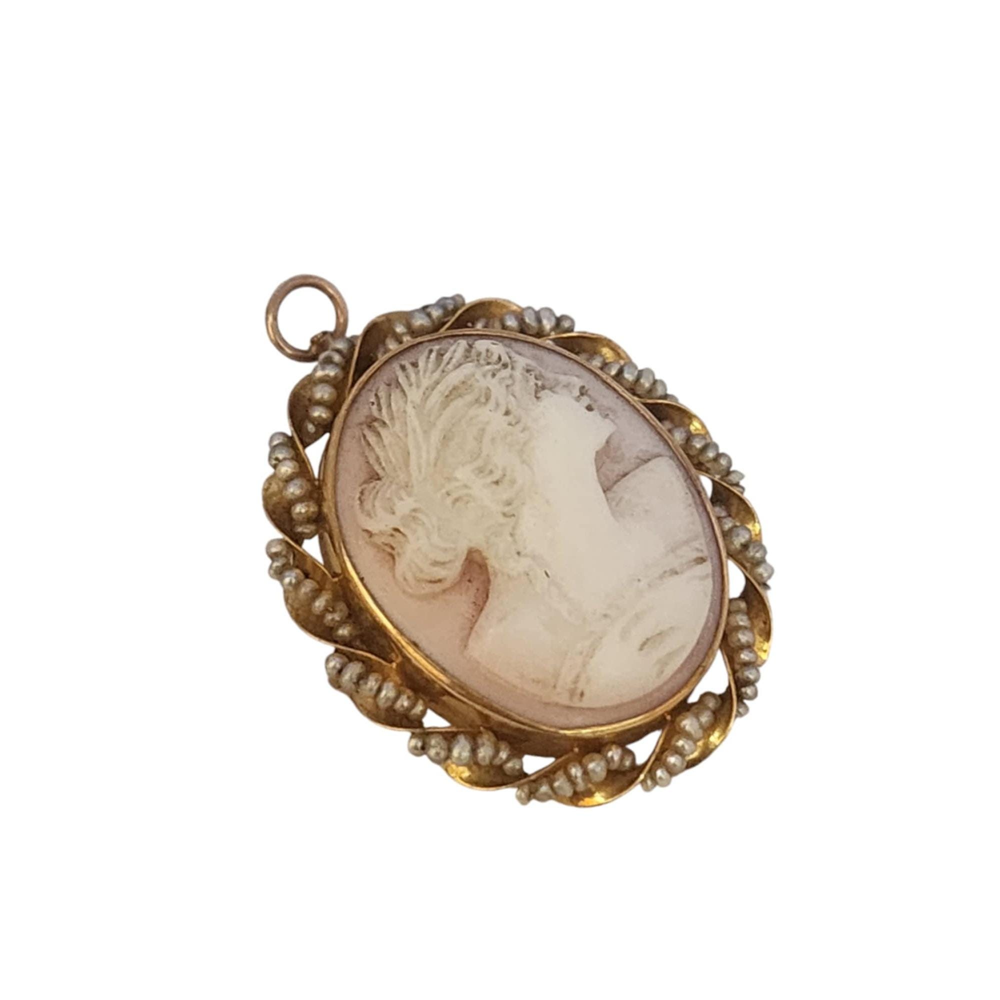 Antique Pink Shell Cameo 14kt Gold & Seed Pearl Brooch/Pendant (A5318)
