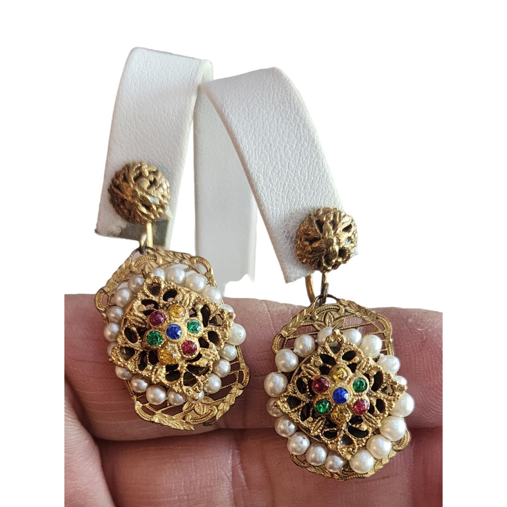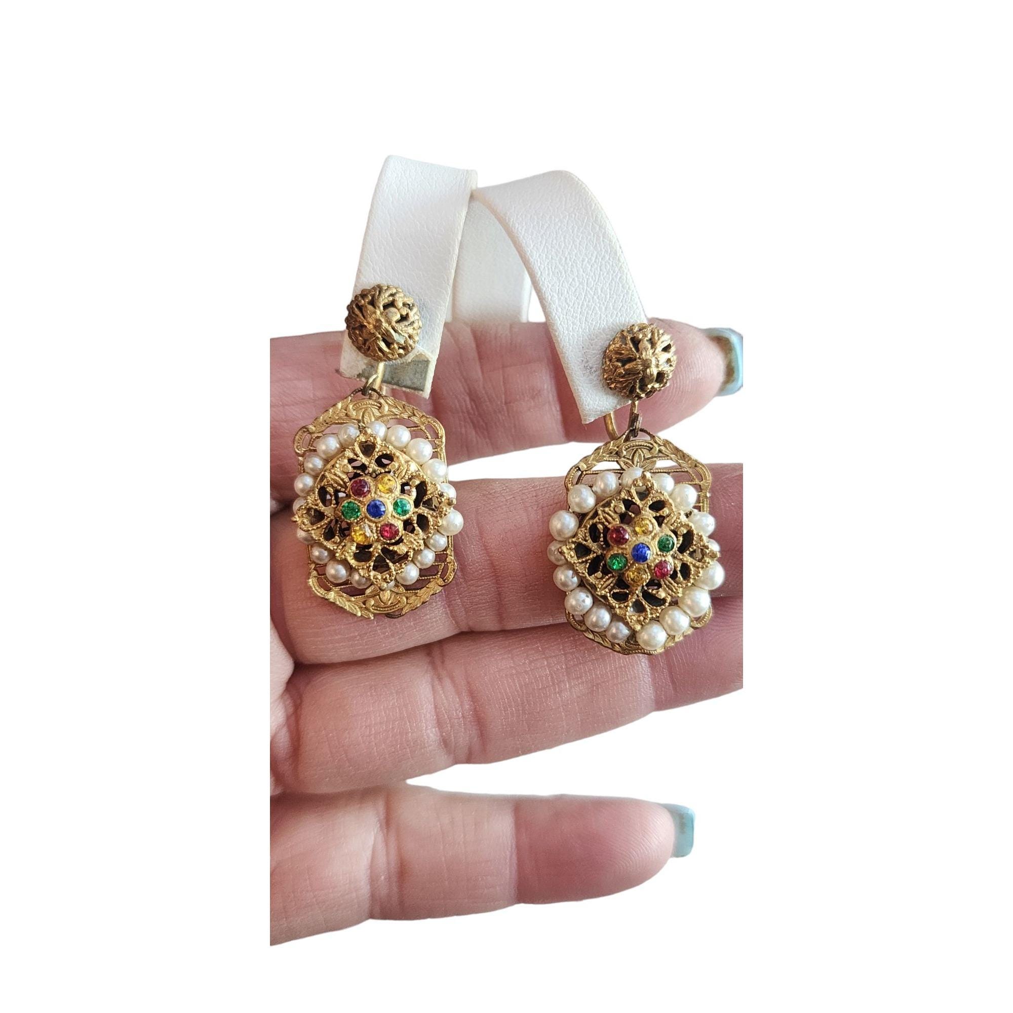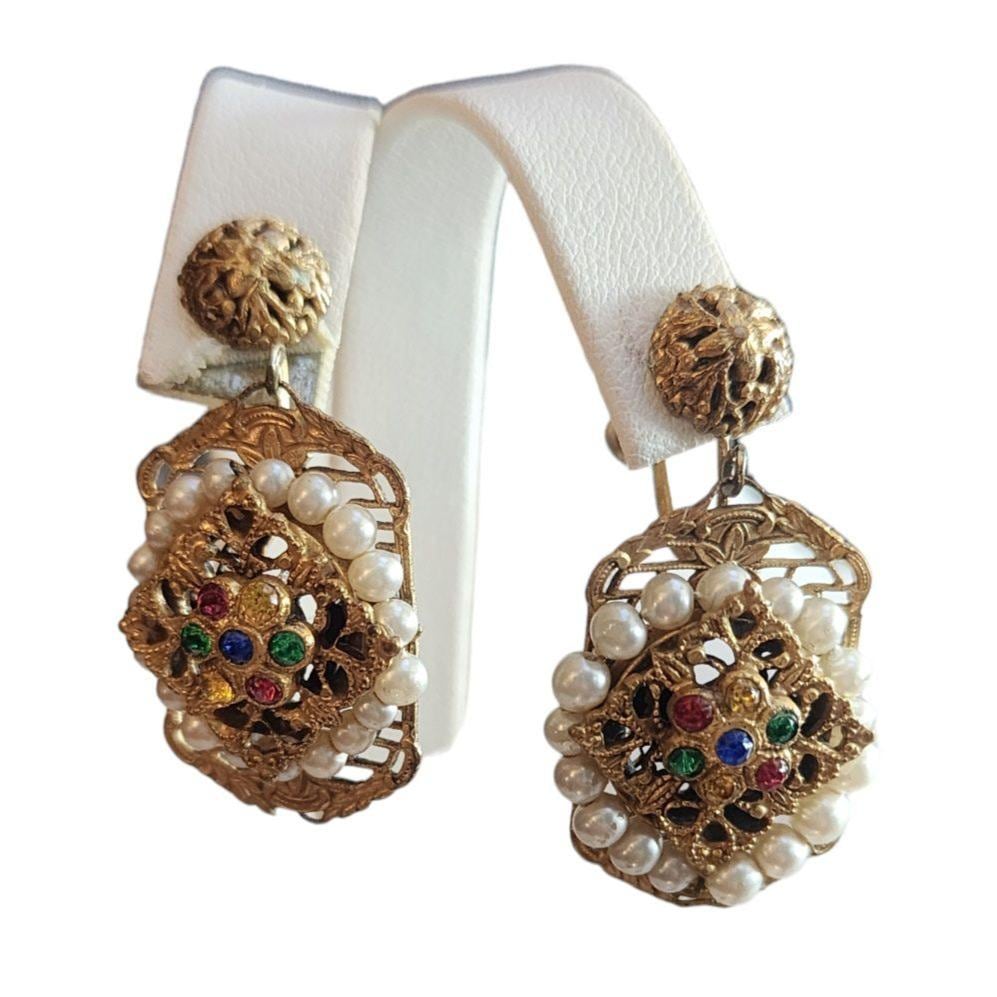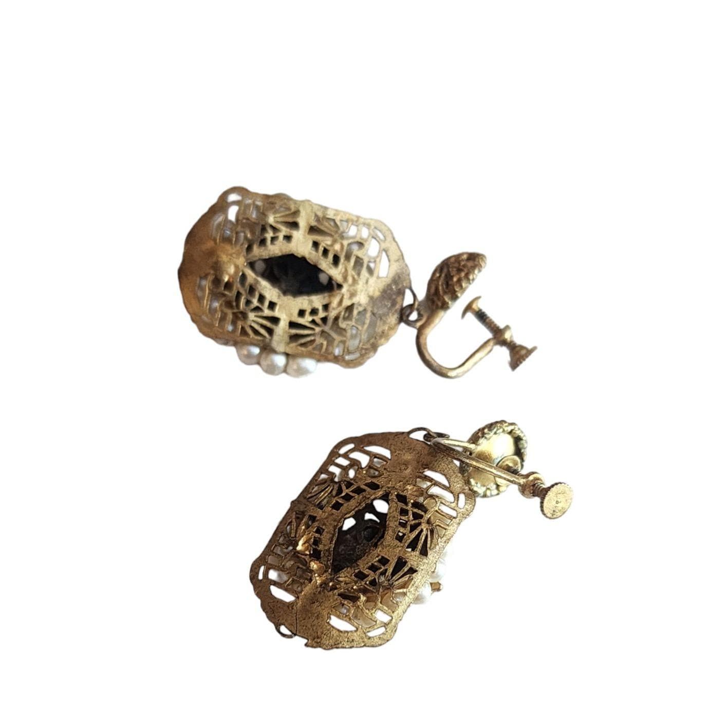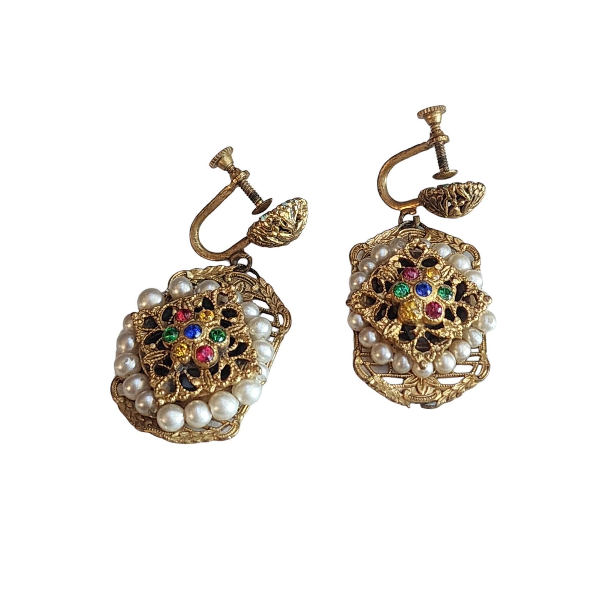 Vintage Czech Rhinestone Pearl & Filigree Screw Back Earrings (A4083)