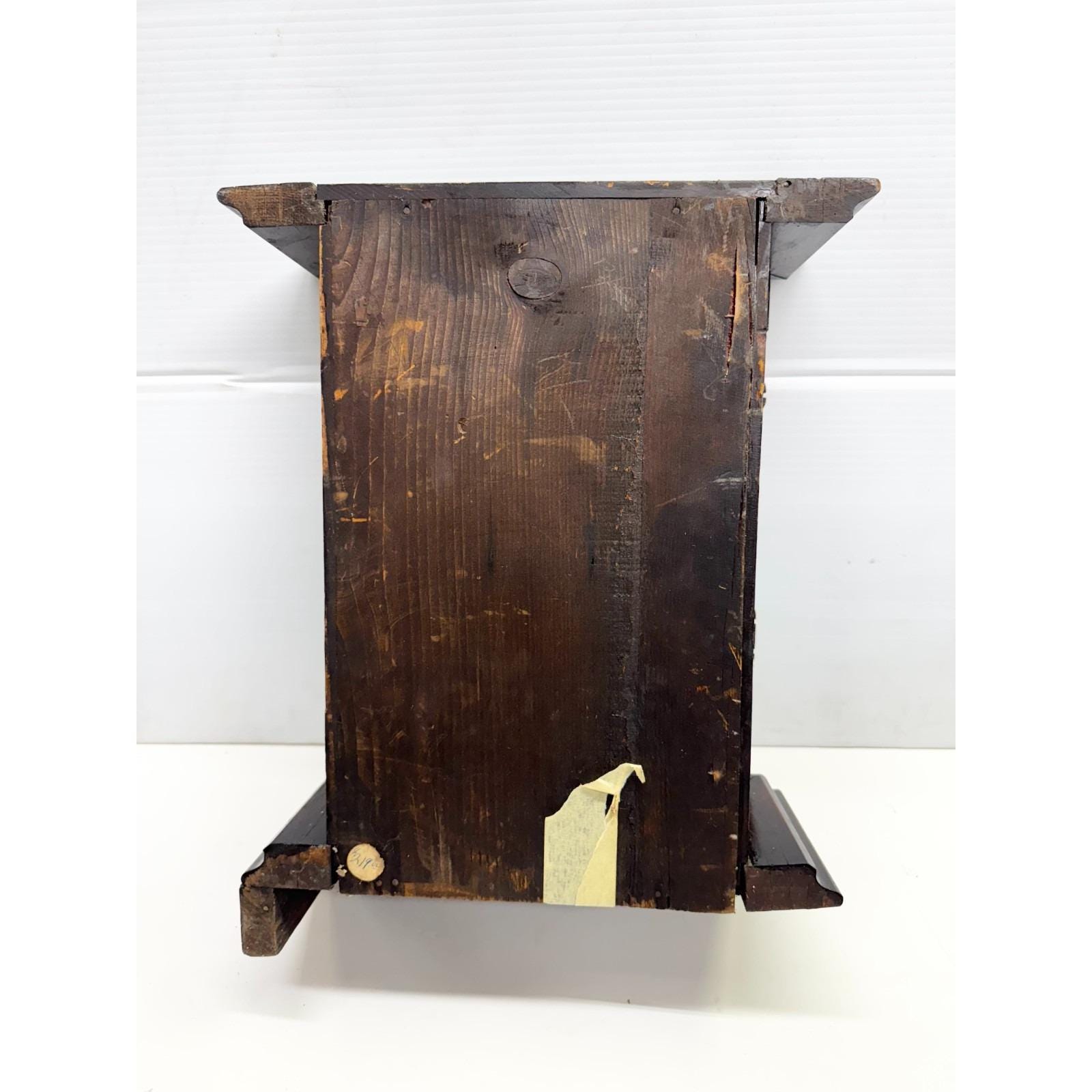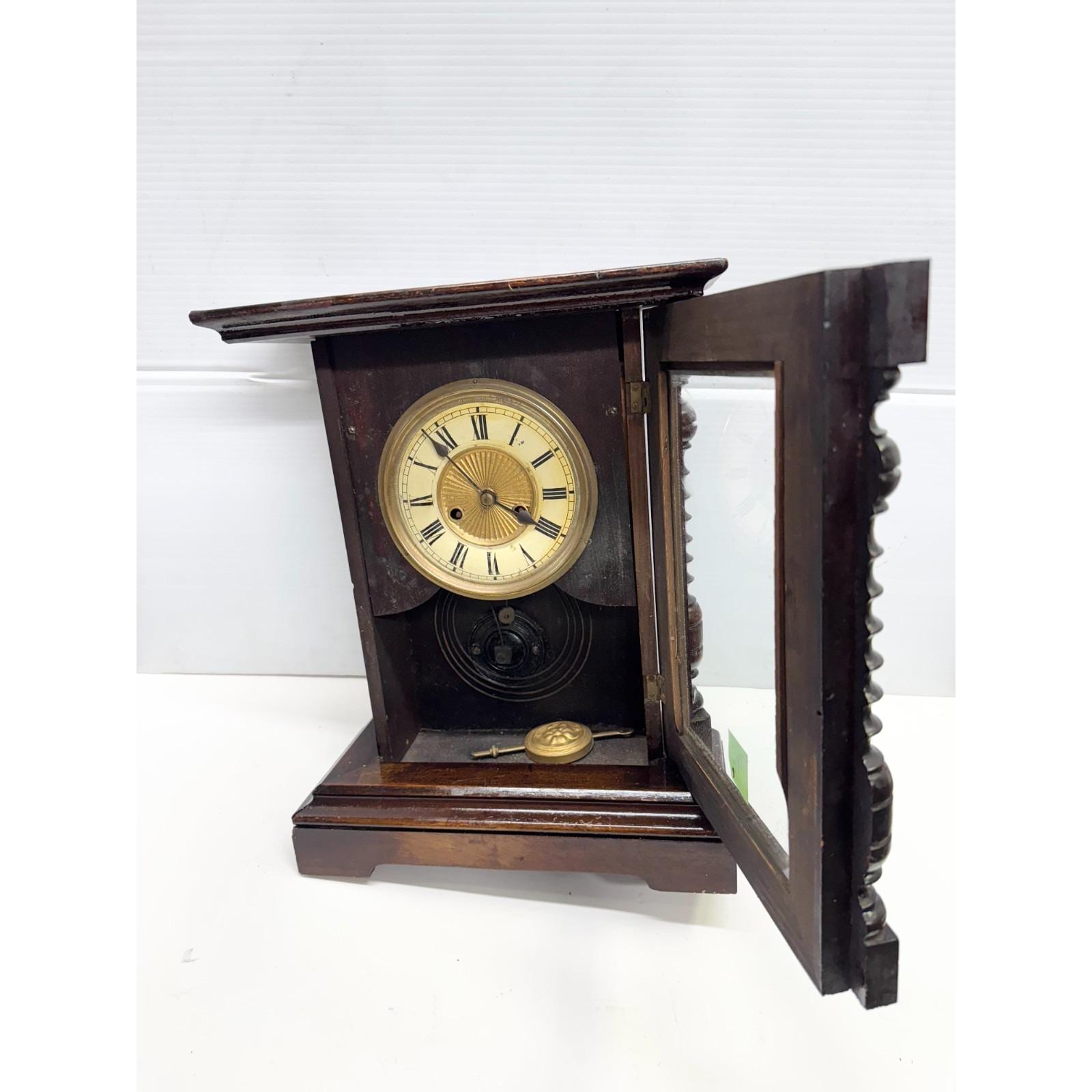 Glass door, one side of bottom is missing. Nice woodwork. Vintage mantle clock. Approx. 15 inches tall. 12 inches wide. Approx 5 inches depth. 6lbs