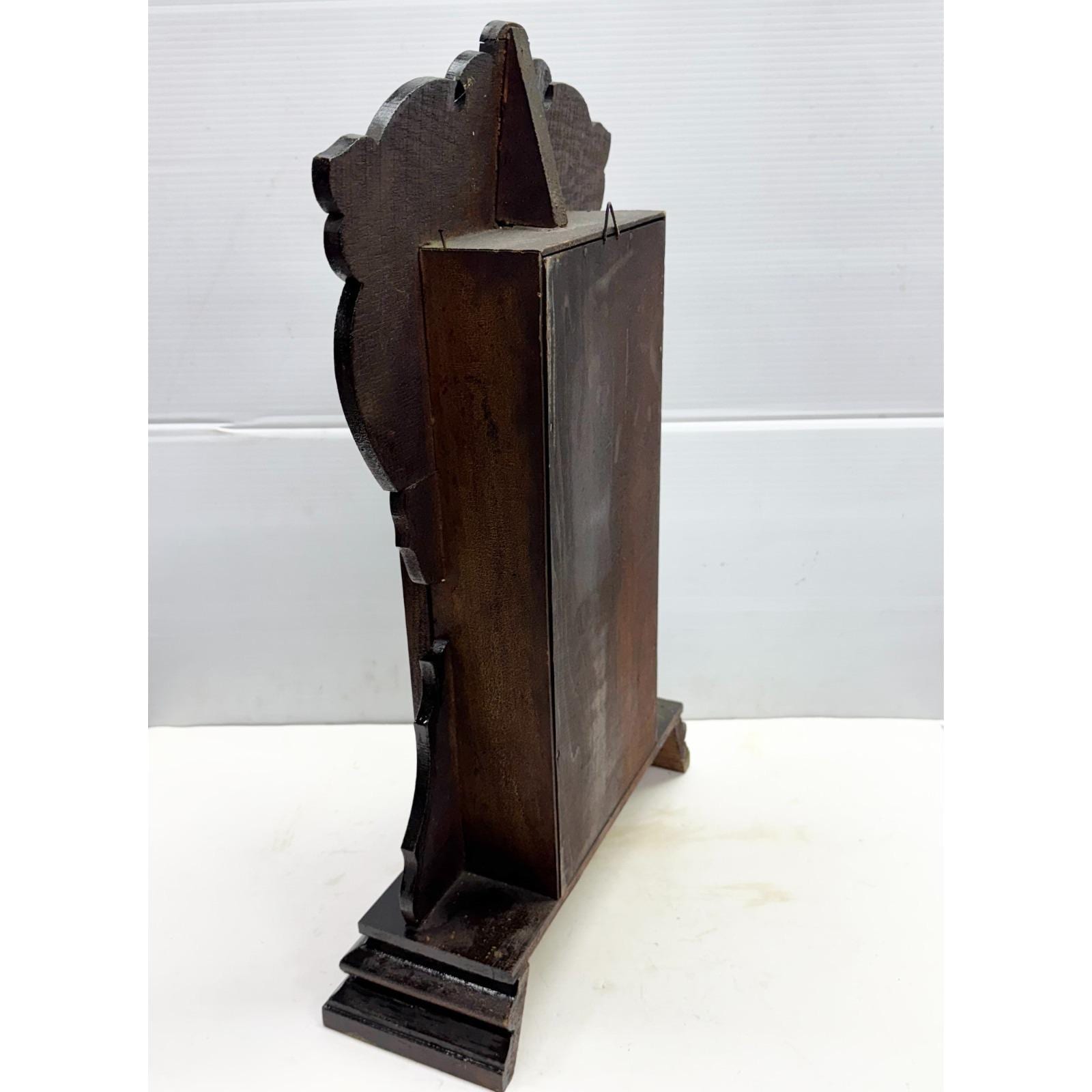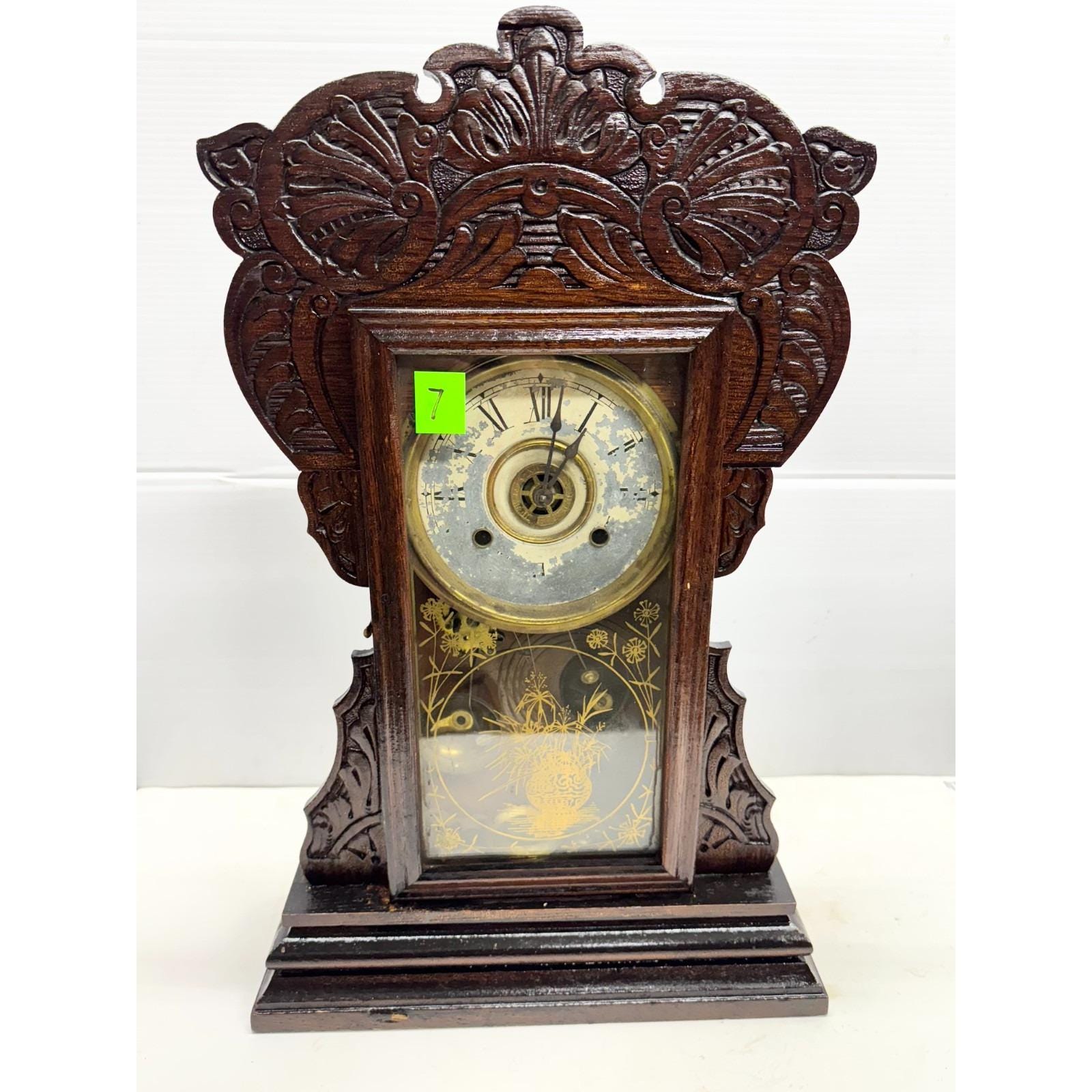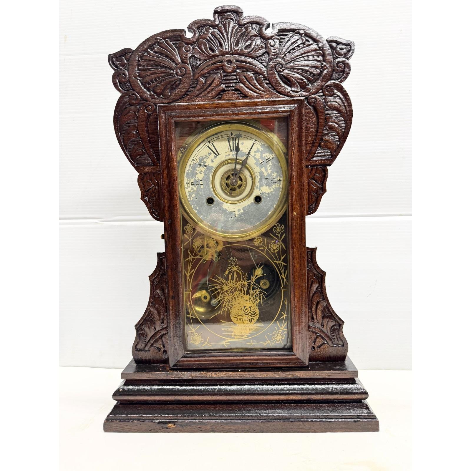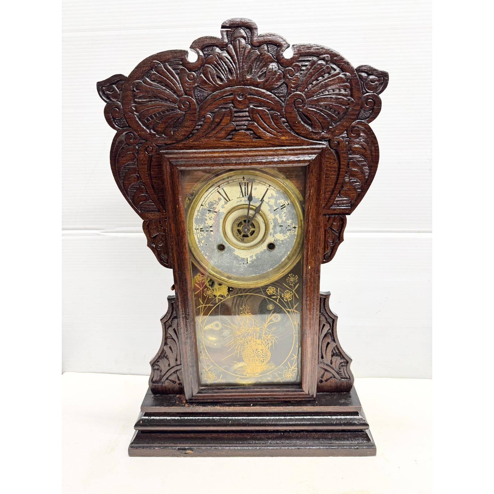 Wooden gingerbread mantle clock with glass door. Well made wood work. 22 inches tall by 14 inches wide. 5 inches depth. 8lbs.