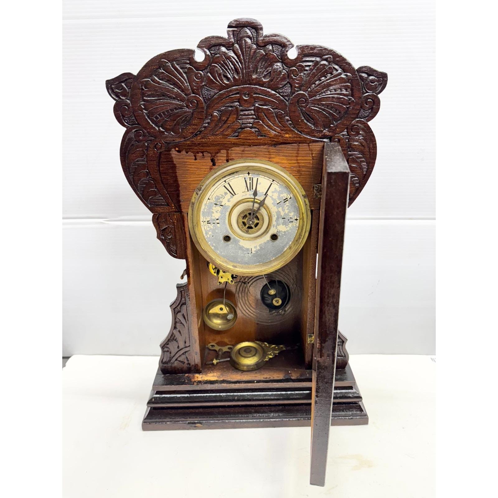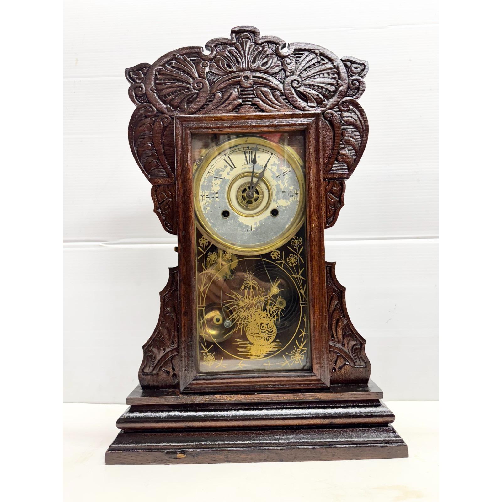 Vintage Antique Ornate Fumed Oak Wooden Gingerbread Mantle Clock