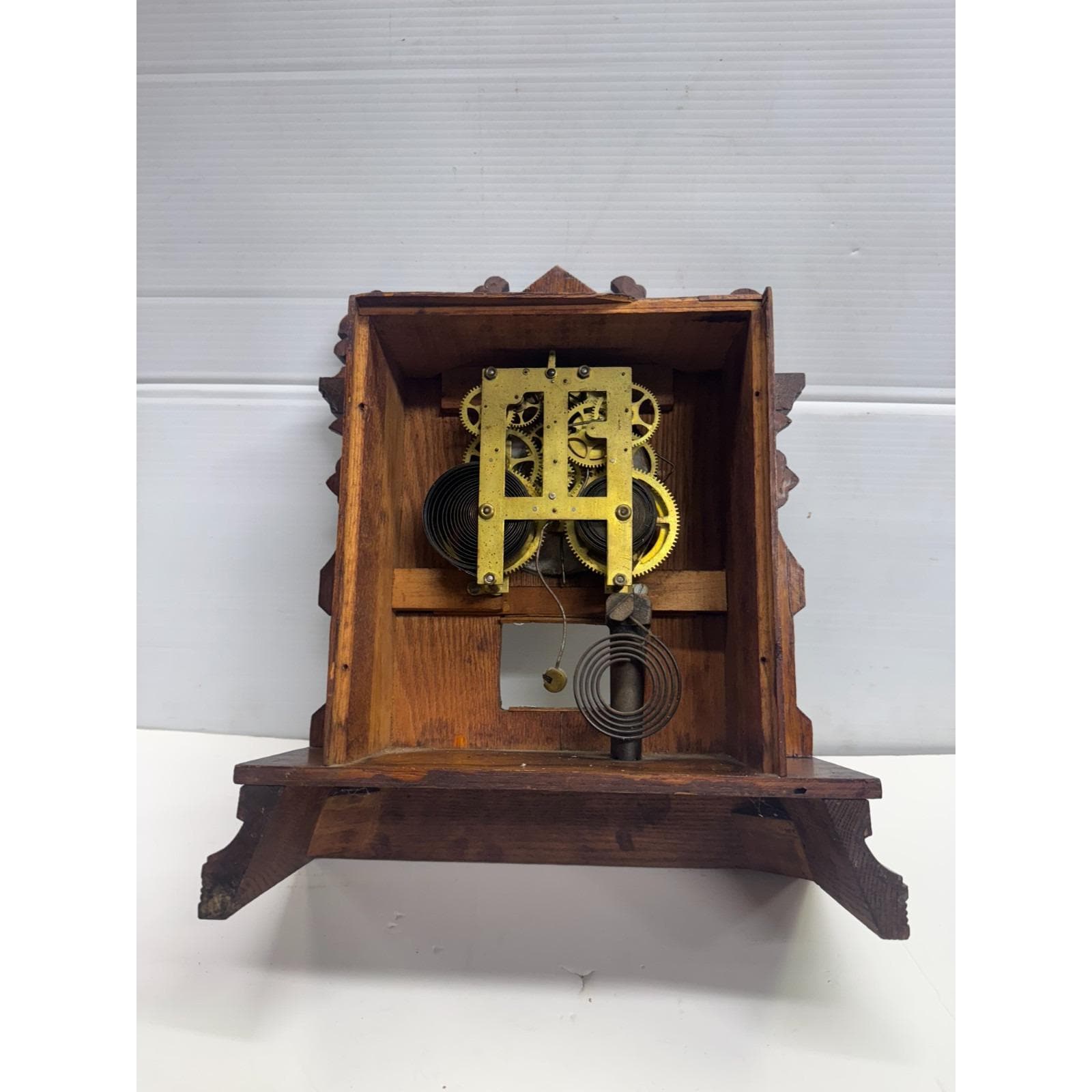 Glass case with a watch face under. Woodwork design. No wooden back. Porcelain clock face. Depth is approx. 6 inches. 16 inches tall by 13.5 inches wide. 9lbs