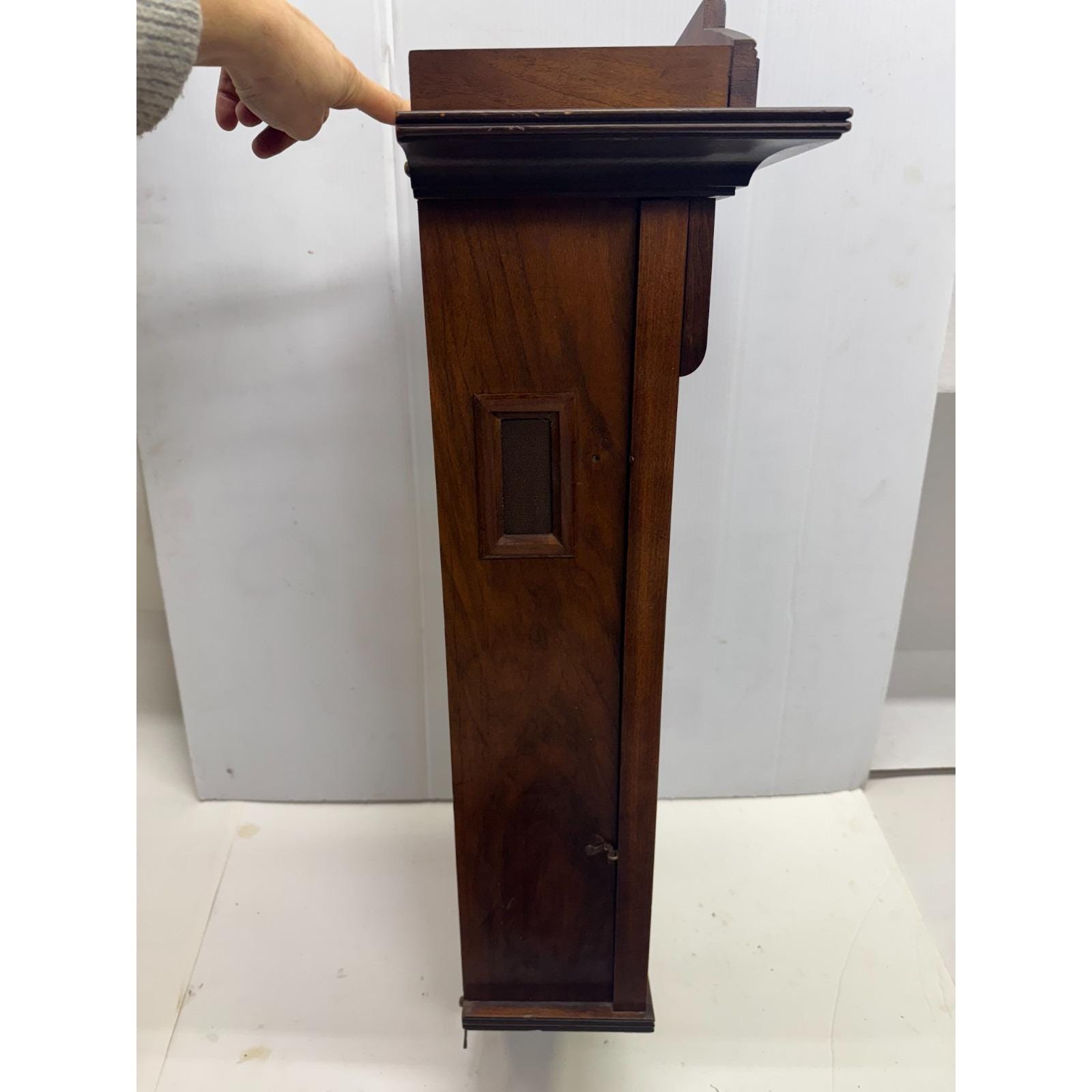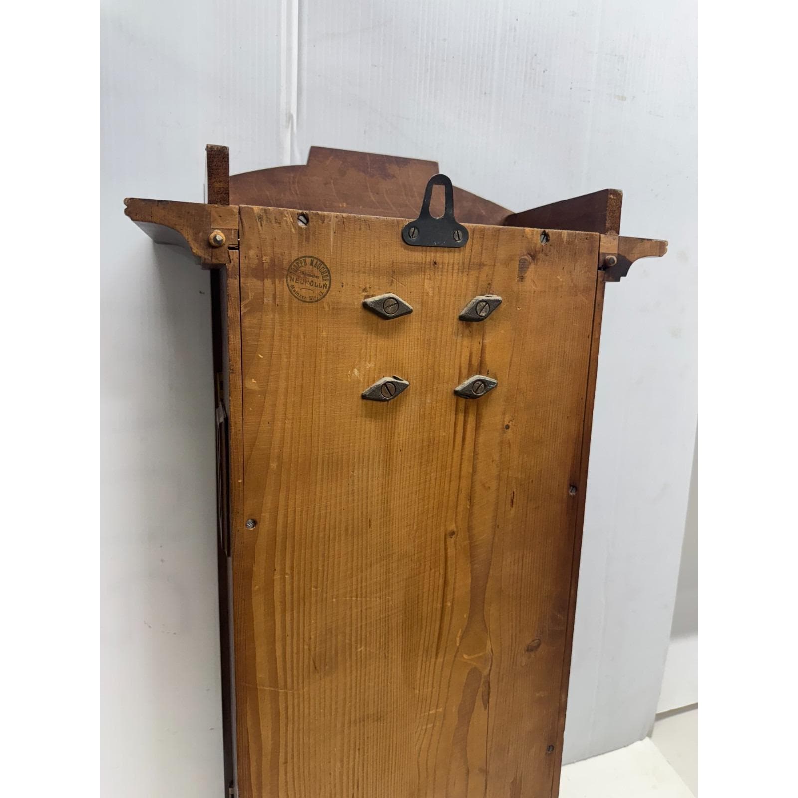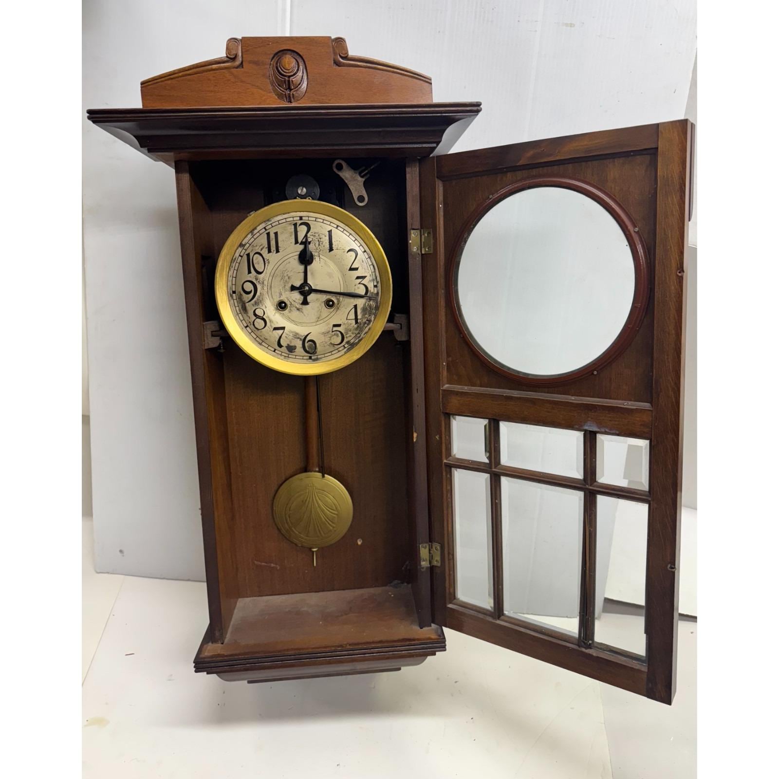 Beveled and mullioned glass door. Oak rectangular wood box with side latch for door. Hanging pendulum and key. Stamped on back Joseph Maucher Neurolln mainzer str. 13 uhrmacher. Well made. 31 inches tall by 15.5 inches wide. Depth is 8.5 inches at widest point. 20 lbs.