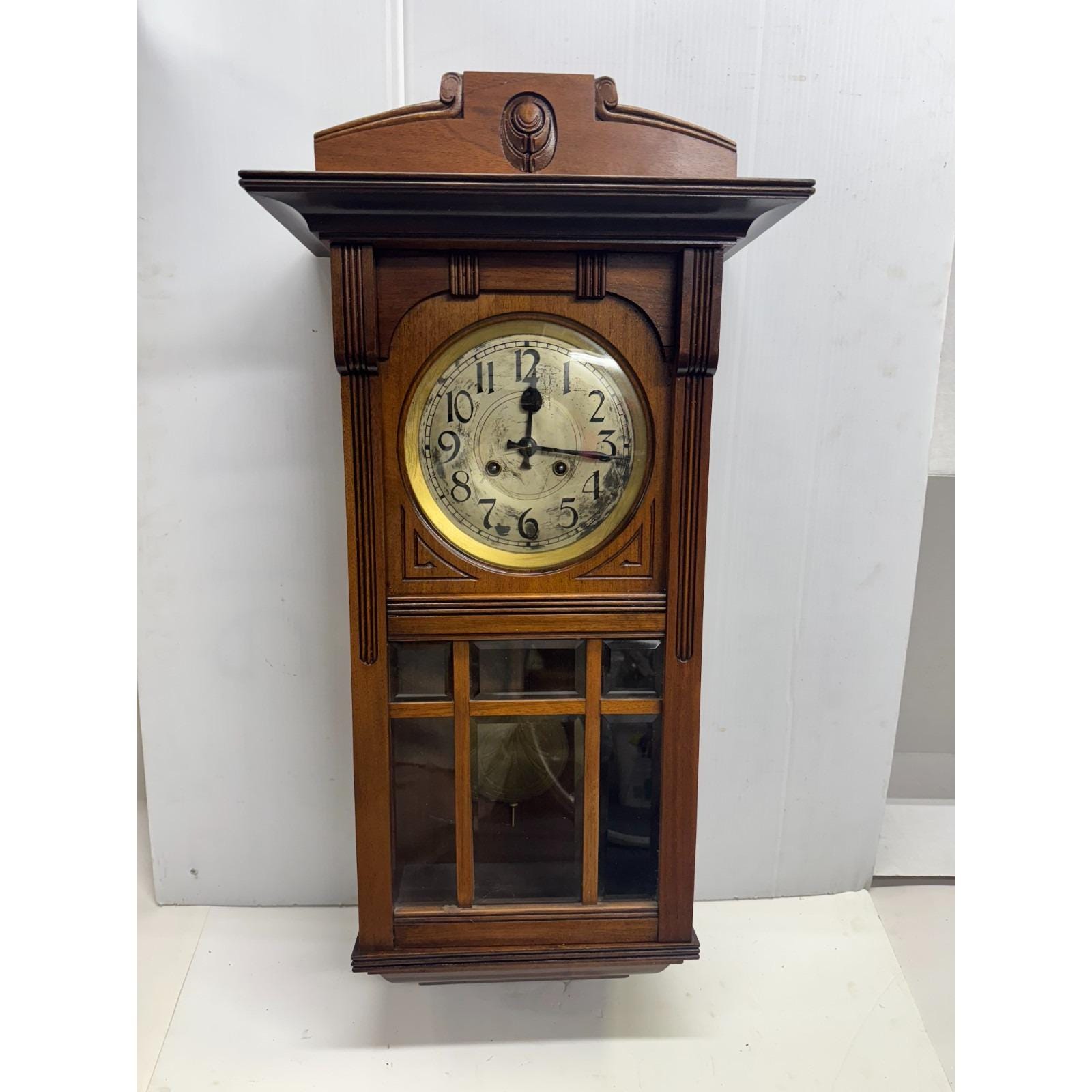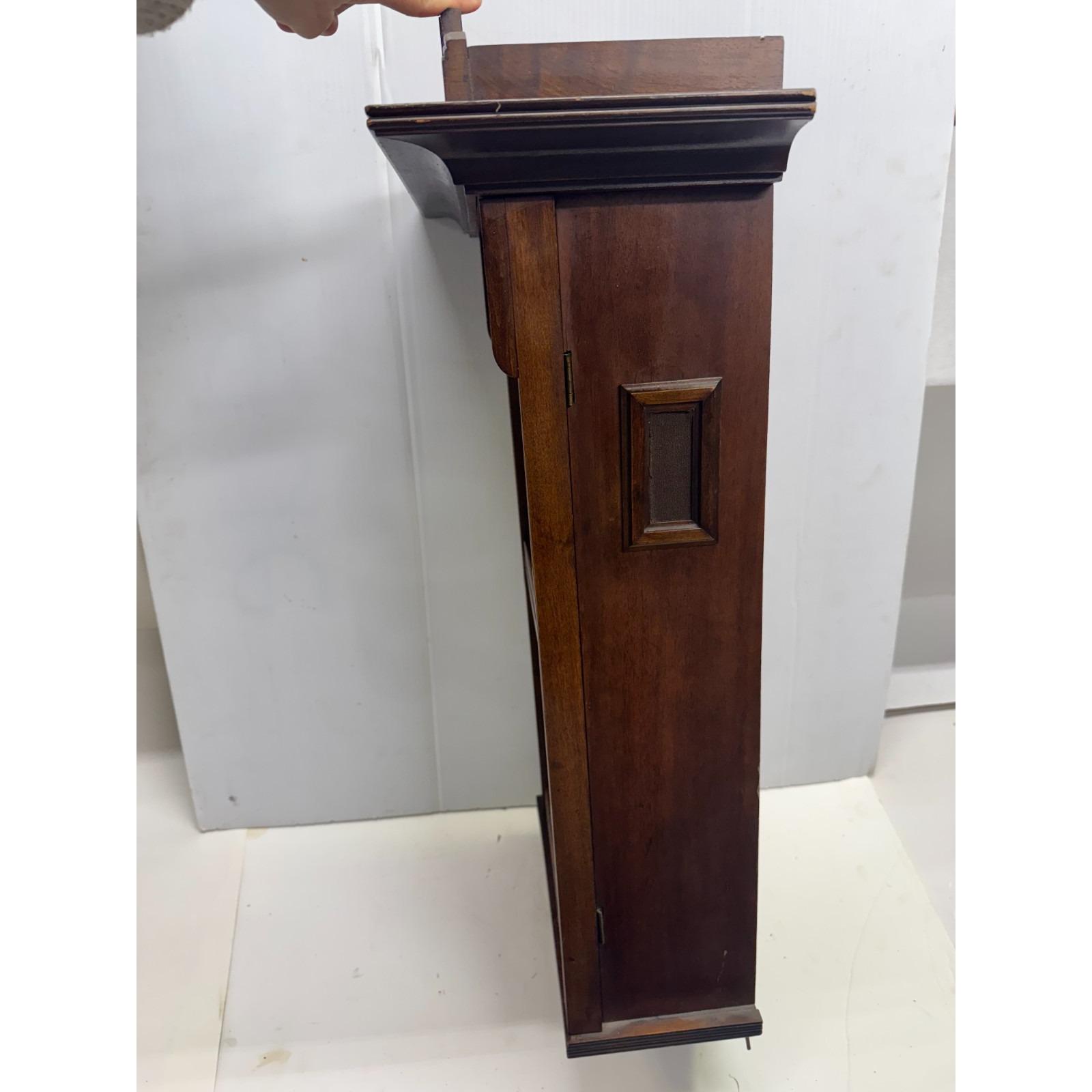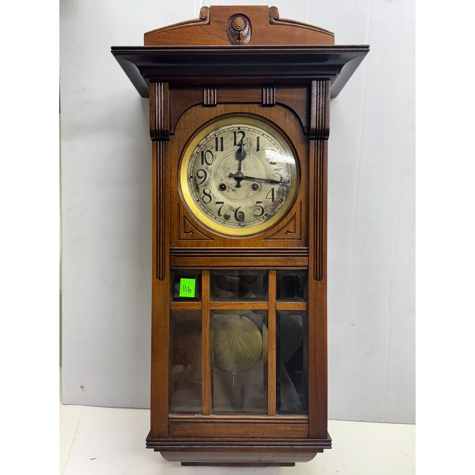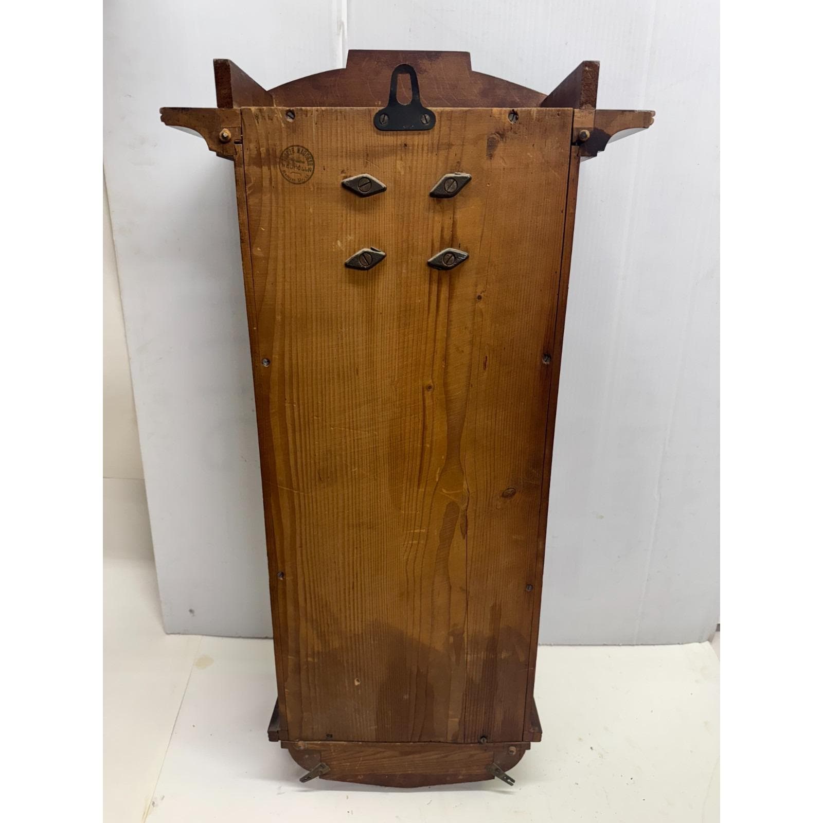 Beveled and mullioned glass door. Oak rectangular wood box with side latch for door. Hanging pendulum and key. Stamped on back Joseph Maucher Neurolln mainzer str. 13 uhrmacher. Well made. 31 inches tall by 15.5 inches wide. Depth is 8.5 inches at widest point. 20 lbs.