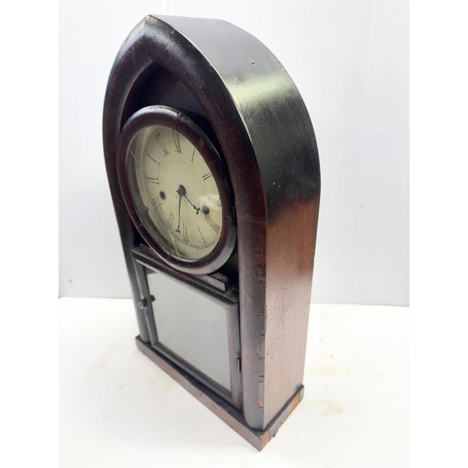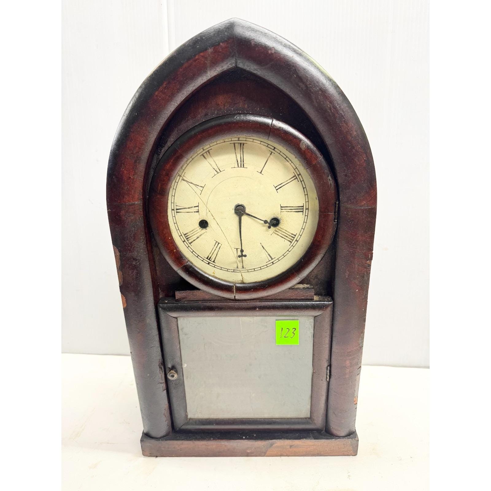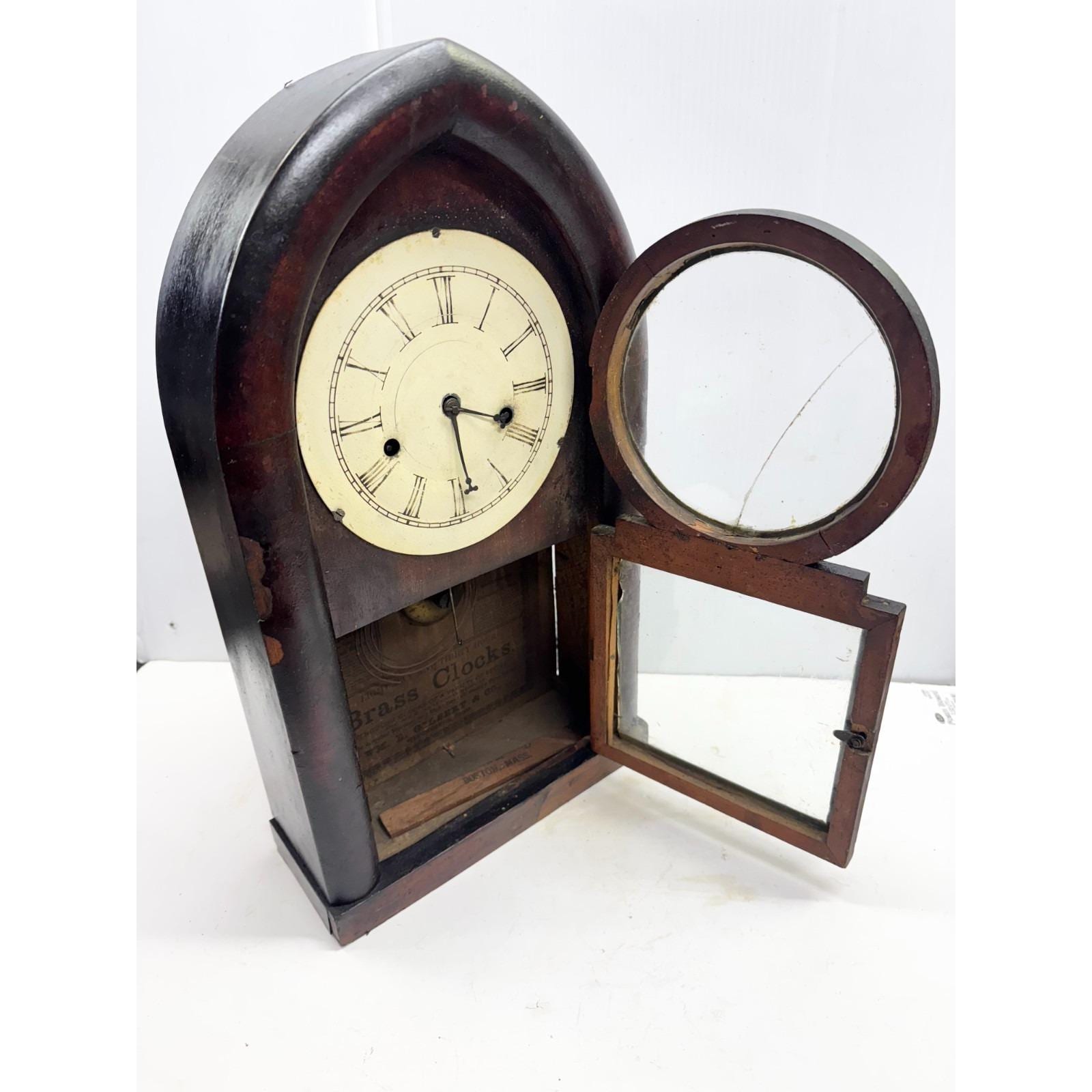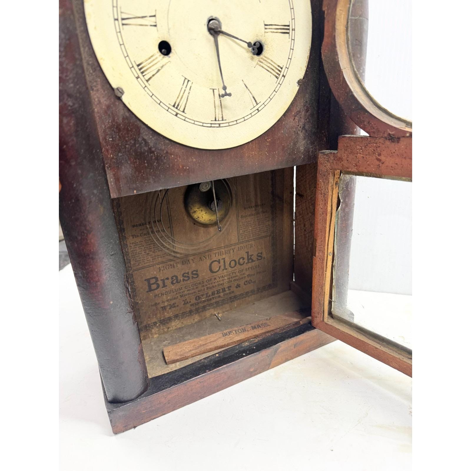 Antique mantle clock signed inside. Winchester Conn. glass door with twist latch. Top part of glass above clock face has a crack but is still together and completely secure. Missing a piece from top back. Approximately 19 inches tall, approximately 10 inches wide. Depth is 4 inches. 6 lbs.
