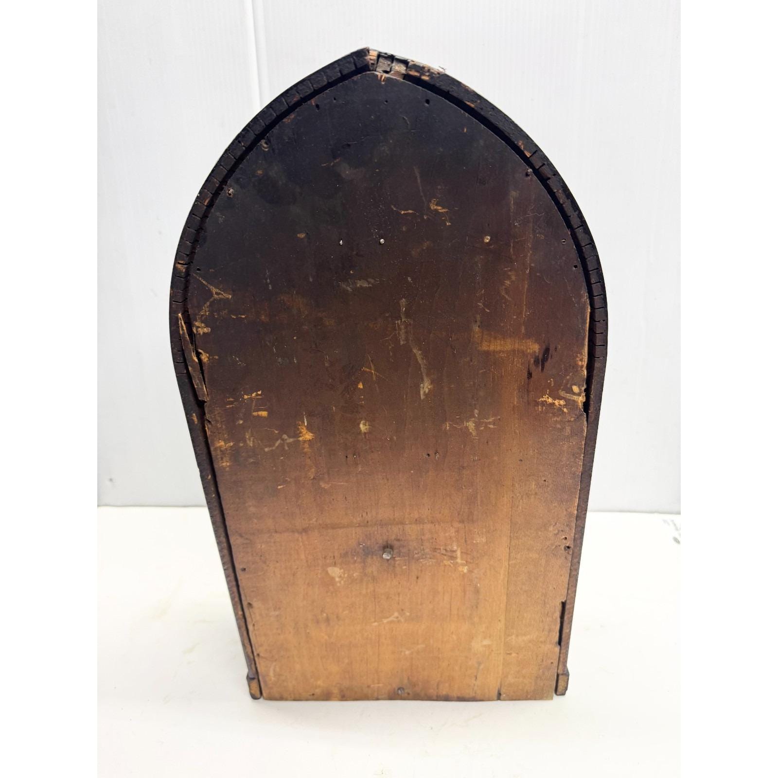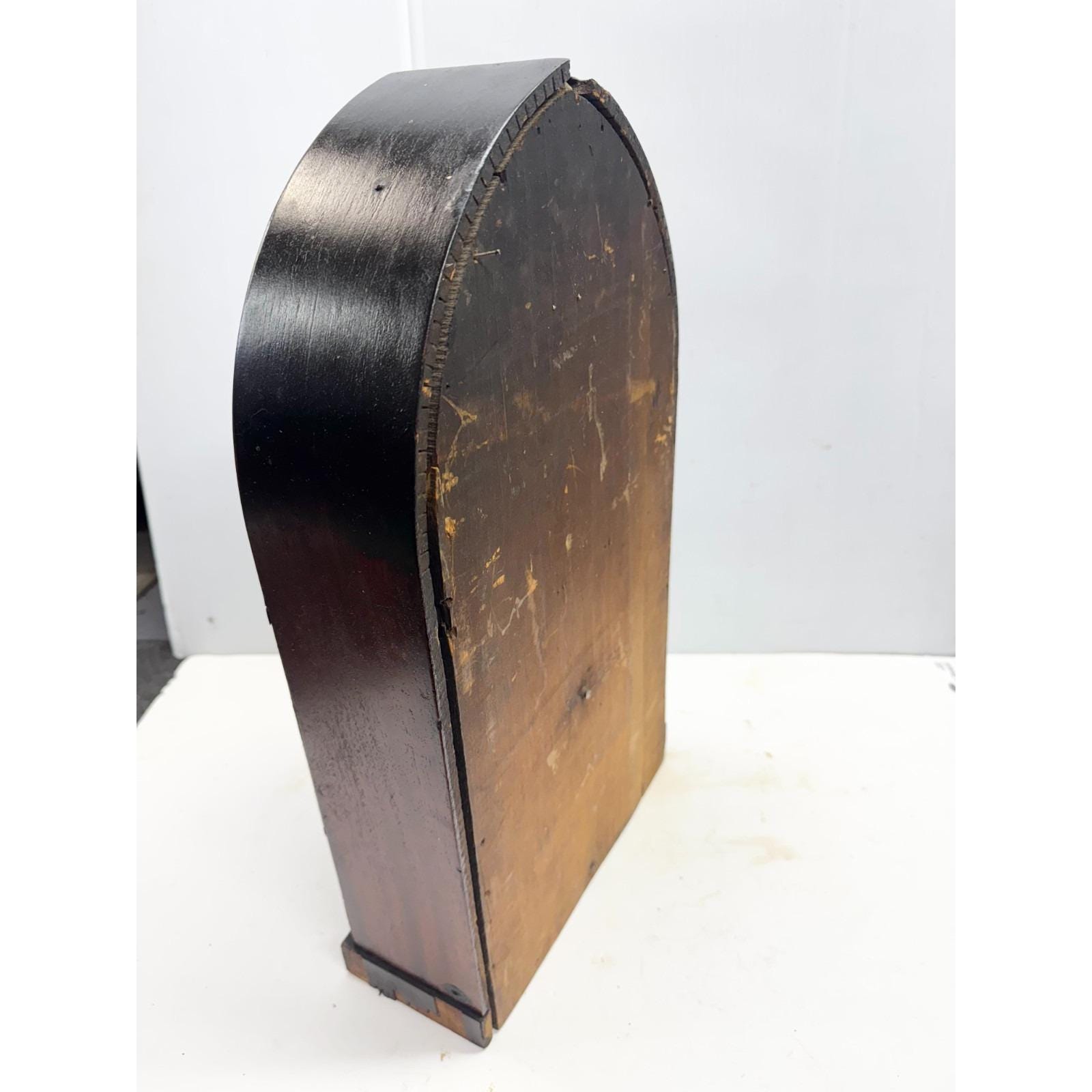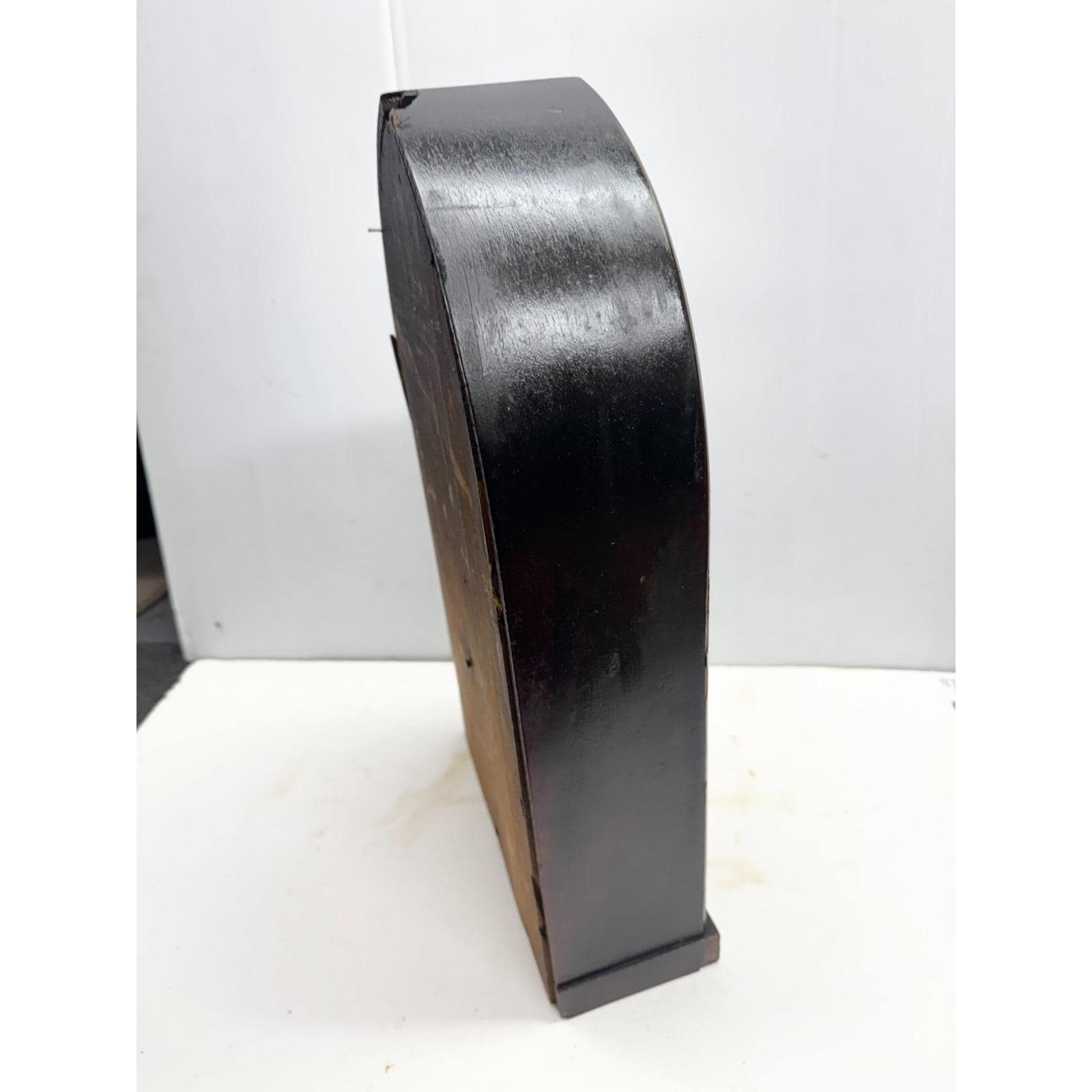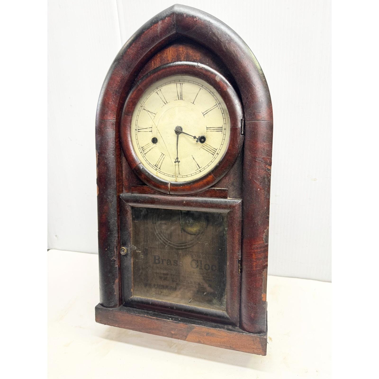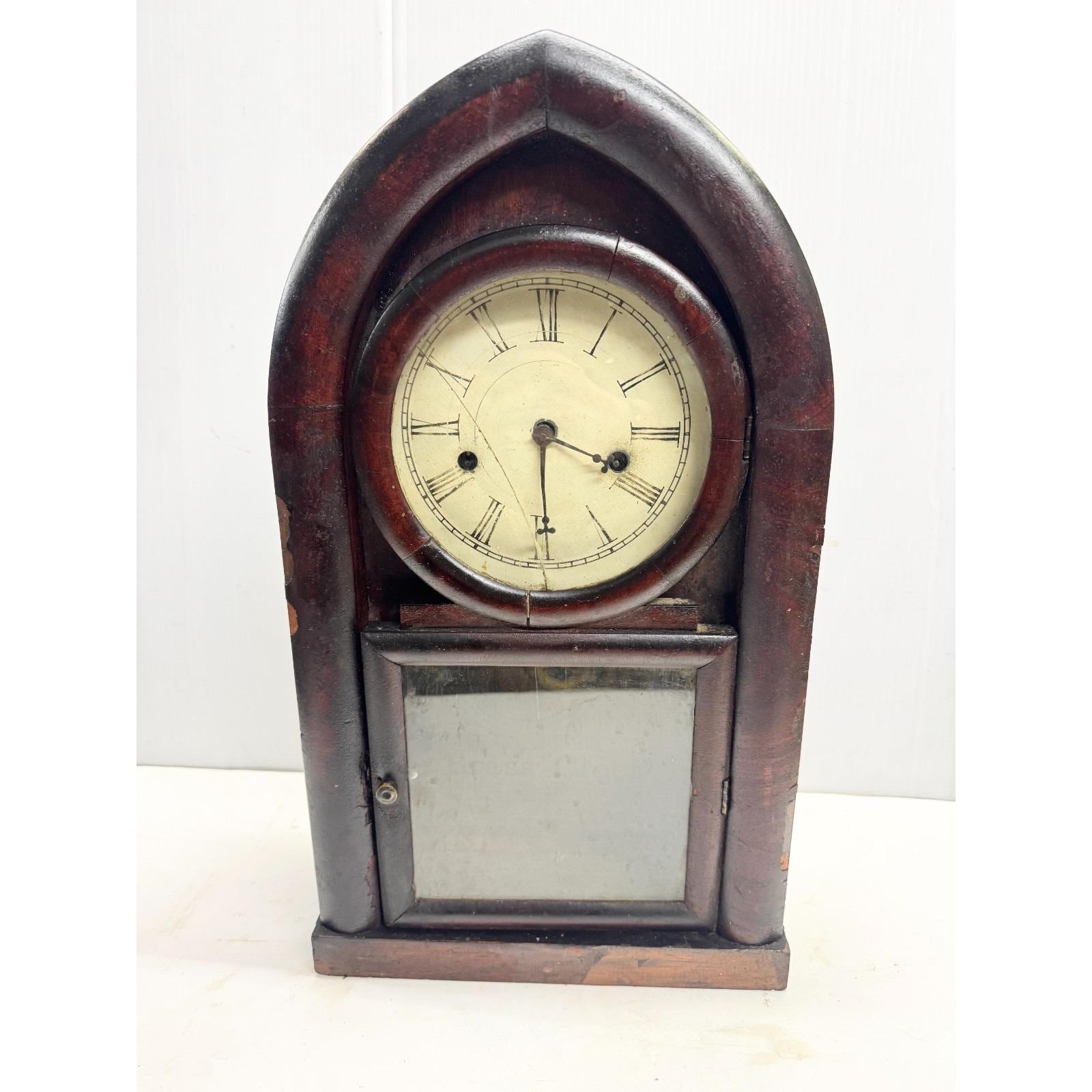Antique mantle clock signed inside. Winchester Conn. glass door with twist latch. Top part of glass above clock face has a crack but is still together and completely secure. Missing a piece from top back. Approximately 19 inches tall, approximately 10 inches wide. Depth is 4 inches. 6 lbs.