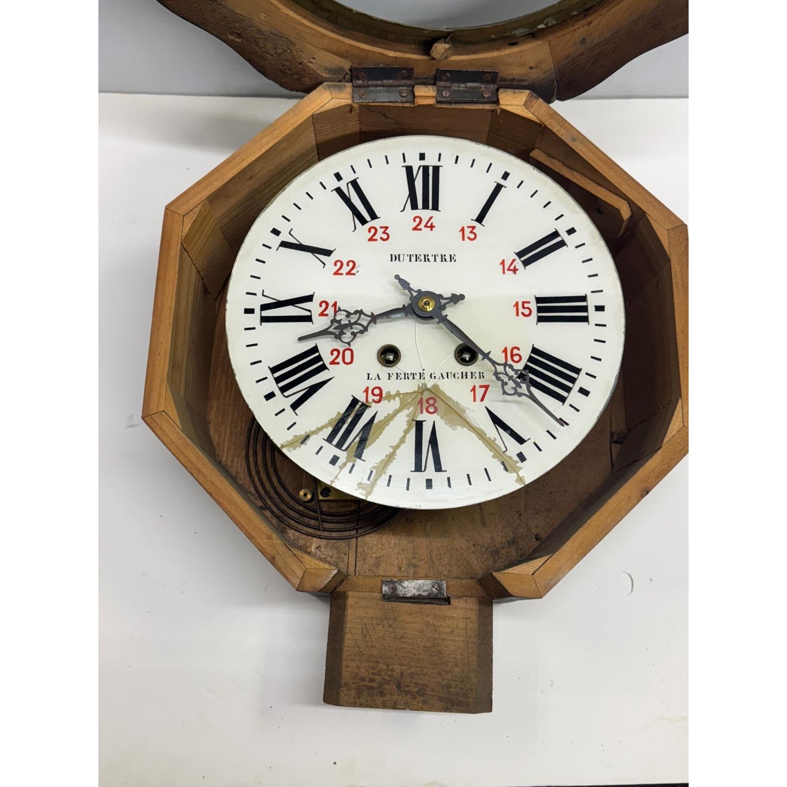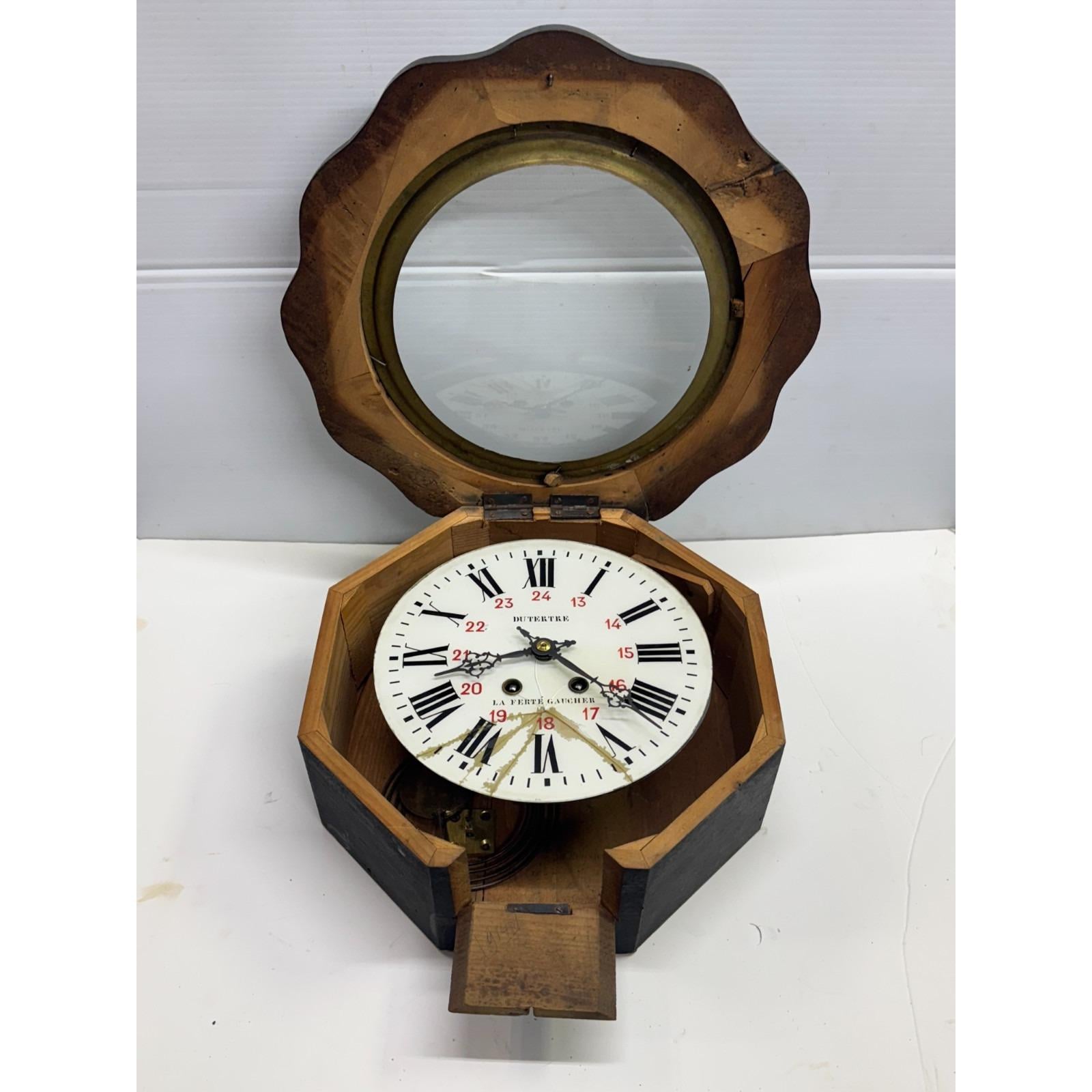 French wall clock. Signed Dutertre La Ferte Gaucher. Mother of pearl abalone Shell inlay. Rare shape. Has some cracks in glass on face. Cracked but together on wood. Beautiful wall clock. Roman numerals. 5.5 inches tall by 15.5 inches wide. 9 lbs.