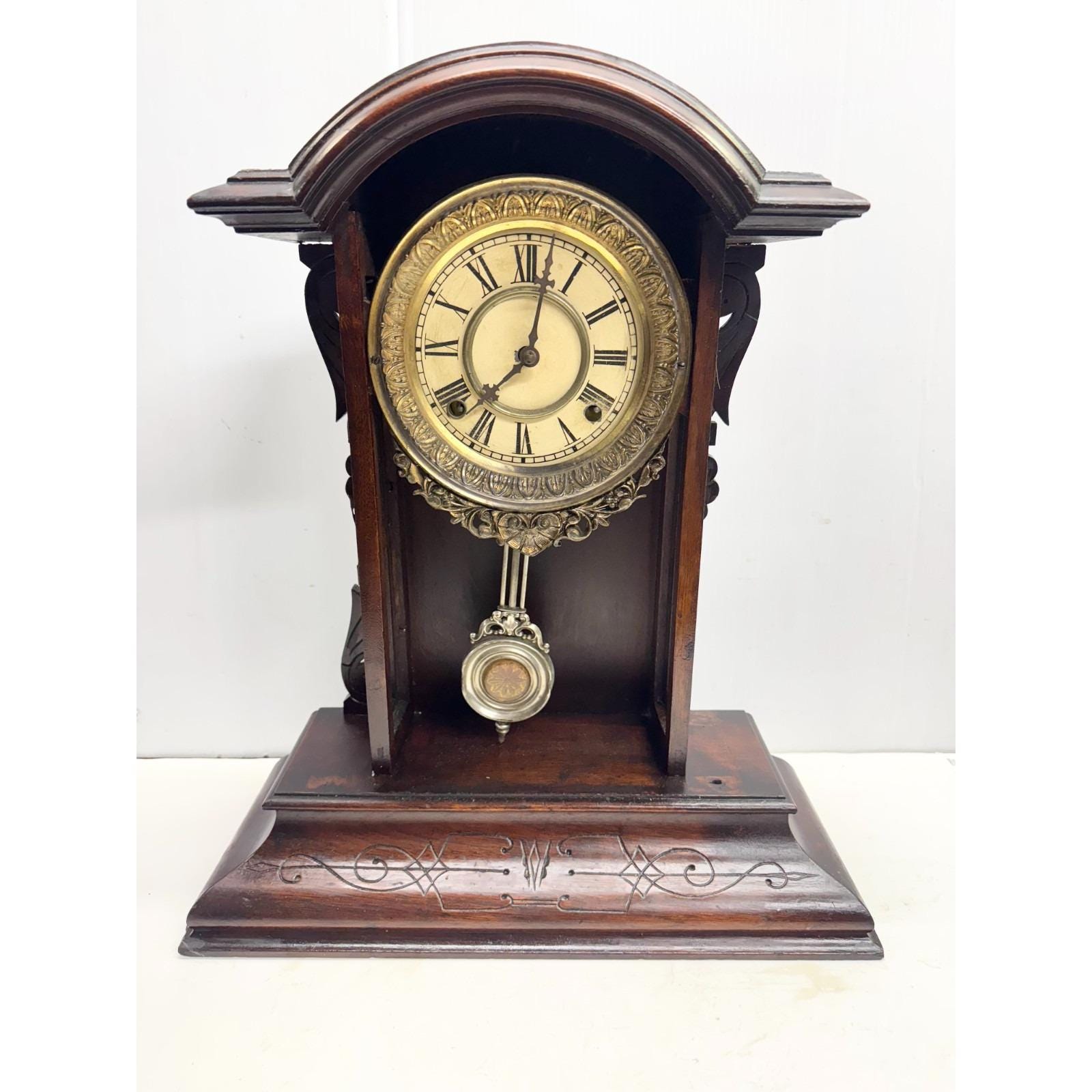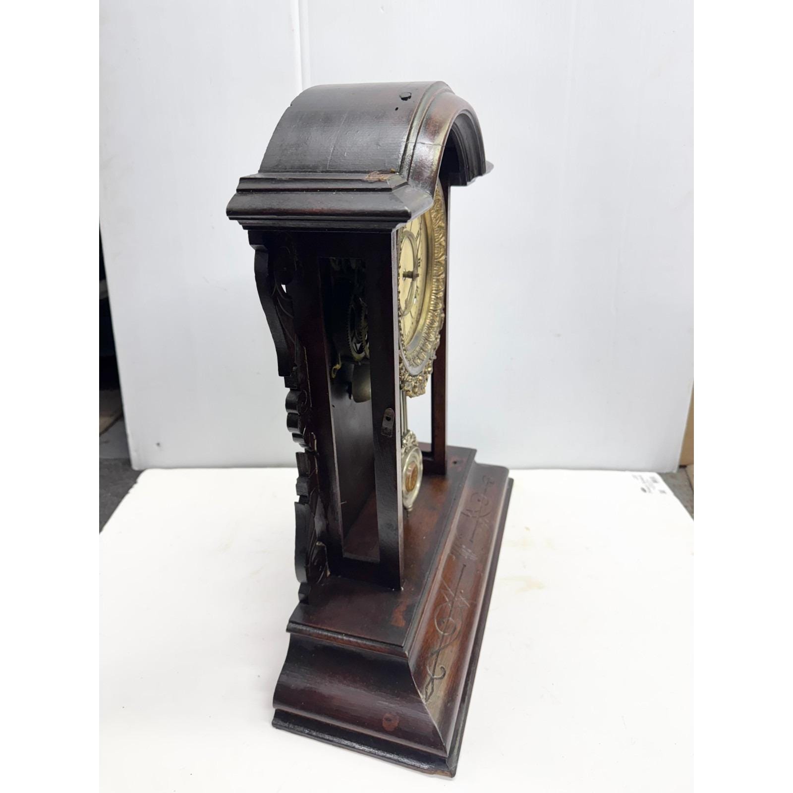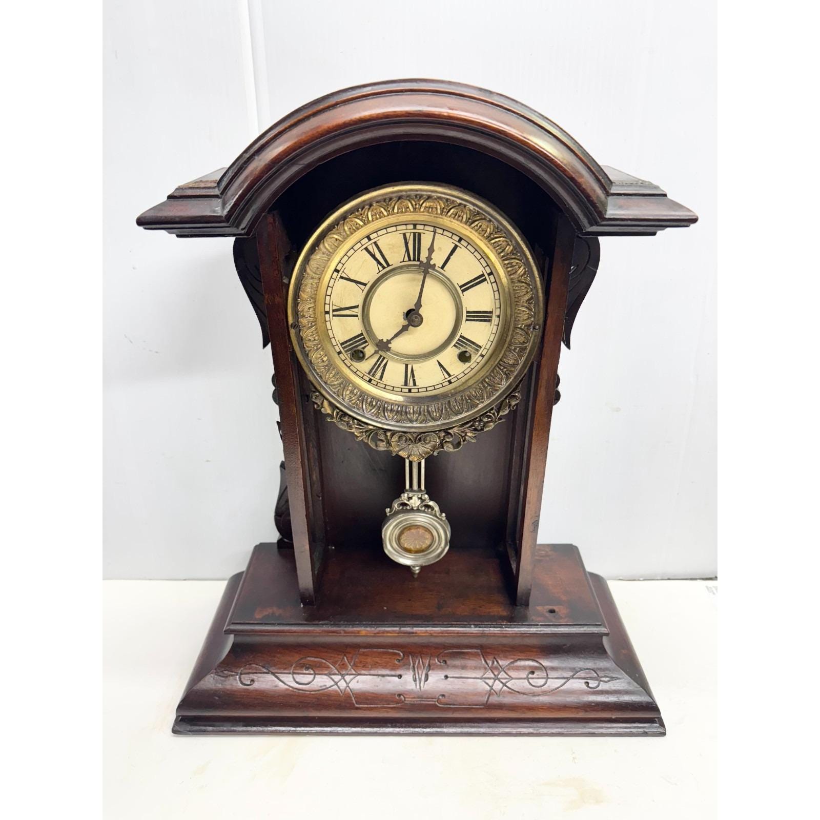 Hanging pendulum. Beautiful woodworking, design clock face with dials. Wood mantle parlor clock. 19.5 inches tall. 16.5 inches wide. Depth is approx 6 inches. 8 lbs.
