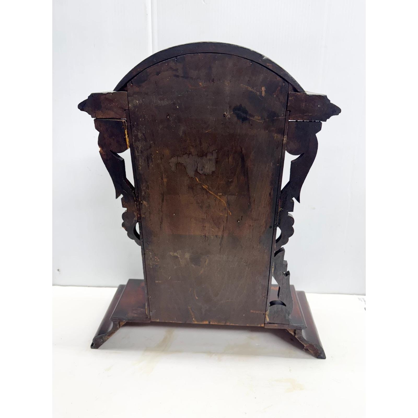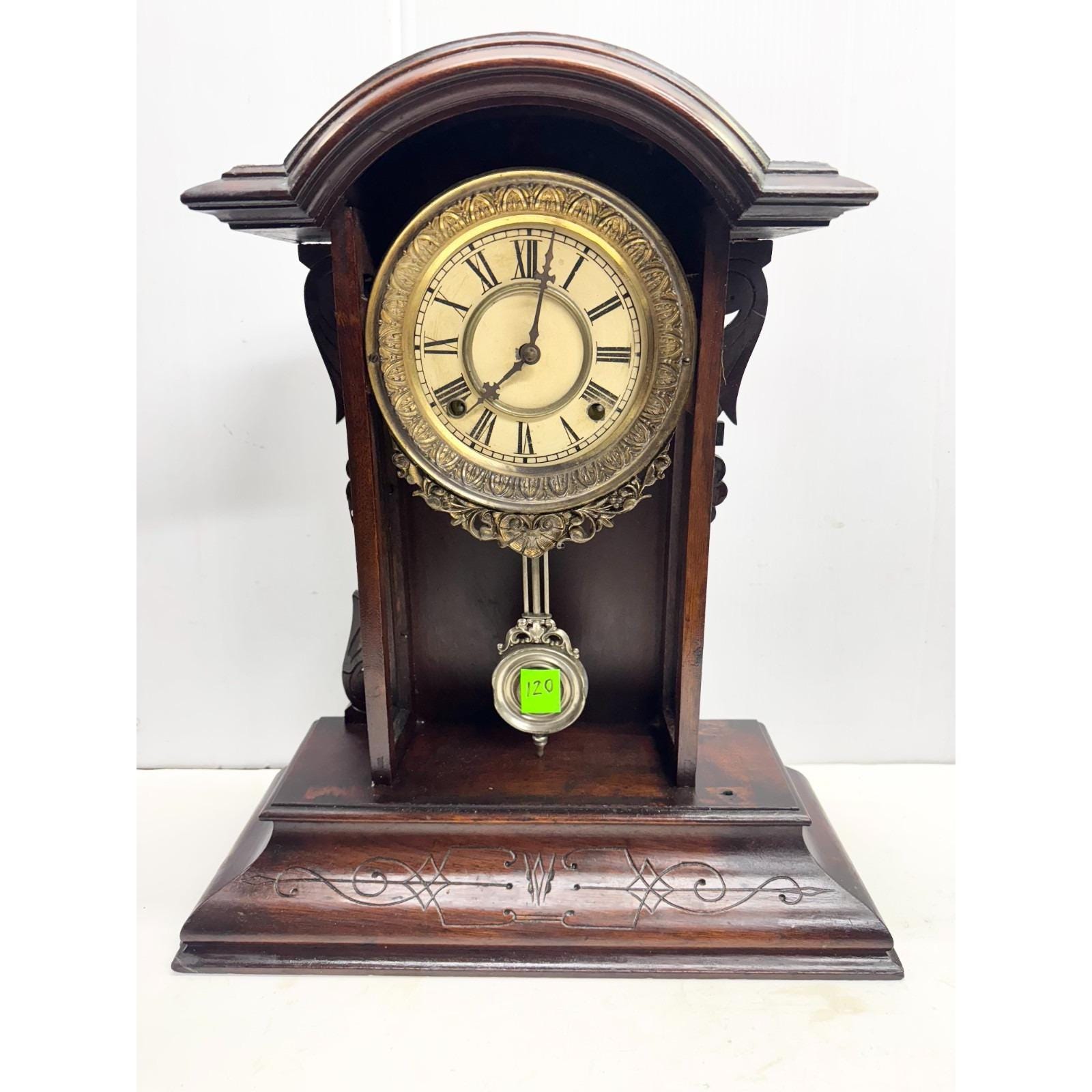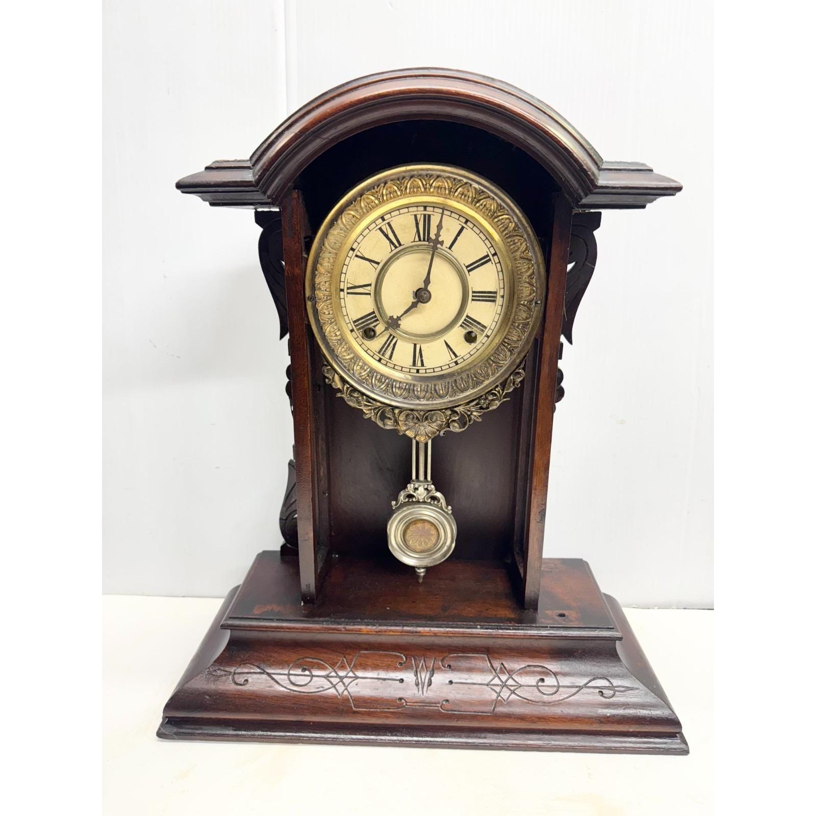Hanging pendulum. Beautiful woodworking, design clock face with dials. Wood mantle parlor clock. 19.5 inches tall. 16.5 inches wide. Depth is approx 6 inches. 8 lbs.