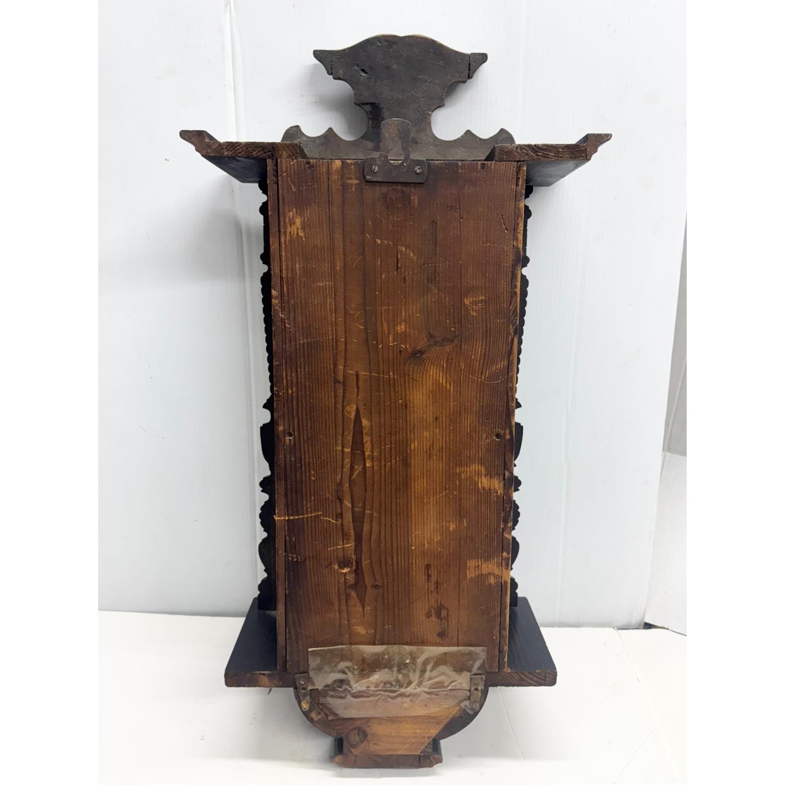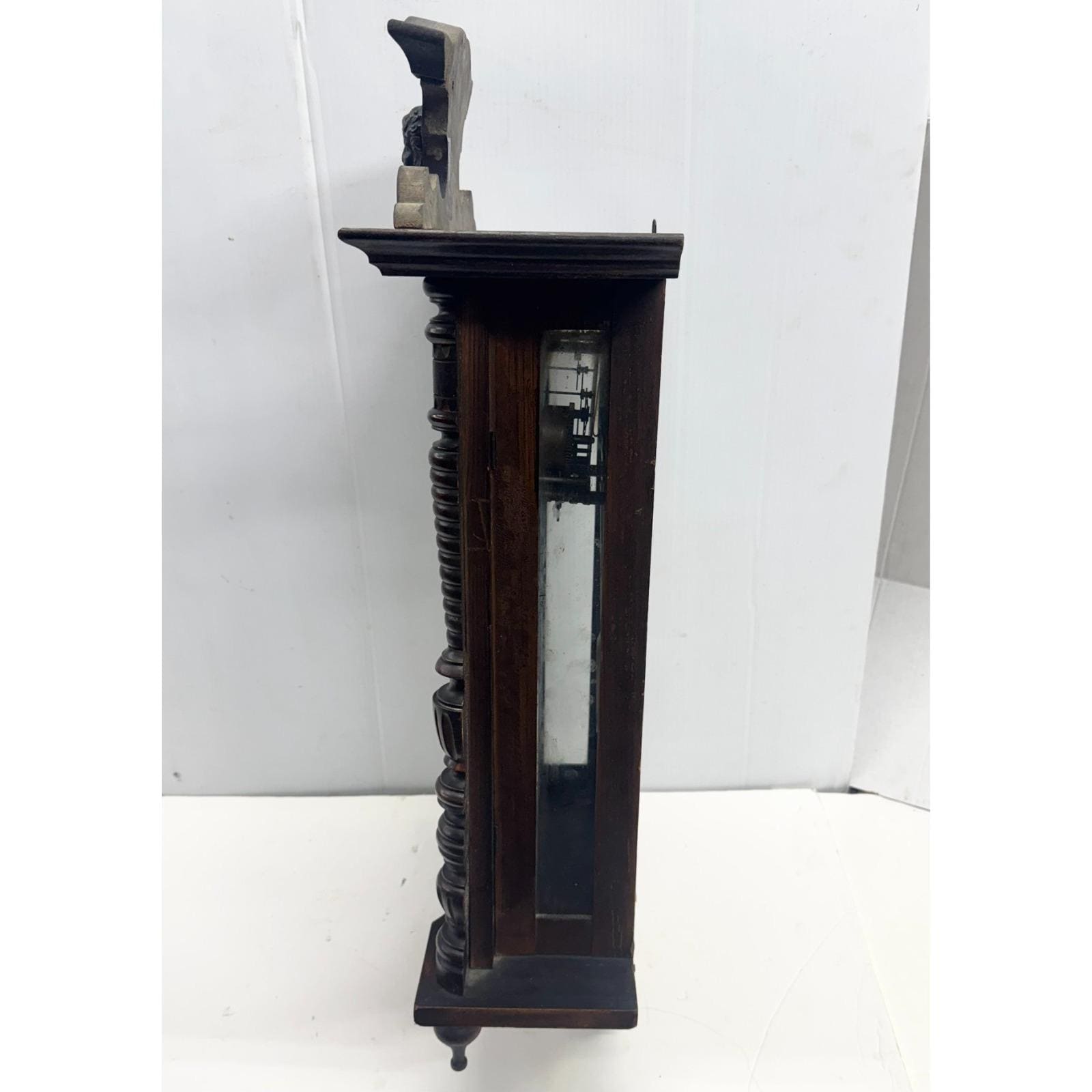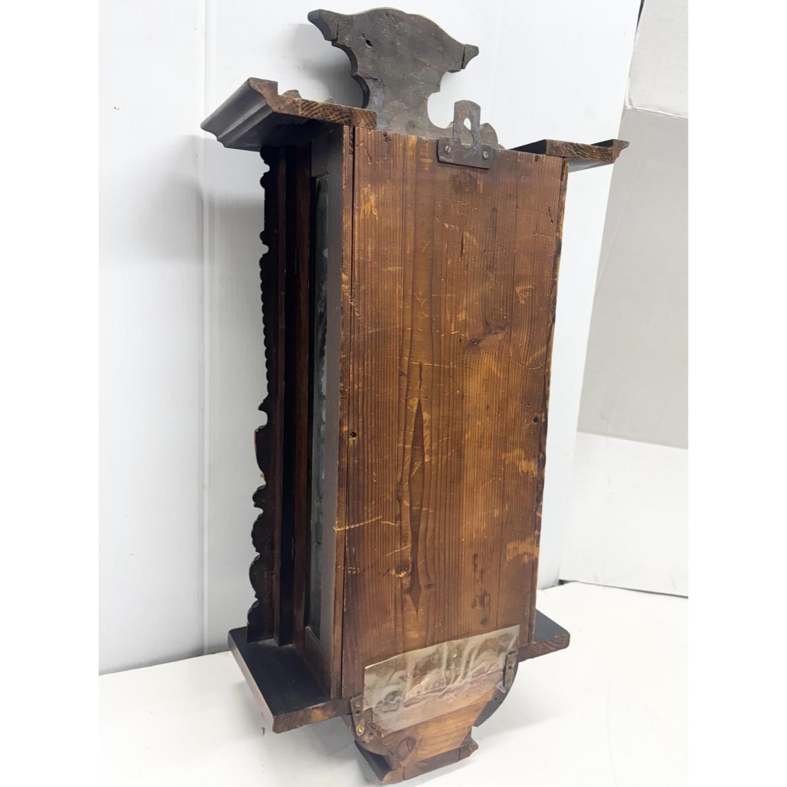 Antique wooden clock with glass door and side panels. Pendulum hanging, key at bottom. Art nouveau face on top. Beautiful woodworking. Hinged door with latch. Well made. Approx 31 inches long. Approx 15.5 inches at widest point. 7.5 inches depth at highest point. Signed C B inside. 13 lbs.