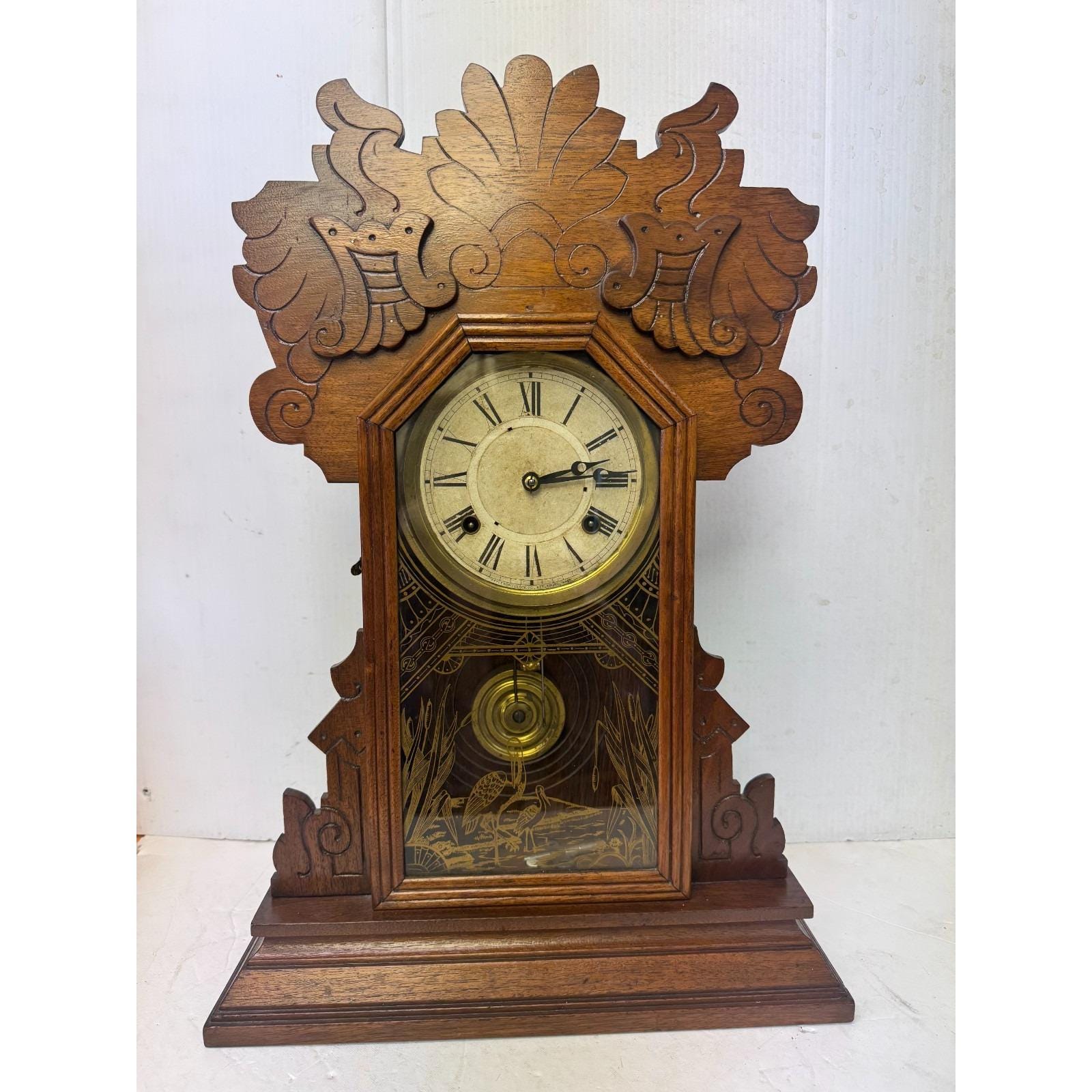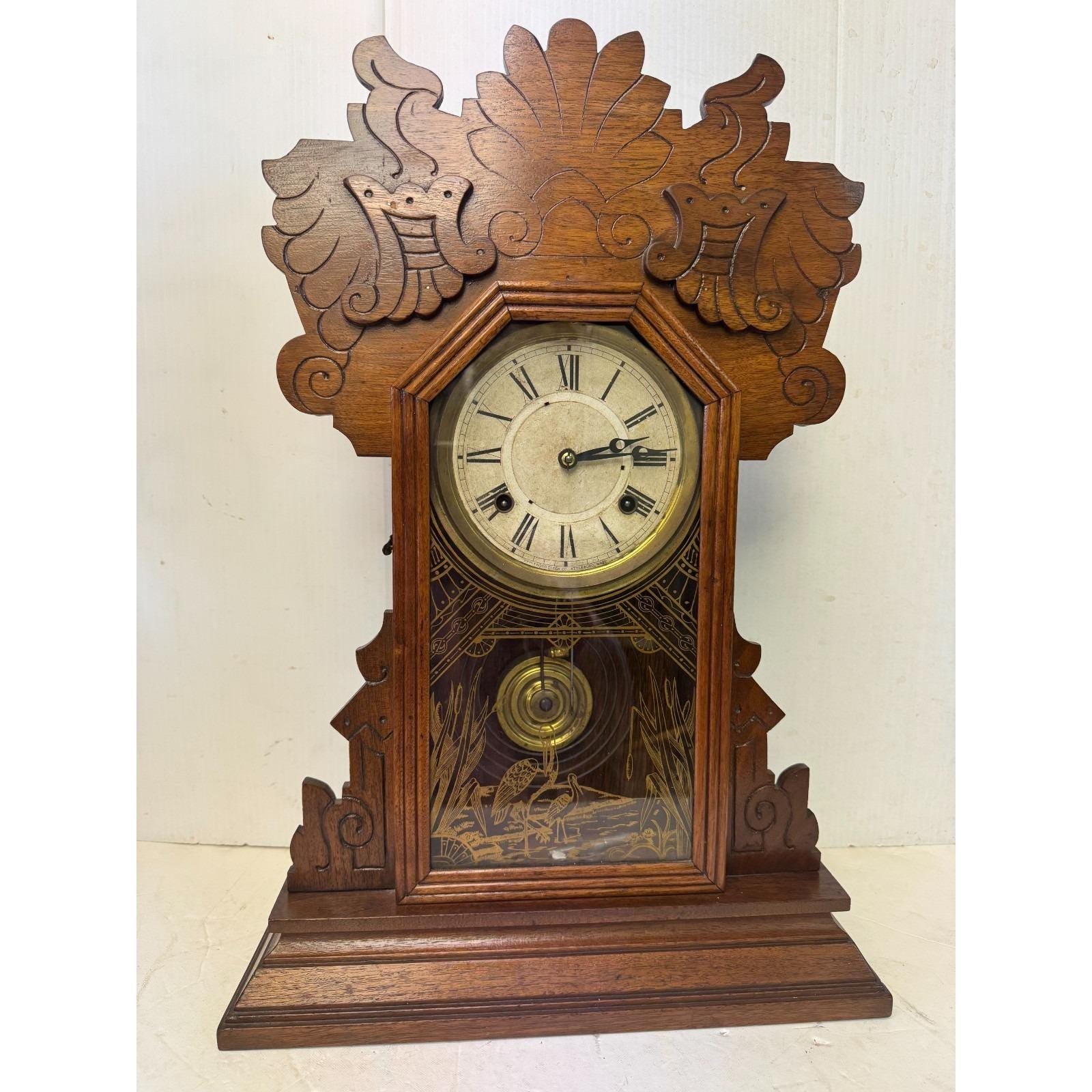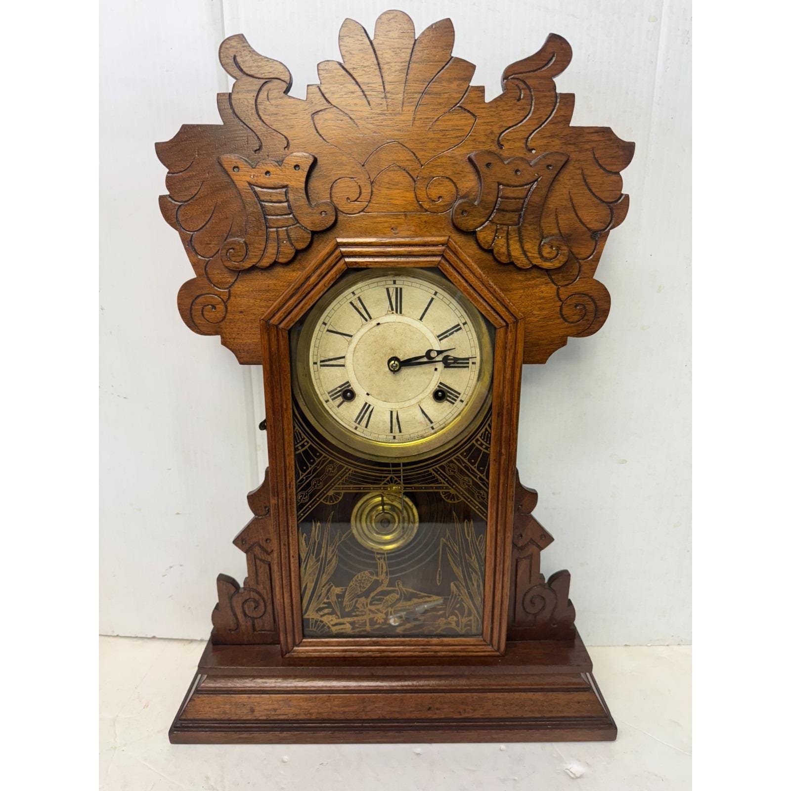 Clock Signed on back Waterbury clock co. Clock face is signed Attleboro Clock Co. Attleboro Mass. Beautiful artwork on glass with birds in water, nature scene and very nice design. Latch on side for glass door. Has key and pendulum inside. Beautiful wood working. 22 inches tall, 15 inches wide depth is 4.5 inches. 8 lbs.