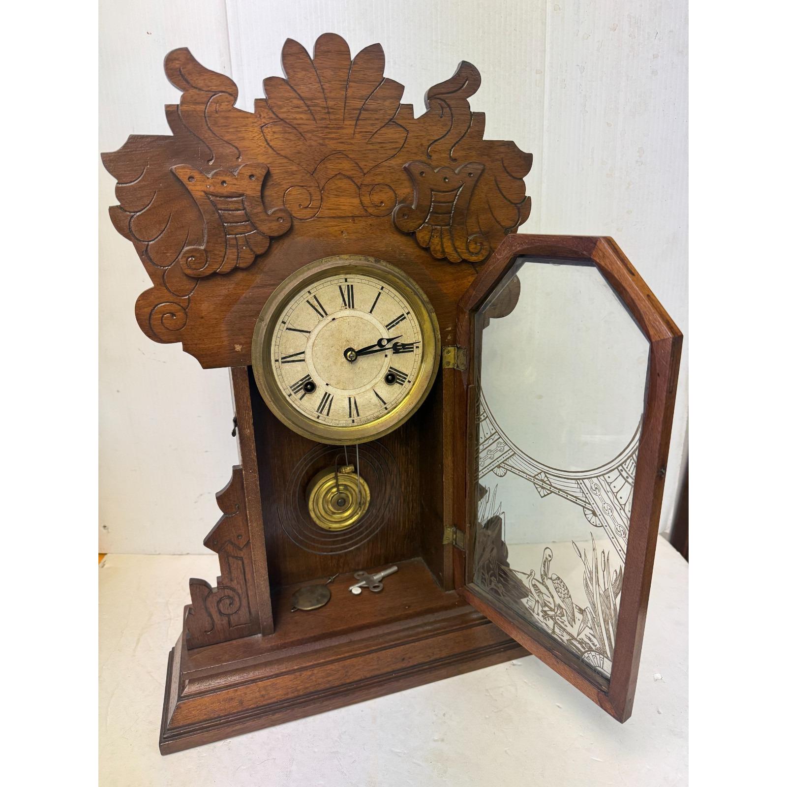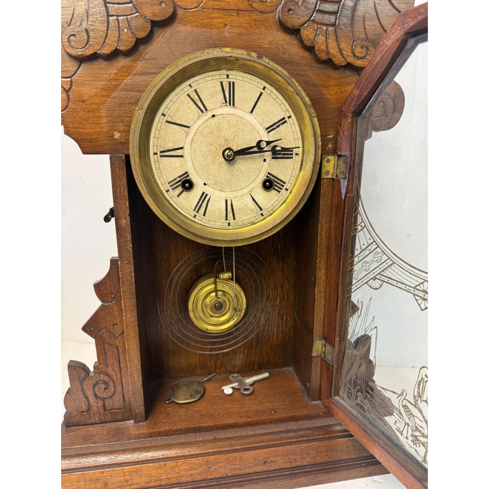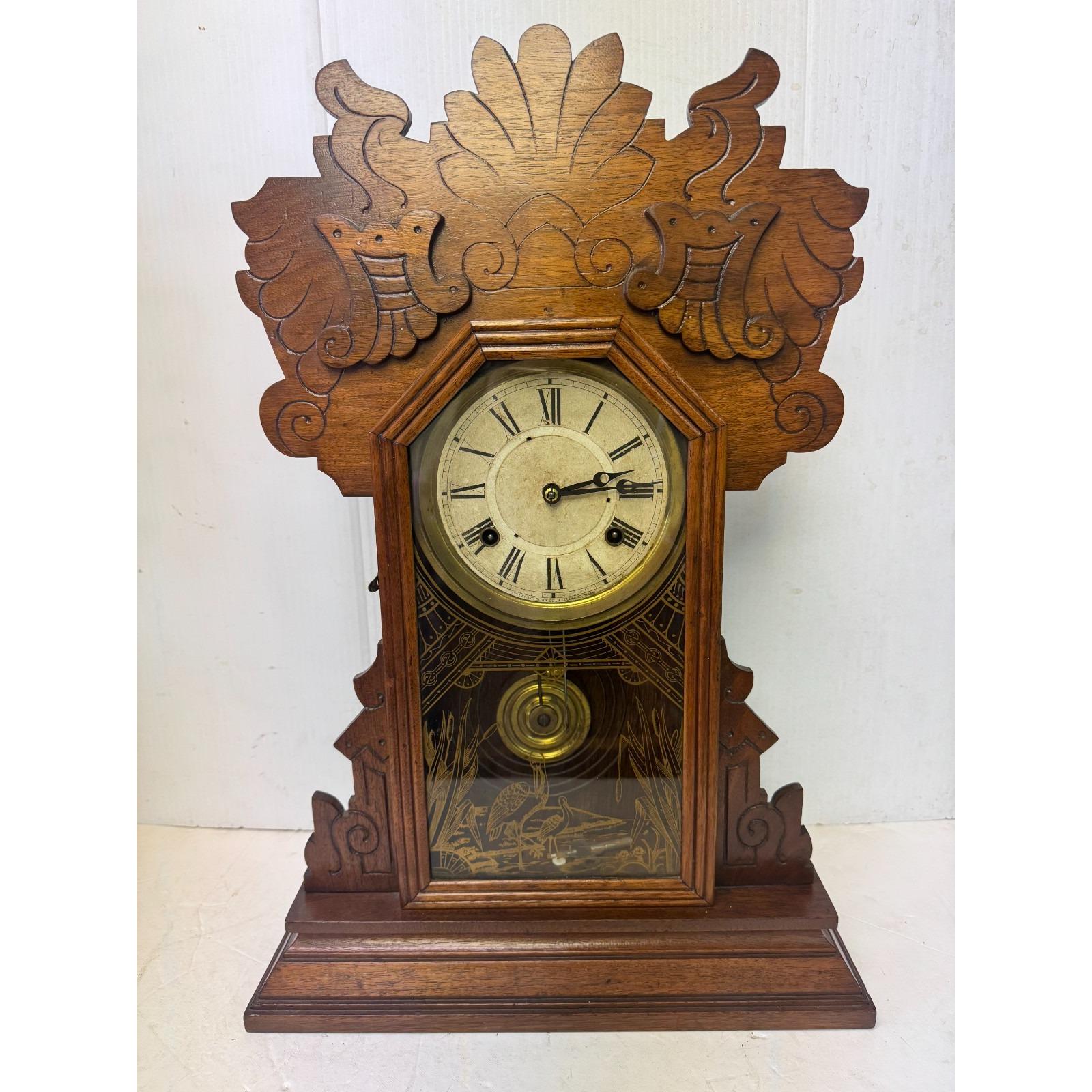 Clock Signed on back Waterbury clock co. Clock face is signed Attleboro Clock Co. Attleboro Mass. Beautiful artwork on glass with birds in water, nature scene and very nice design. Latch on side for glass door. Has key and pendulum inside. Beautiful wood working. 22 inches tall, 15 inches wide depth is 4.5 inches. 8 lbs.