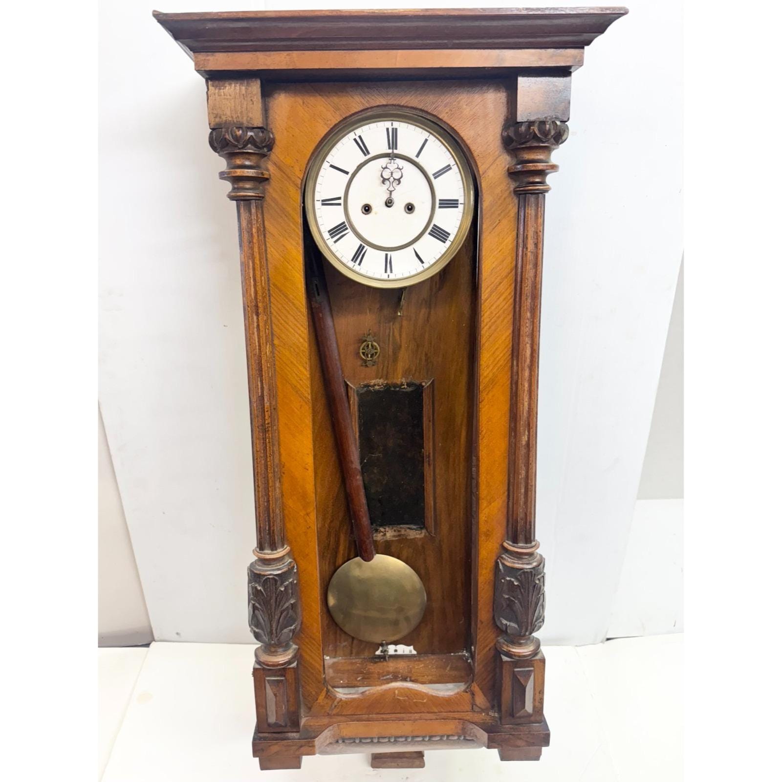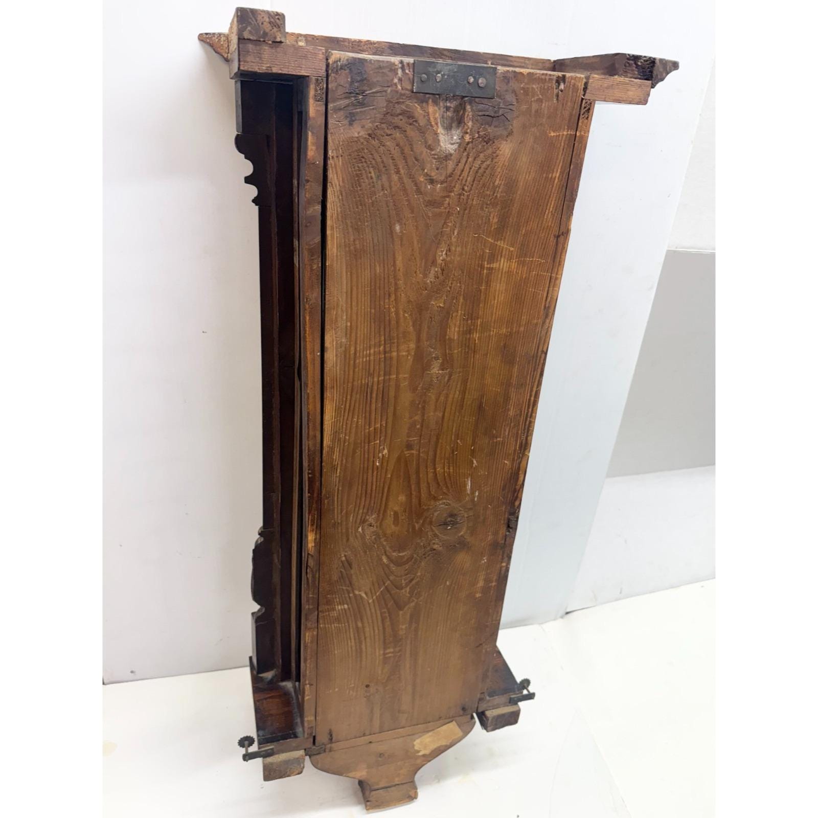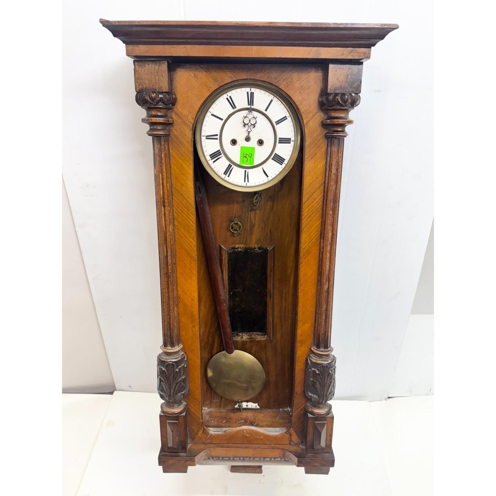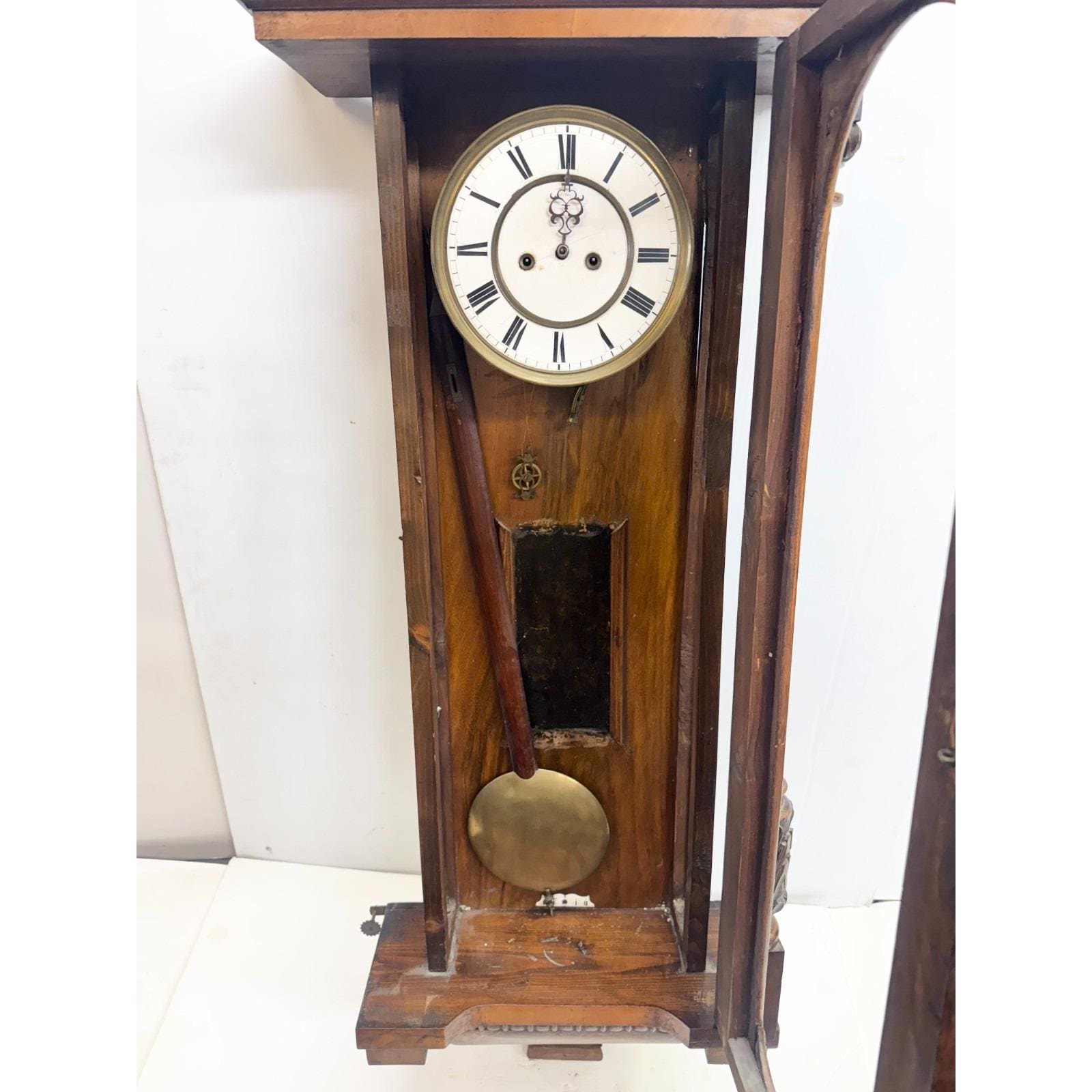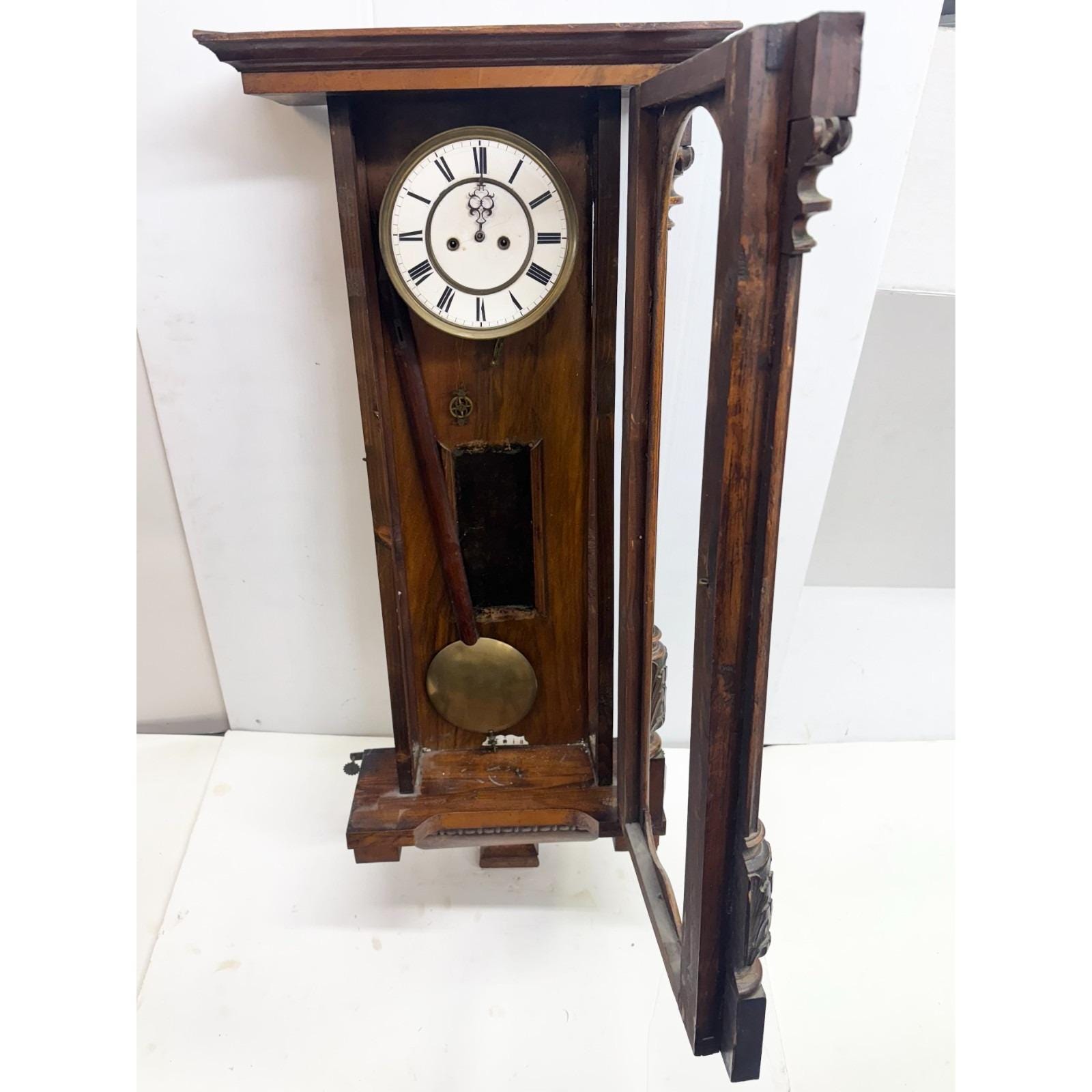 Missing front glass door and side door glass. Glass panel on one side. Hanging large pendulum. Approx 37 inches. Approx 16 inches wide. Depth is approx 8 inches. 16 lbs.