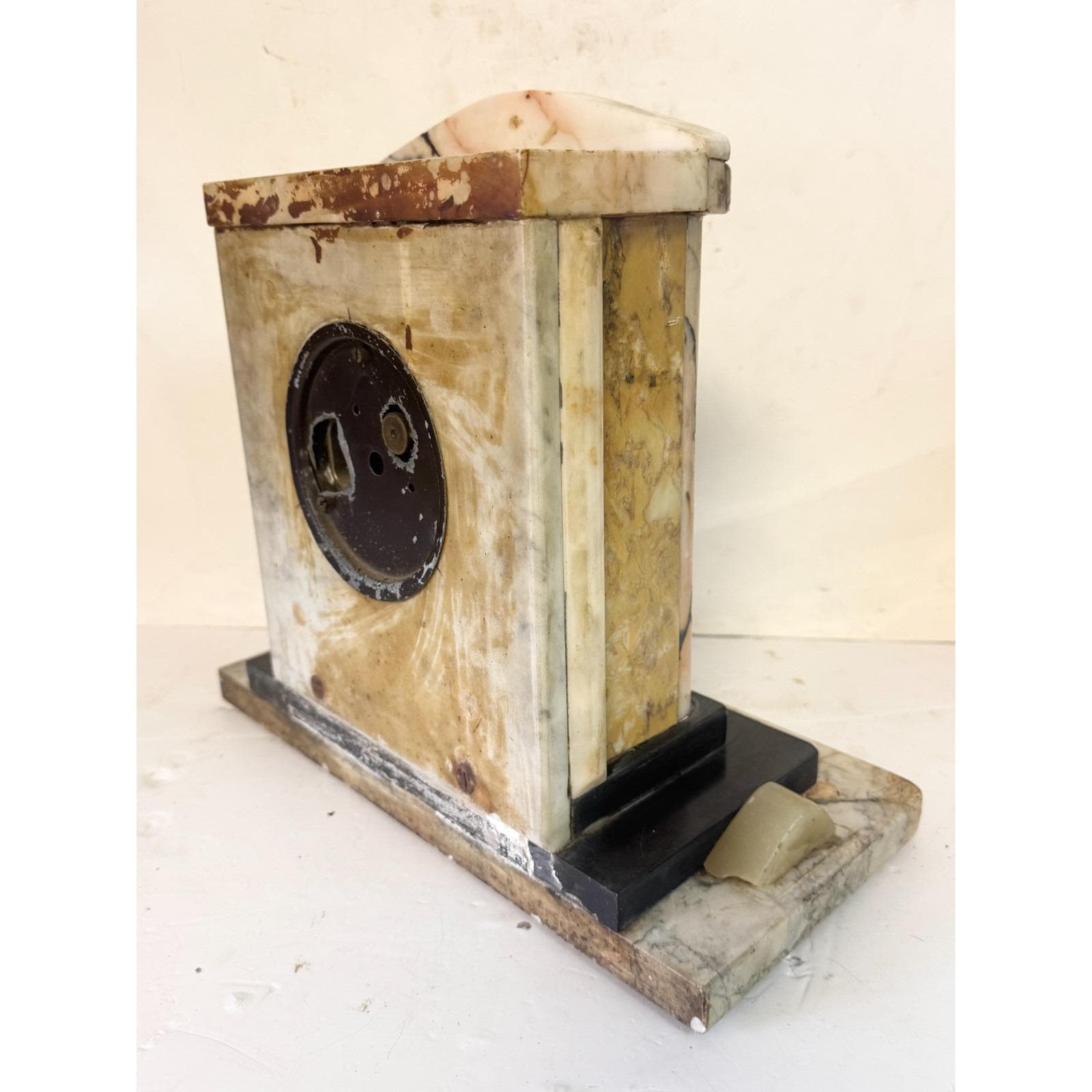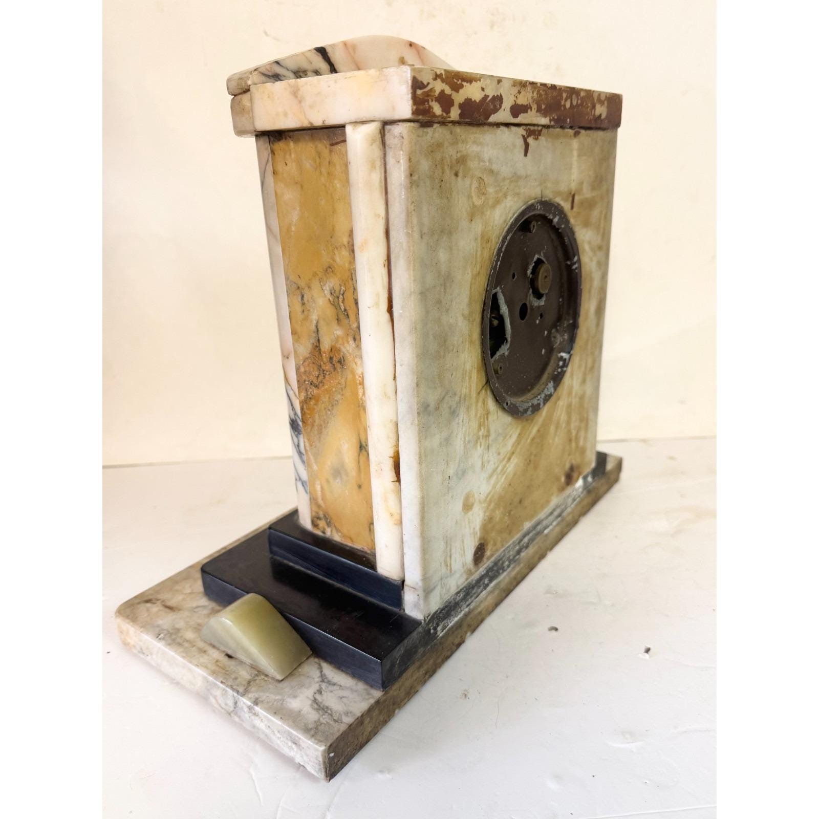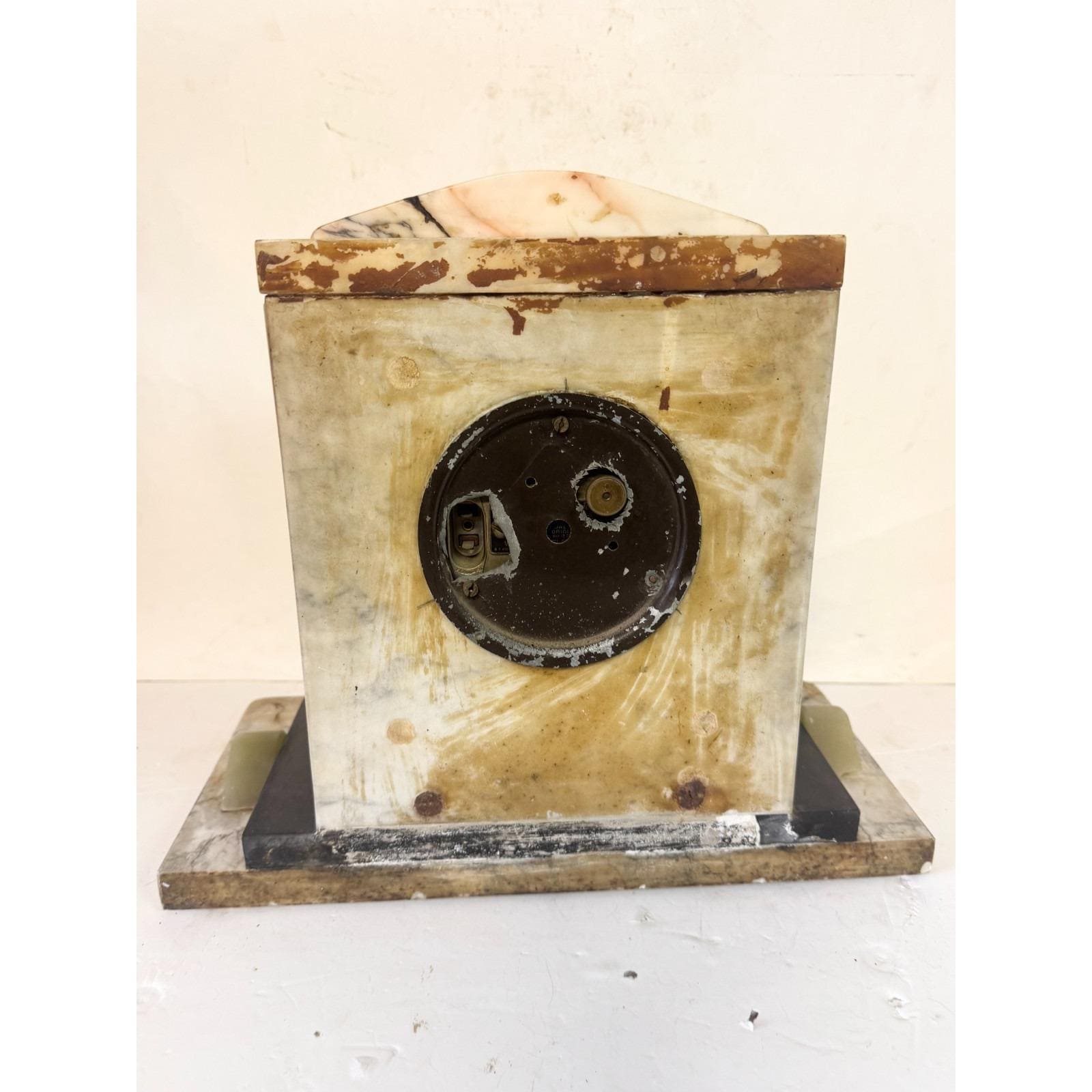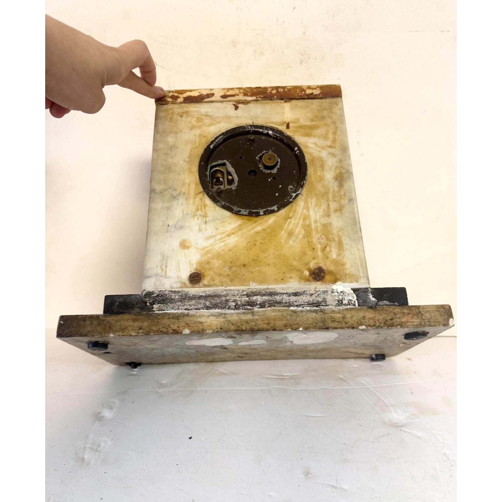 Marked Telechron Warren Telechron co Ashland Mass. Glass cover over clock face with dials. Completely marble with various colors and shaped design. 12.5 inches tall, 13.5 inches wide 6.25 inches depth. 29 lbs. Selling "as is." Not sure if it is in working condition.