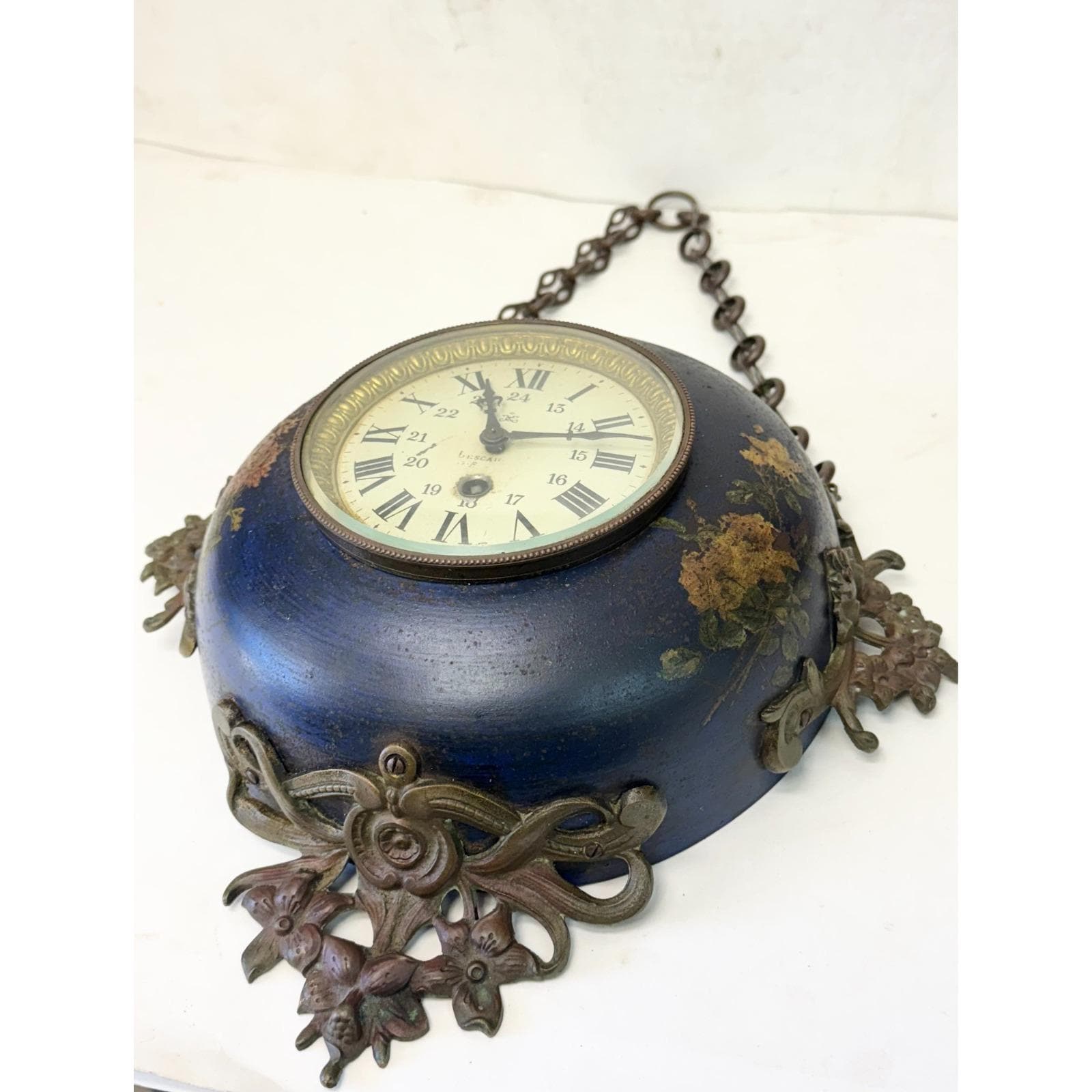 Hanging wall clock attached to chains at top. Metal floral accents. Hand painted floral artwork. Glass over clock face. Clock is signed but hard to make out. Some rust. Blue color with cream flowers. Wooden back. Back Metal door opens and has a latch to close. Inner mechanism marked SFRA. 14 inches tall but 12.5 wide. Depth is just under 4 inches. 14 inch chain. 6 lbs.
