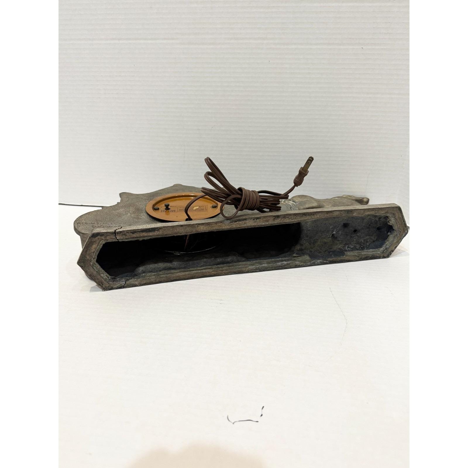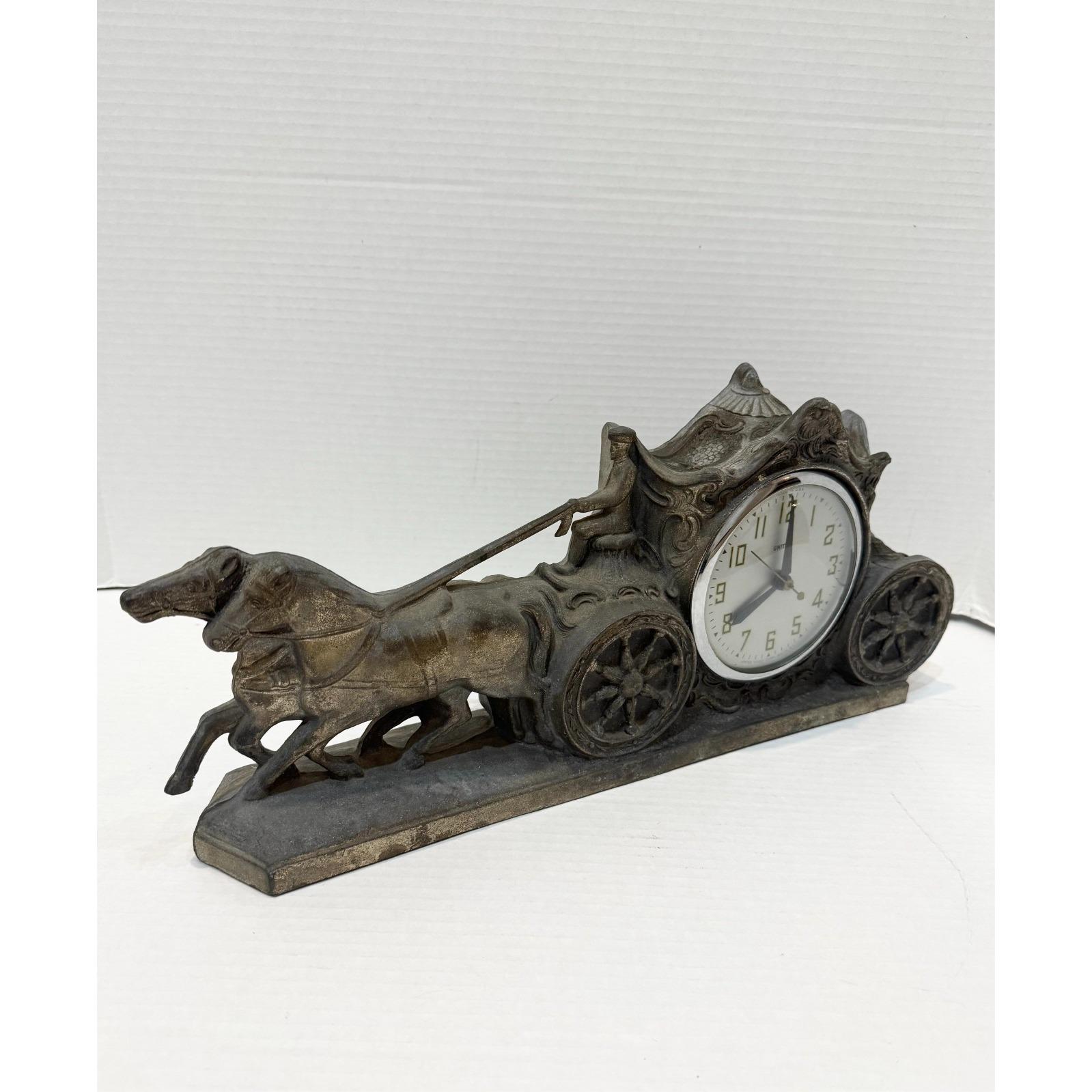 Marked United made in USA. Has plug at back. Man riding horse drawn carriage. Antique desk clock, made in the USA by United Electric, features a beautiful and intricate design of two horses and a carriage in pewter finish. The clock is powered by electricity and is designed to sit on a desk or mantel. 6 lbs. 18 inches long, 8 inches tall, depth is 2.75 inches. Selling "as is." Not sure if it is in working condition.