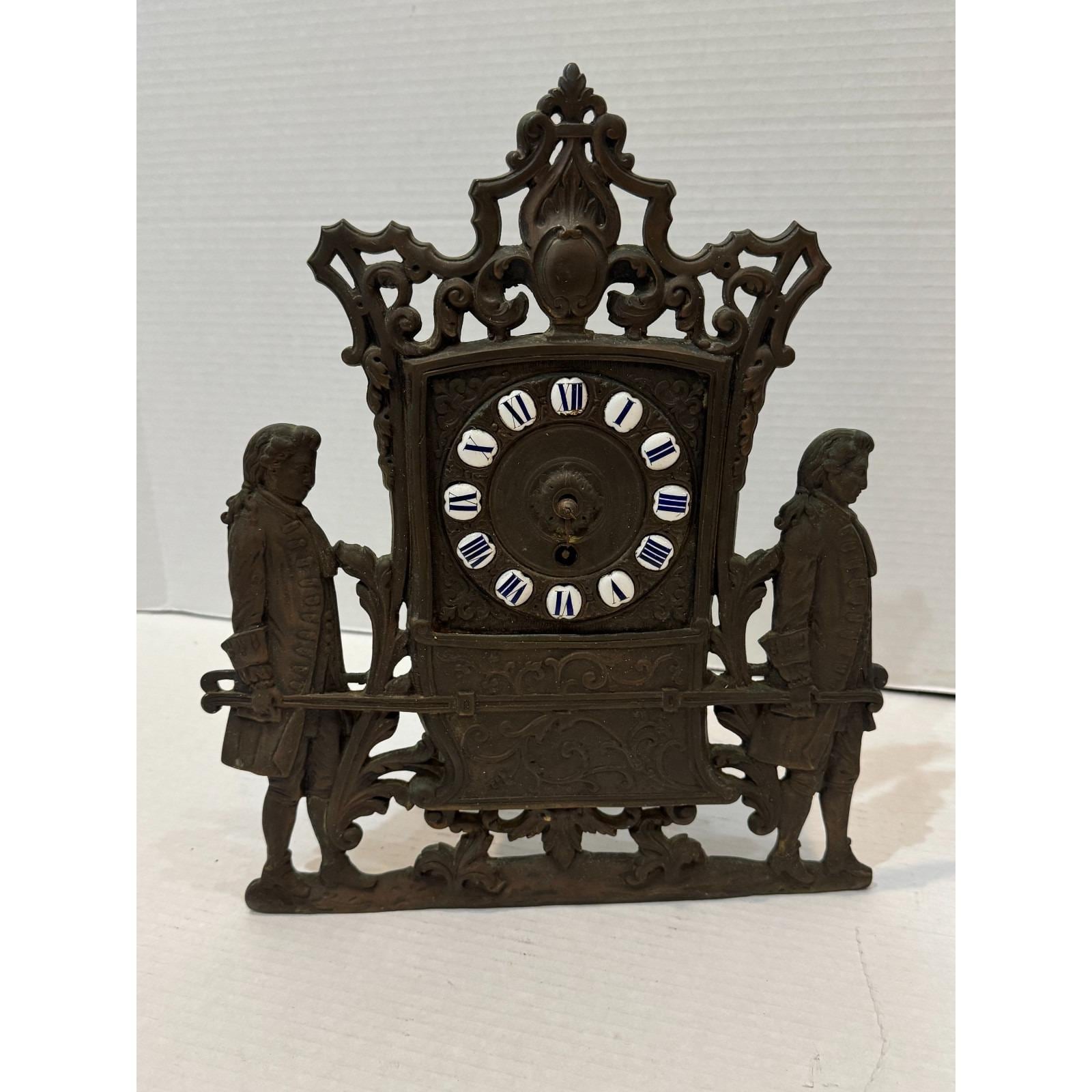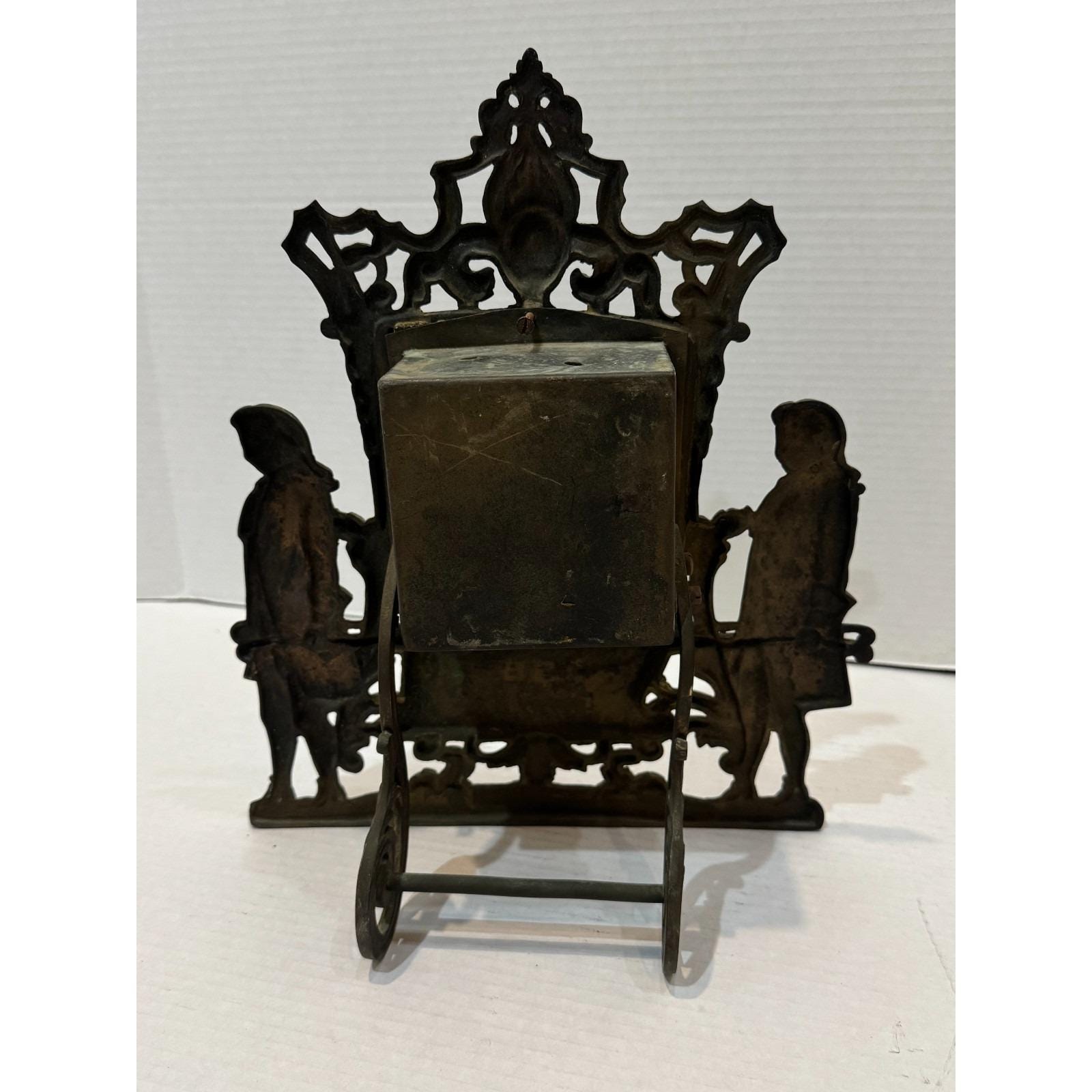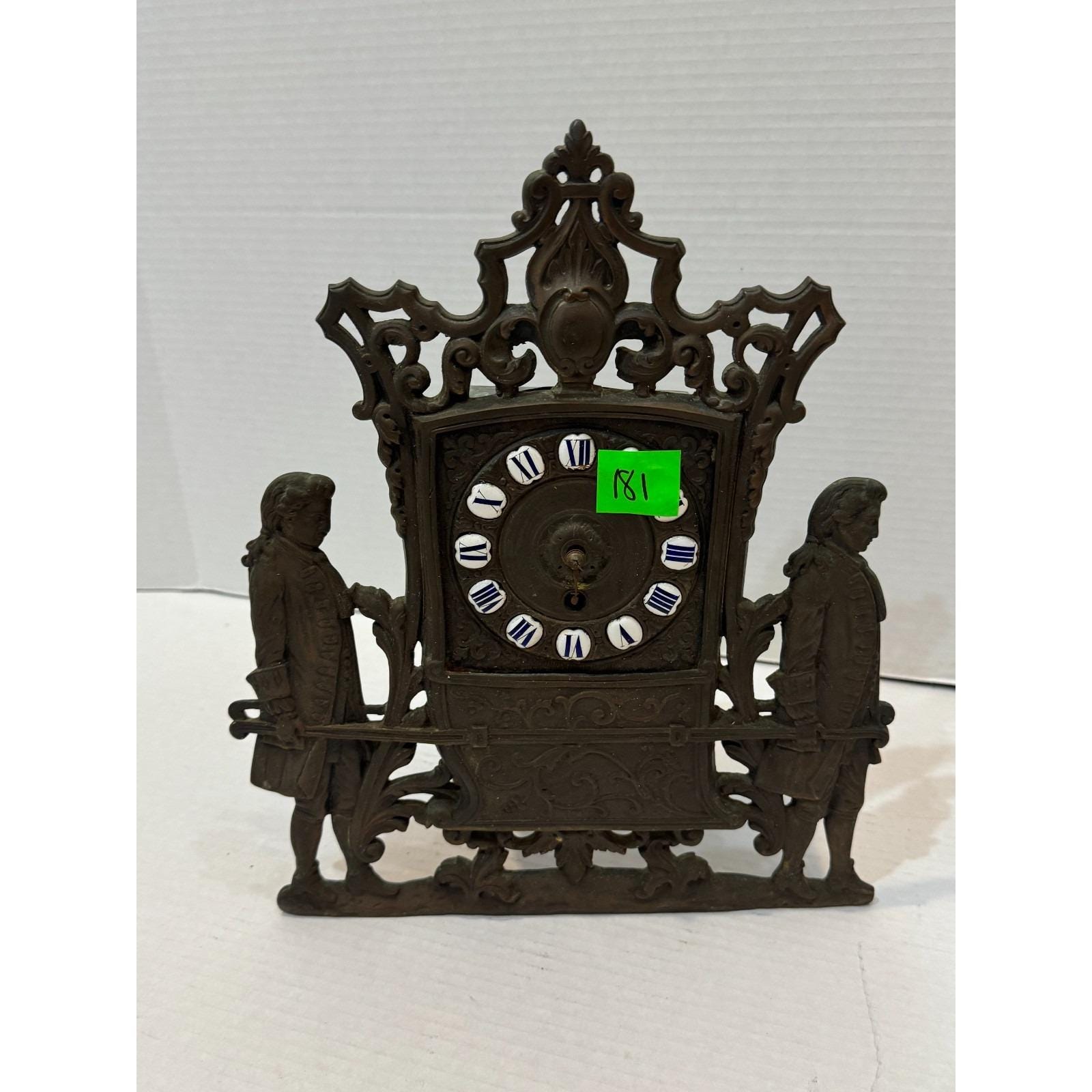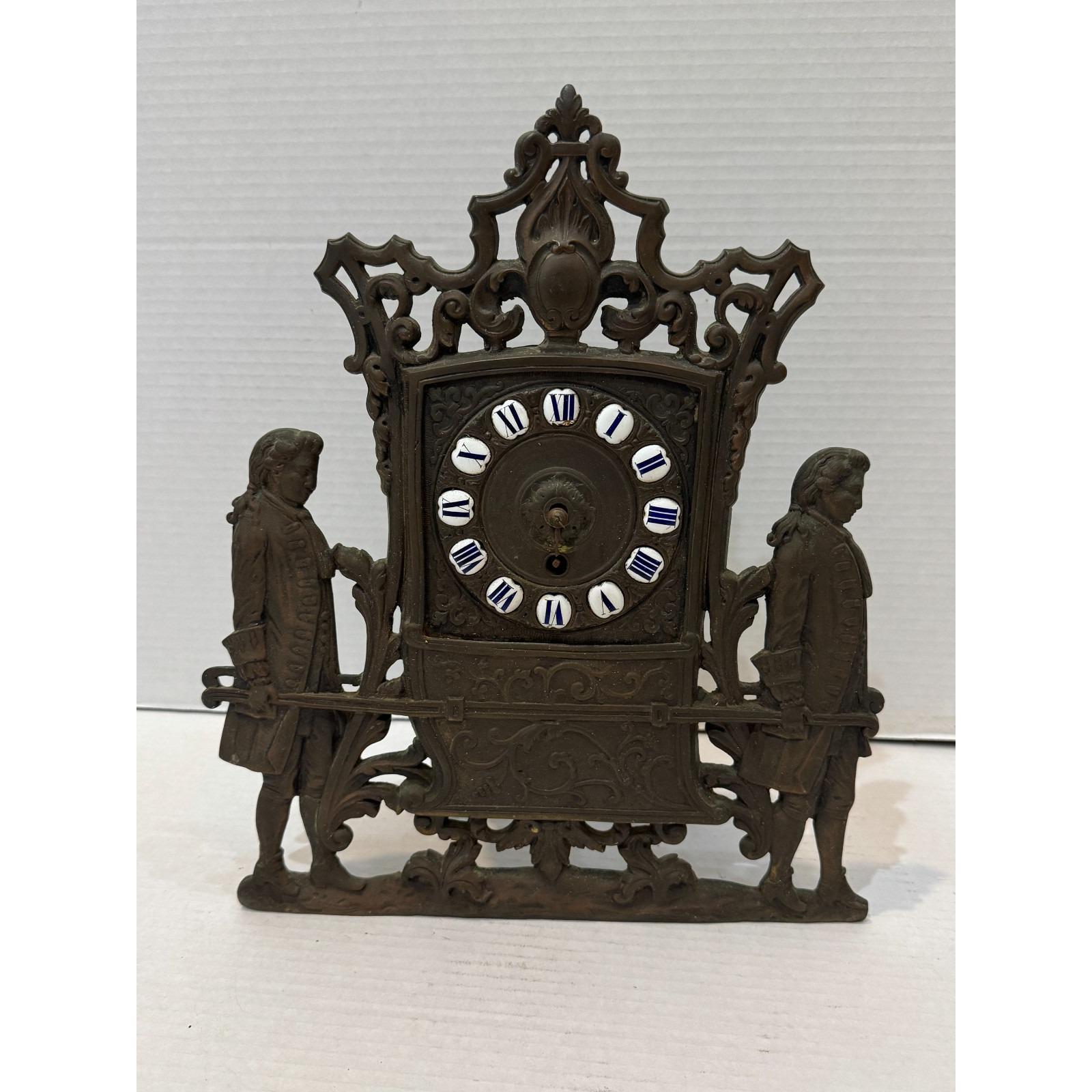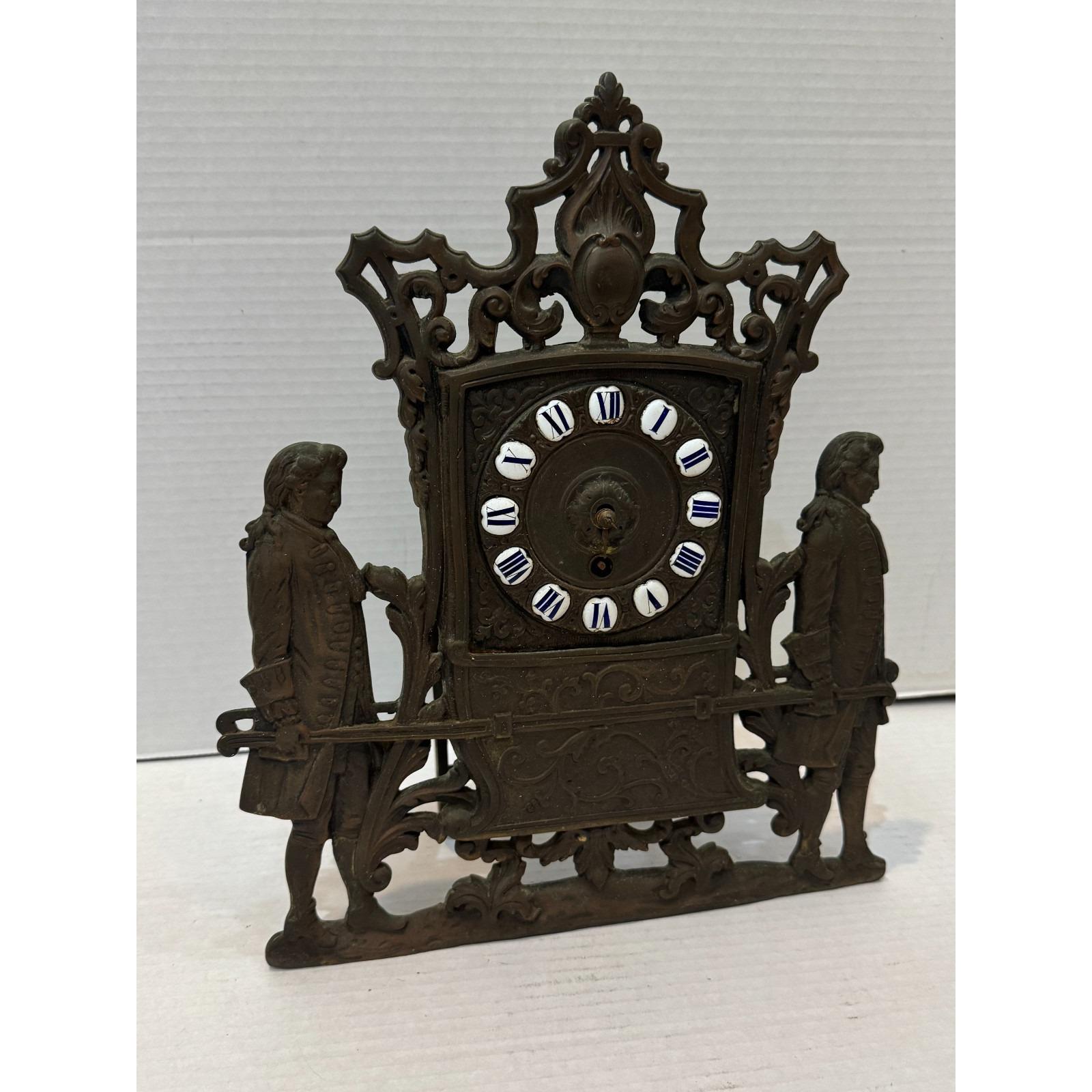 Antique rate clock. Porcelain Roman numeral numbers. Two men on either side holding the carriage. Figural clock. Stand in back. Very well made and super detailed. 13 inches tall, 10.5 inches wide, and depth is 4.5 inches 6 lbs.