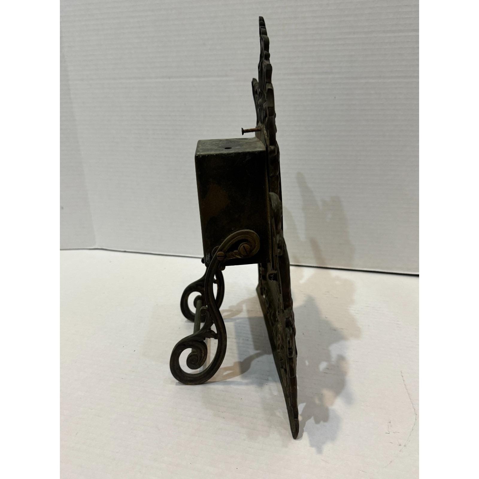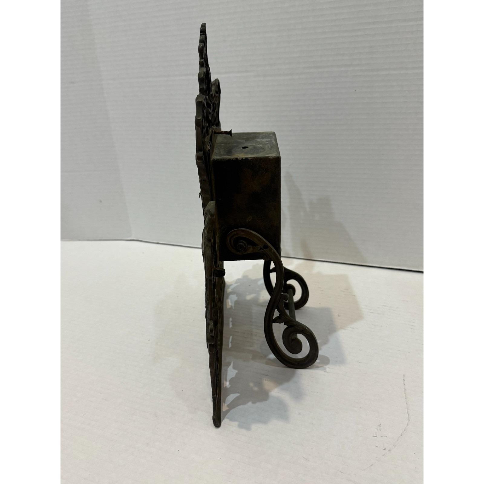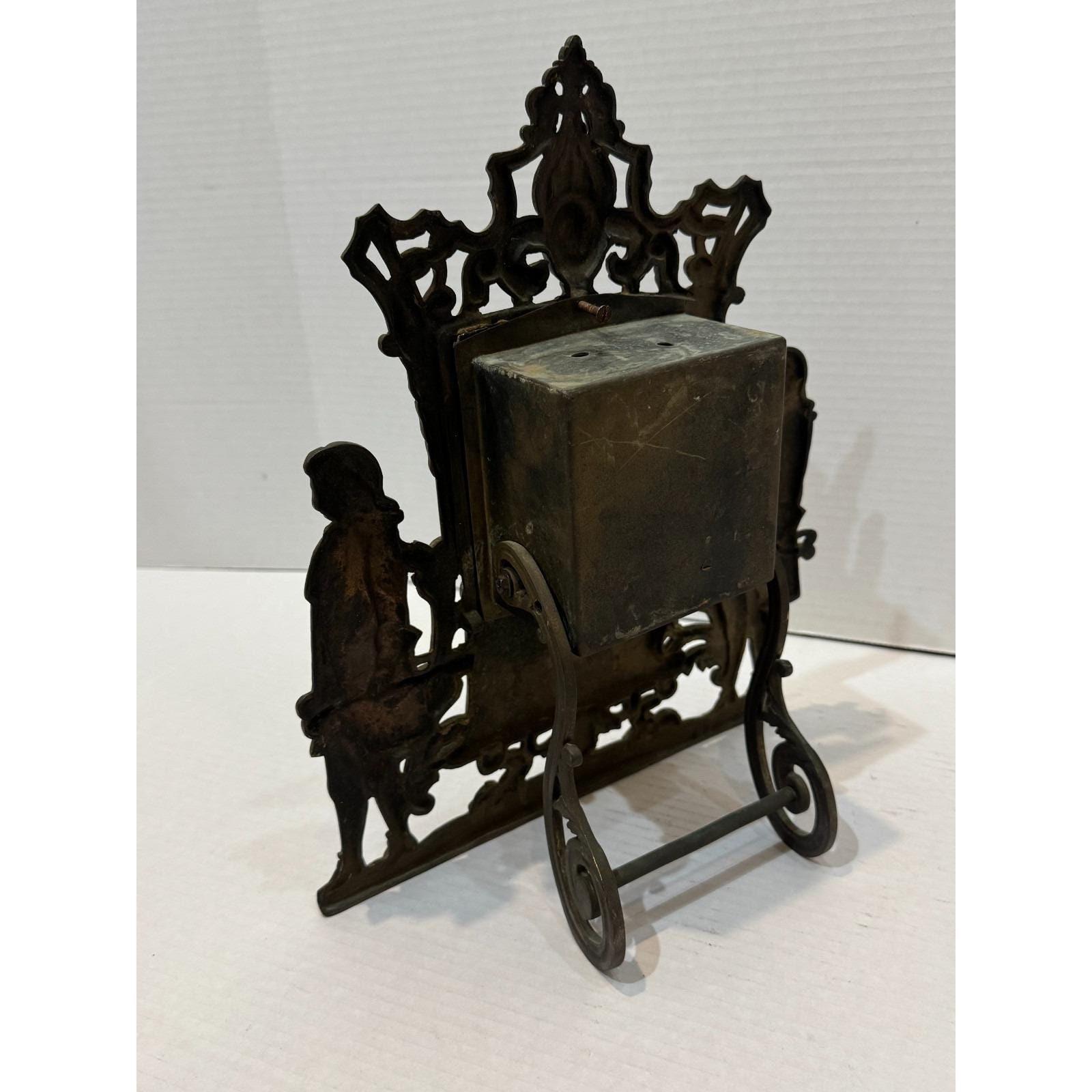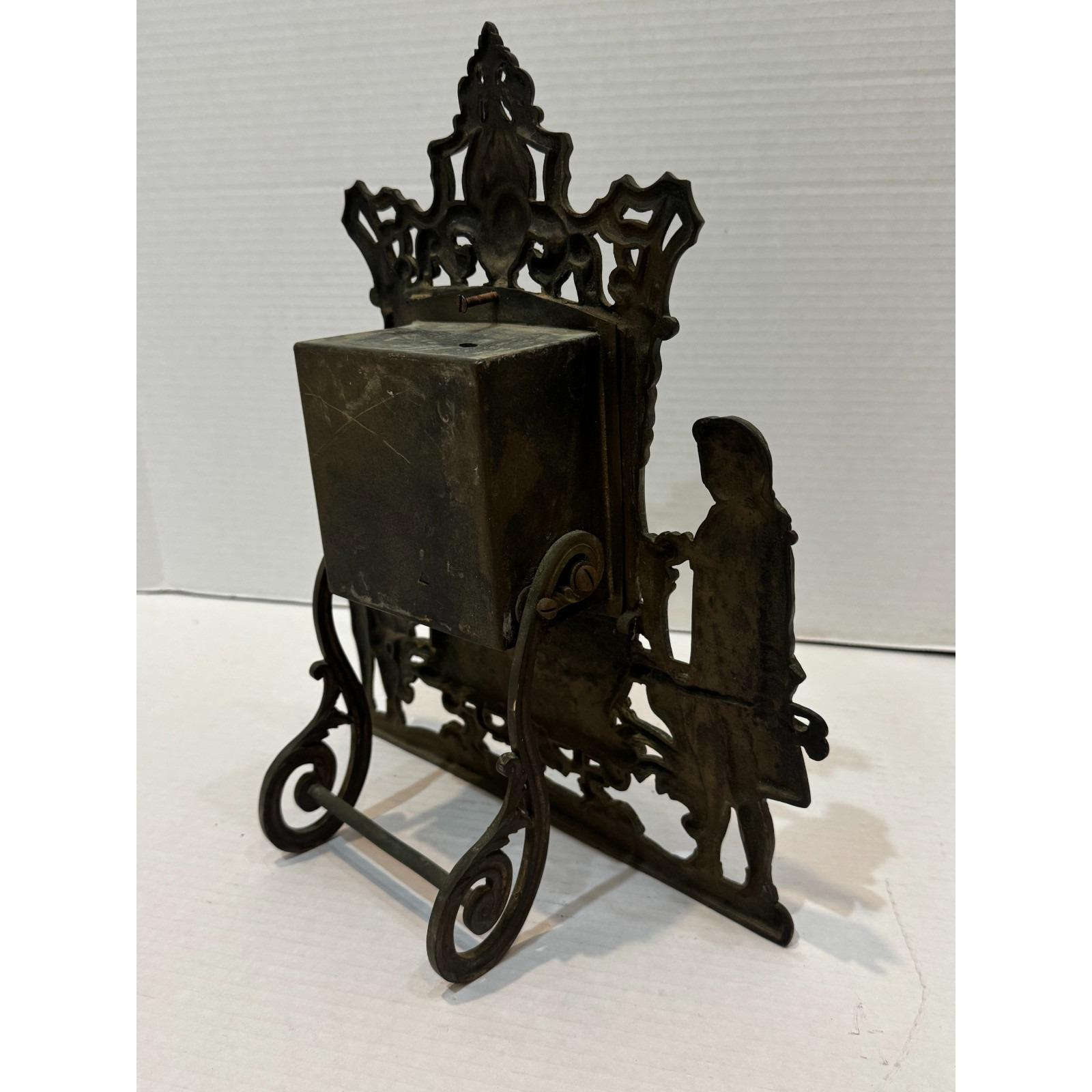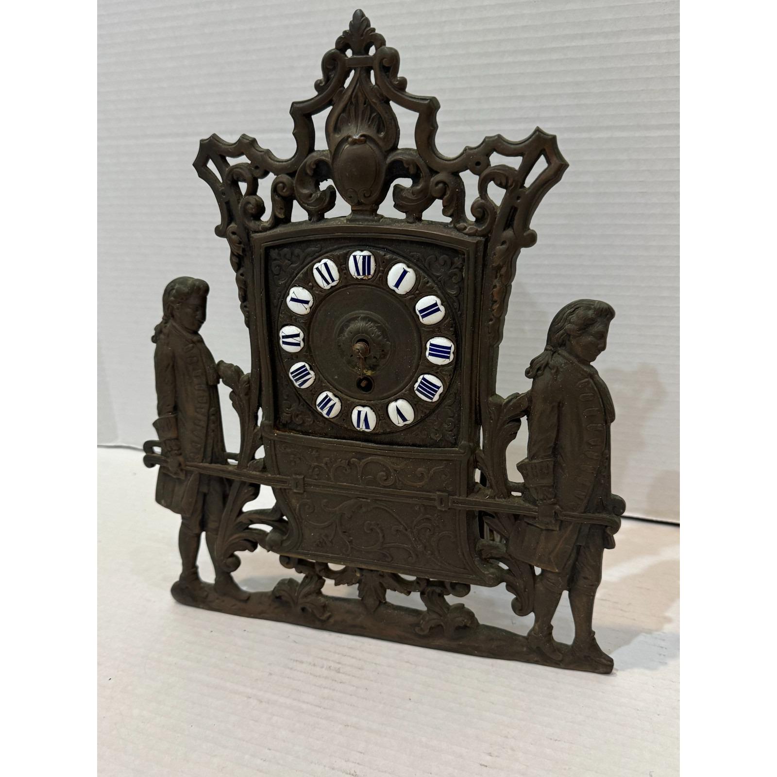 Antique rate clock. Porcelain Roman numeral numbers. Two men on either side holding the carriage. Figural clock. Stand in back. Very well made and super detailed. 13 inches tall, 10.5 inches wide, and depth is 4.5 inches 6 lbs.