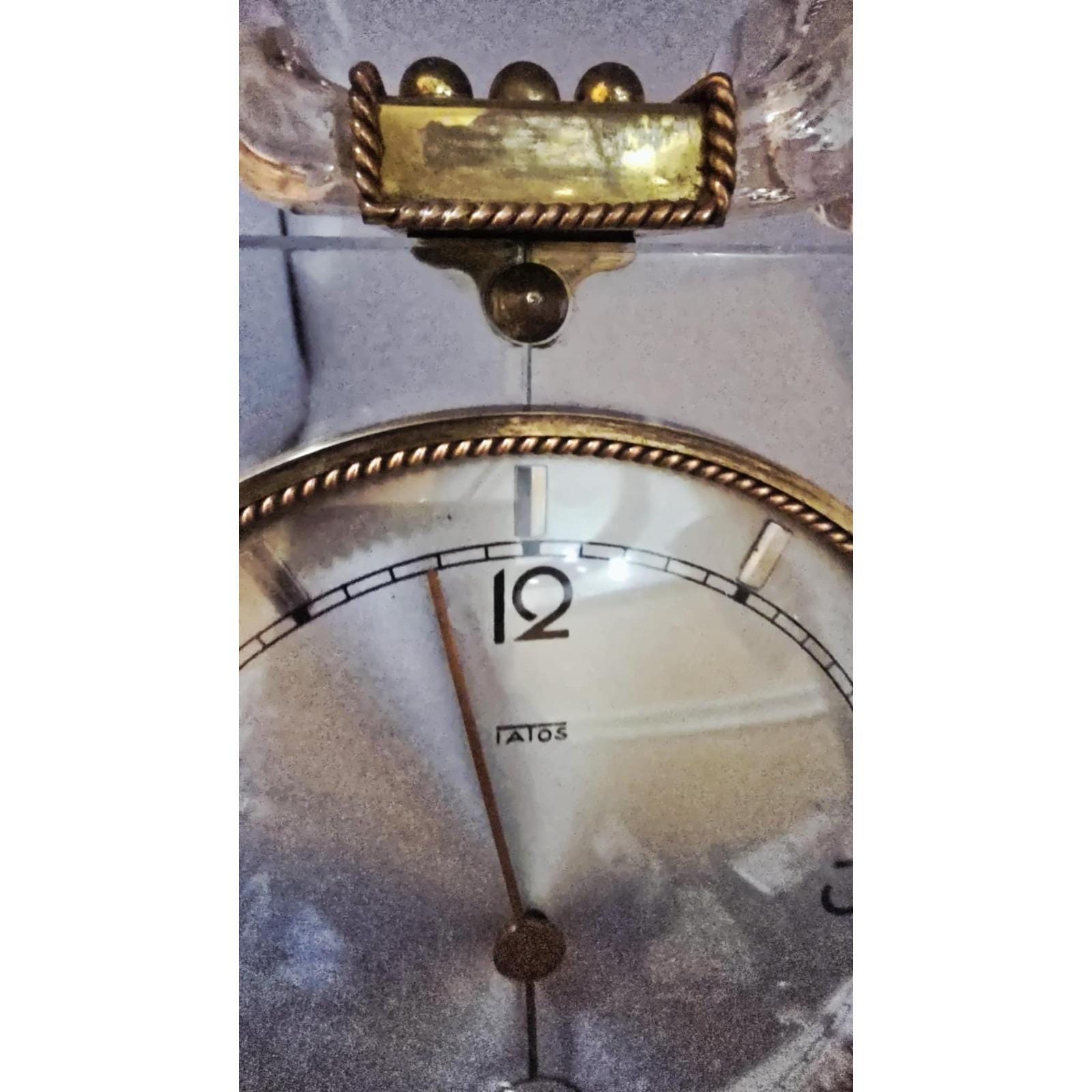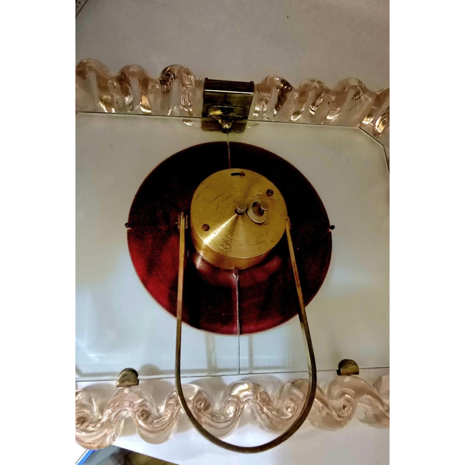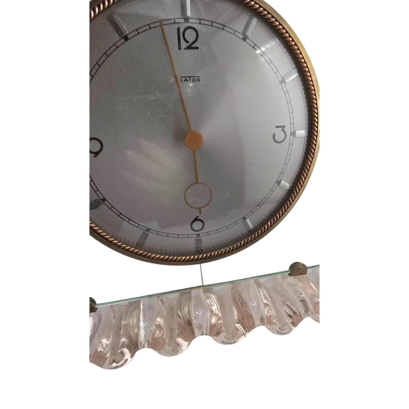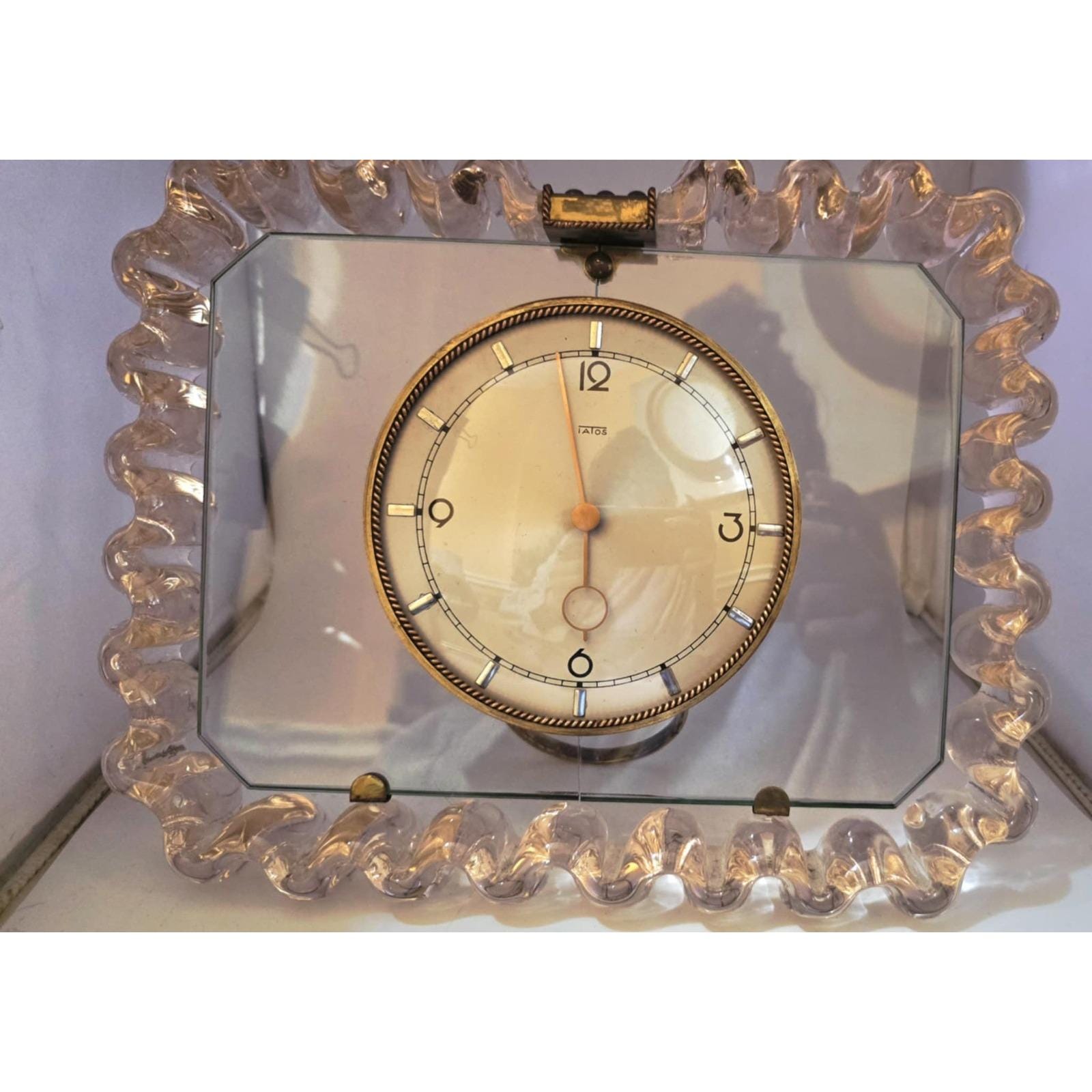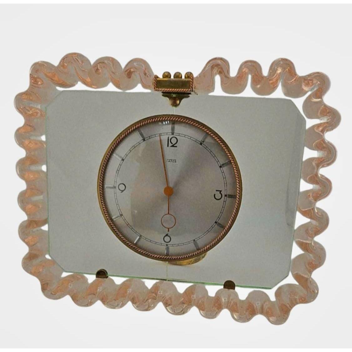 Vintage Iatos Art Deco Mid-Century Modern Murano Twisted Pale Pink And Clear Glass Table Top ClockThe background is clear glass; it was a bit hard to capture. Pink curved ruffled twisted glass border. The pink glass is 1.75" thick. Brass easel back stand. *There is a crack down the middle behind the clock from top to bottom. It is a clean crack and all together. Clear glass background, brass tabs hold it in place. Twisted brass bezel along the clock. The clock does wind and work. Pink is a pale pink. It's an exceptional piece. It is 10" high by 11.5” wide. It is fairly heavy at 8".