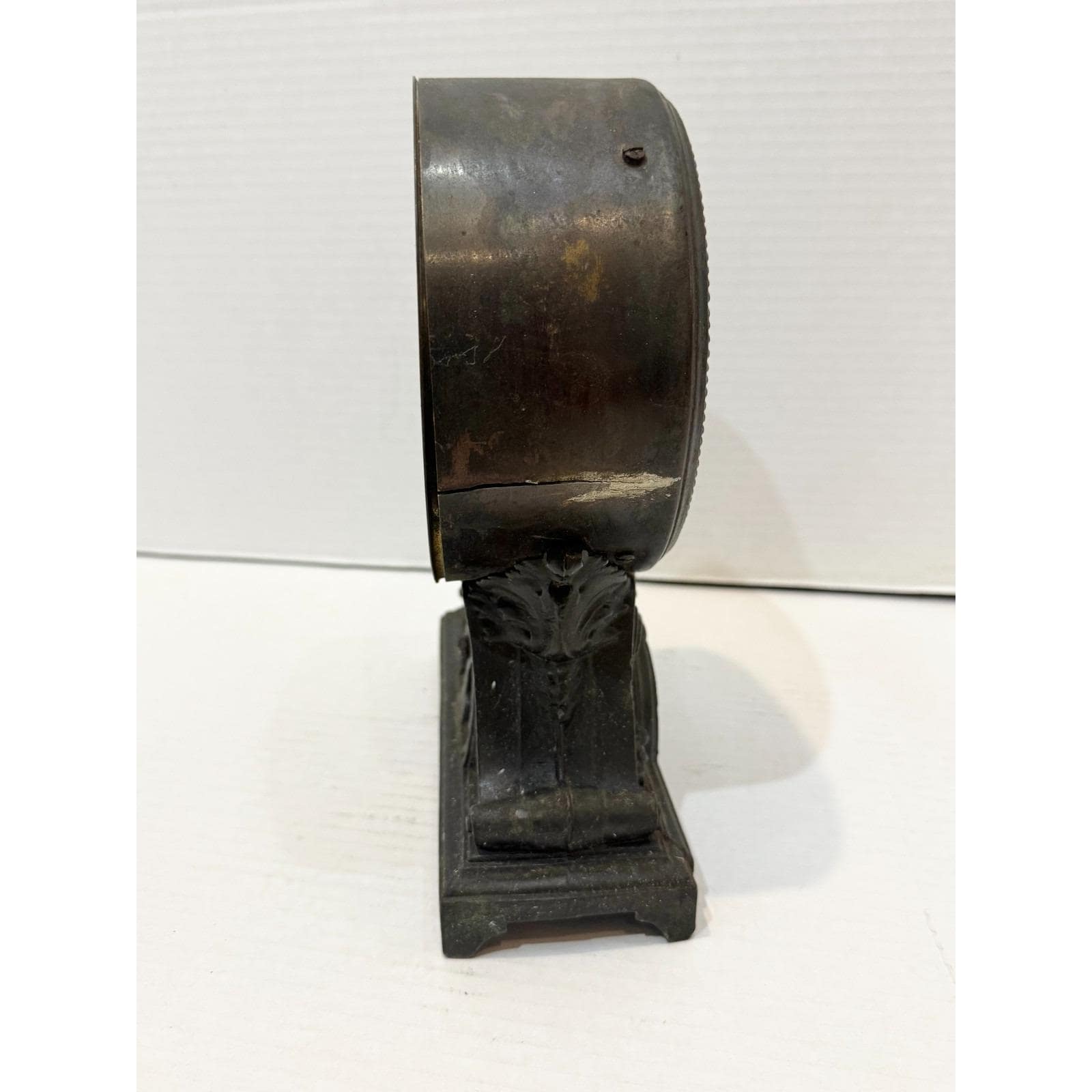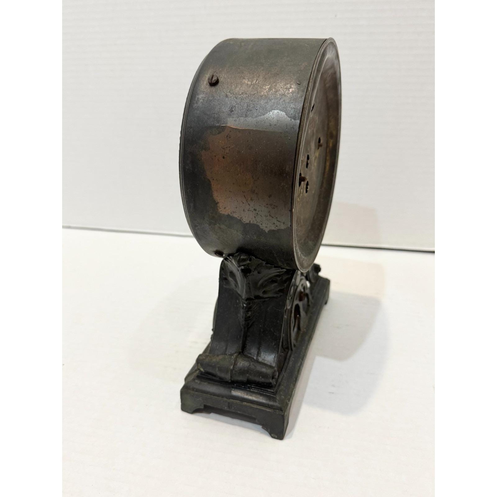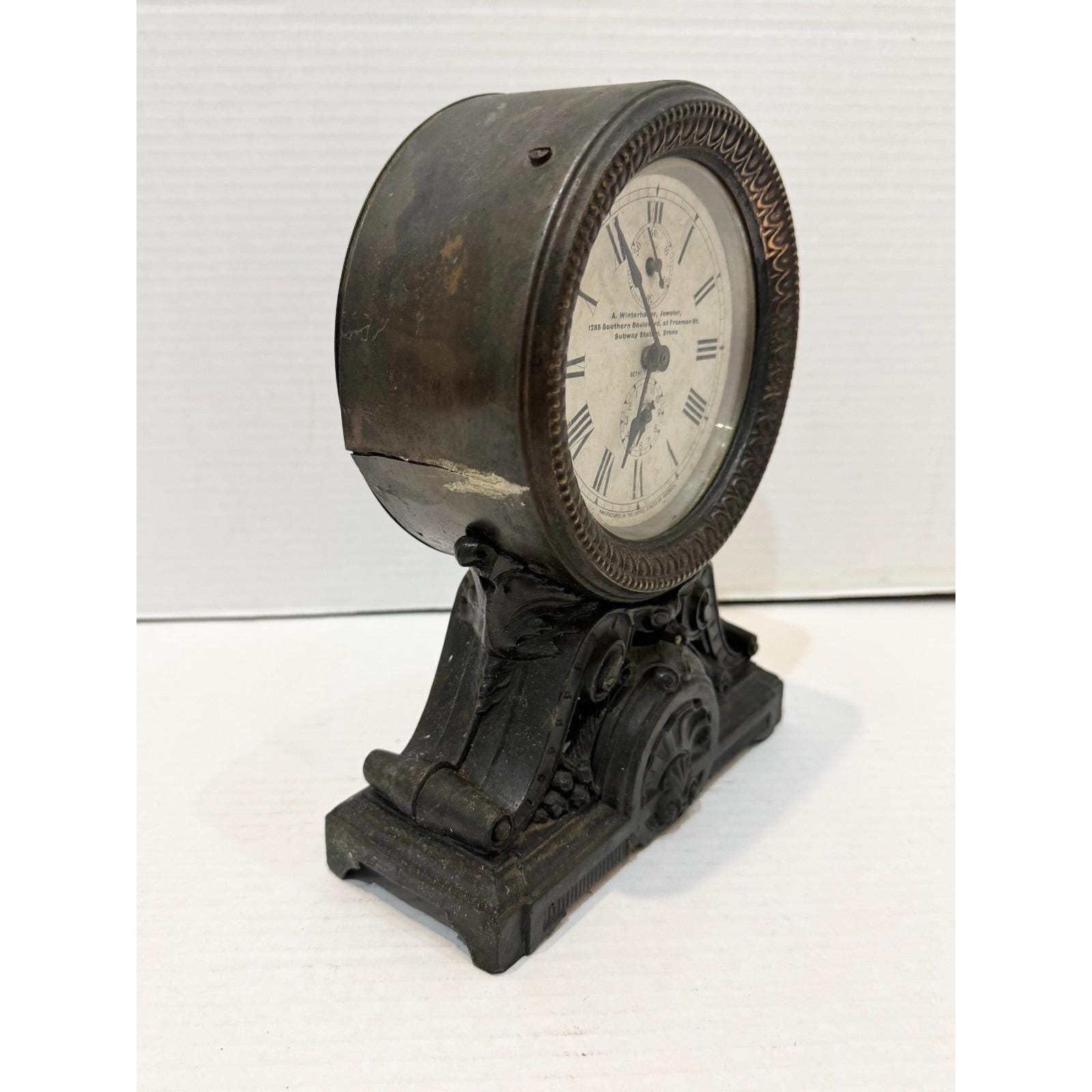 Antique mantle clock. Marked A. Winterhalter Jeweler 1285 Southern Boulevard at Freeman St. Subway Station, Bronx. Marked Seth Thomas, manufactured in the United States of America. Beautiful detailing on Metal mantle clock. Has a knob for alarm or silent. The back reads made in U.S. America. 5 lbs. 9 inches tall, 7 inches wide depth is 3 inches.