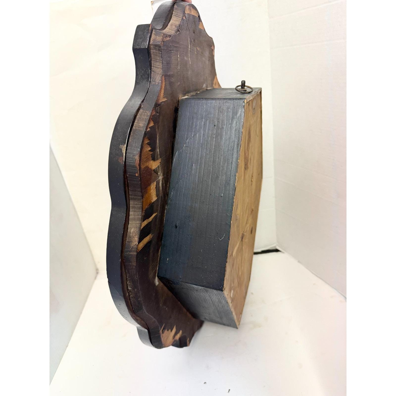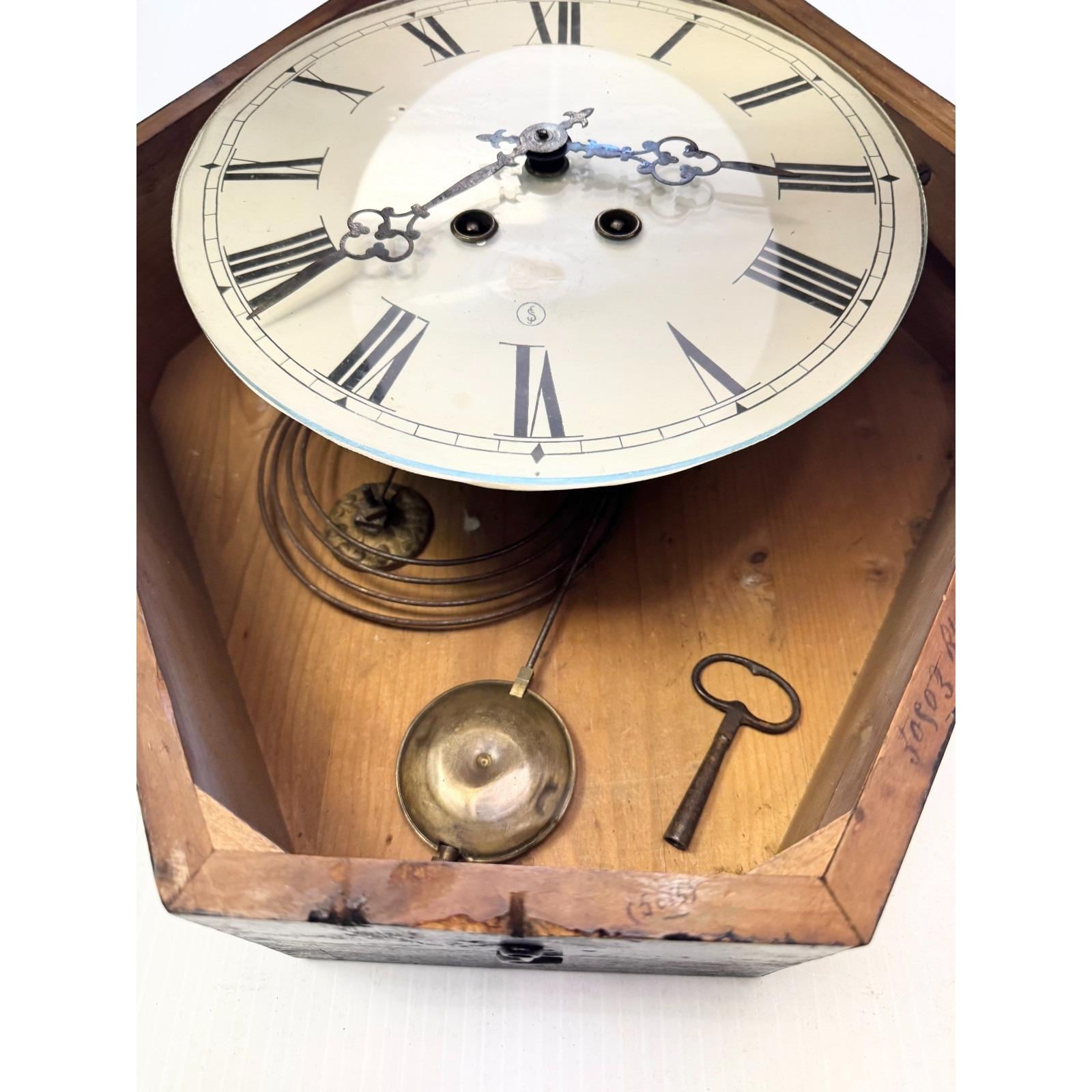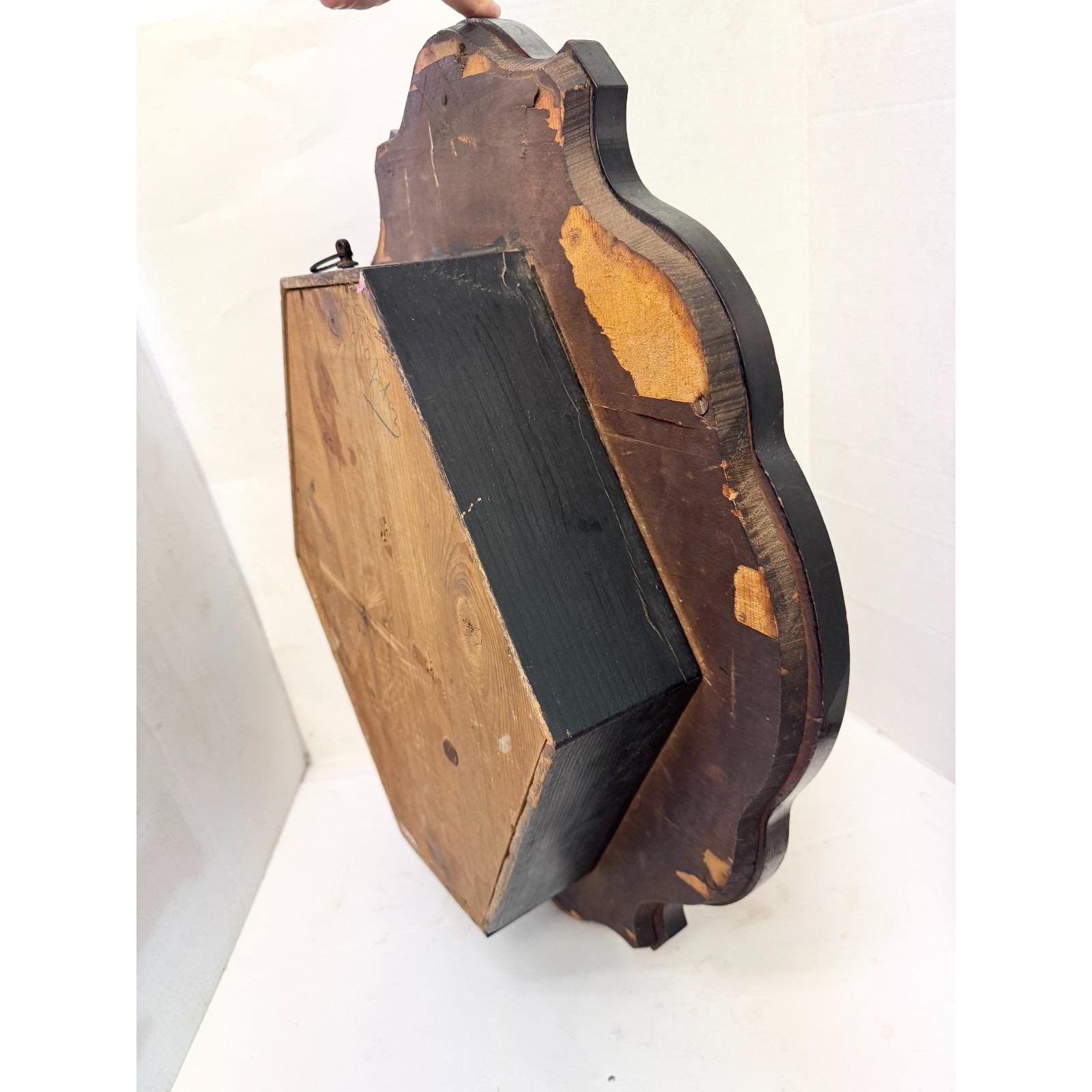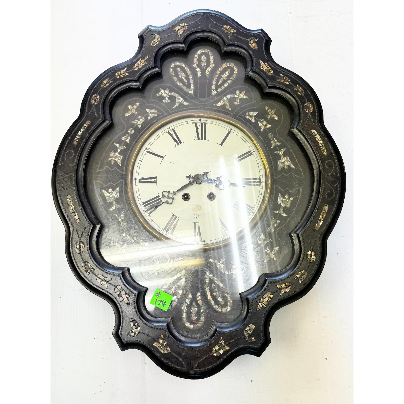 Stunning inlay of mother of pearl abalone Shell all around and under glass. Glass cover on top and glass over clock face inside. Latch on bottom to keep closed and hook on top for hanging. Inner clock mechanism with hanging pendulum and key. Stunning wall clock. In good condition. Normal wear for age, a few pieces of inlay are missing and has some hairline cracks on wood but all complete and in good condition. Roman numerials on clock. 25.5 inches tall, 20 inches wide, depth is 5.5 inches. 15 Lbs.