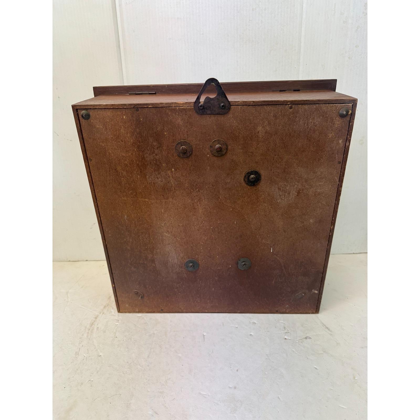 Square wooden frame. Marked made in France, beautiful woodworking design in square shape. Side door with latch. Hooks for wall hanging on back and metal feet on back hinged top with glass. Great art deco look. 14.5 inches tall. Width is 14 inches. 5 inches.9 lbs. Selling "as is." Not sure if it is in working condition.