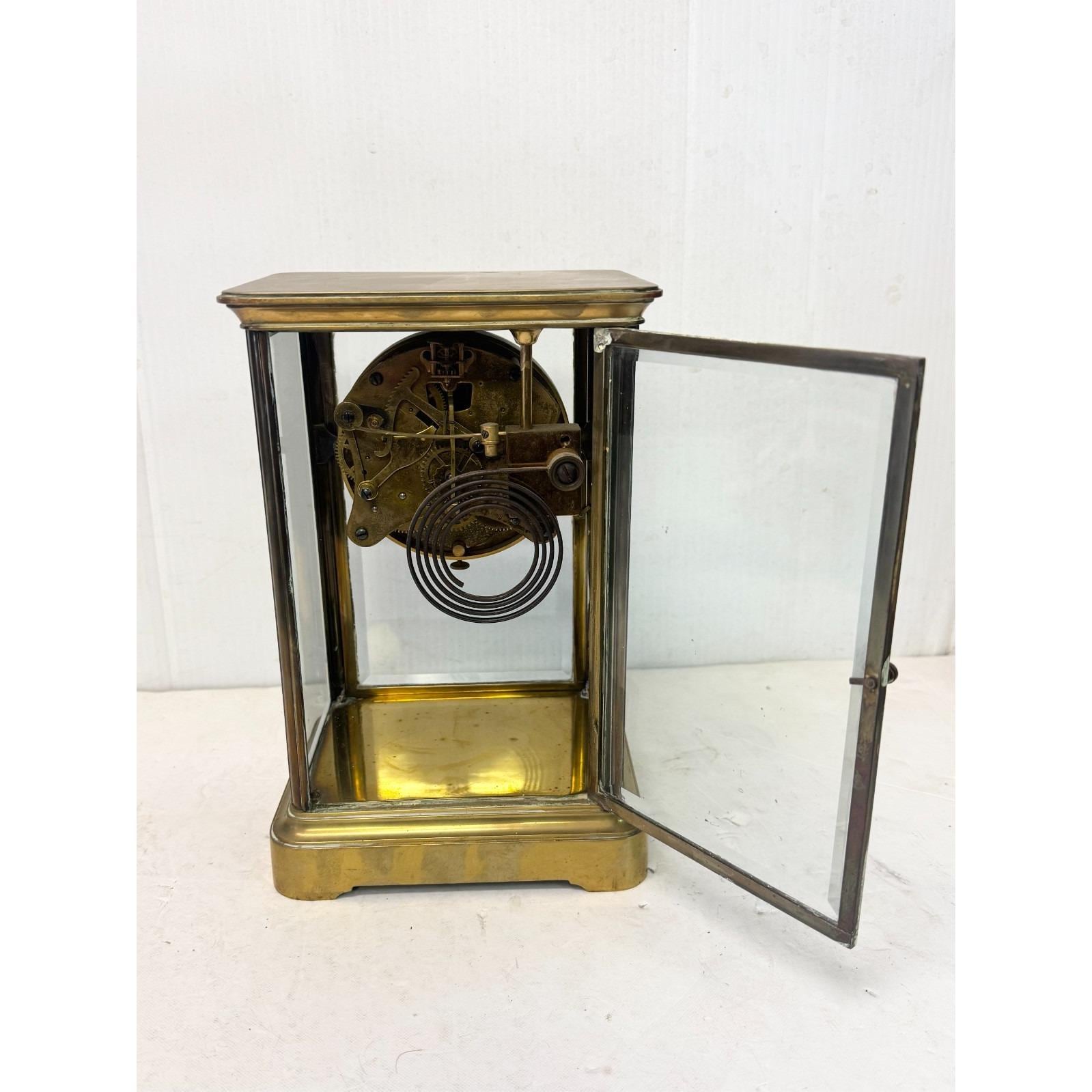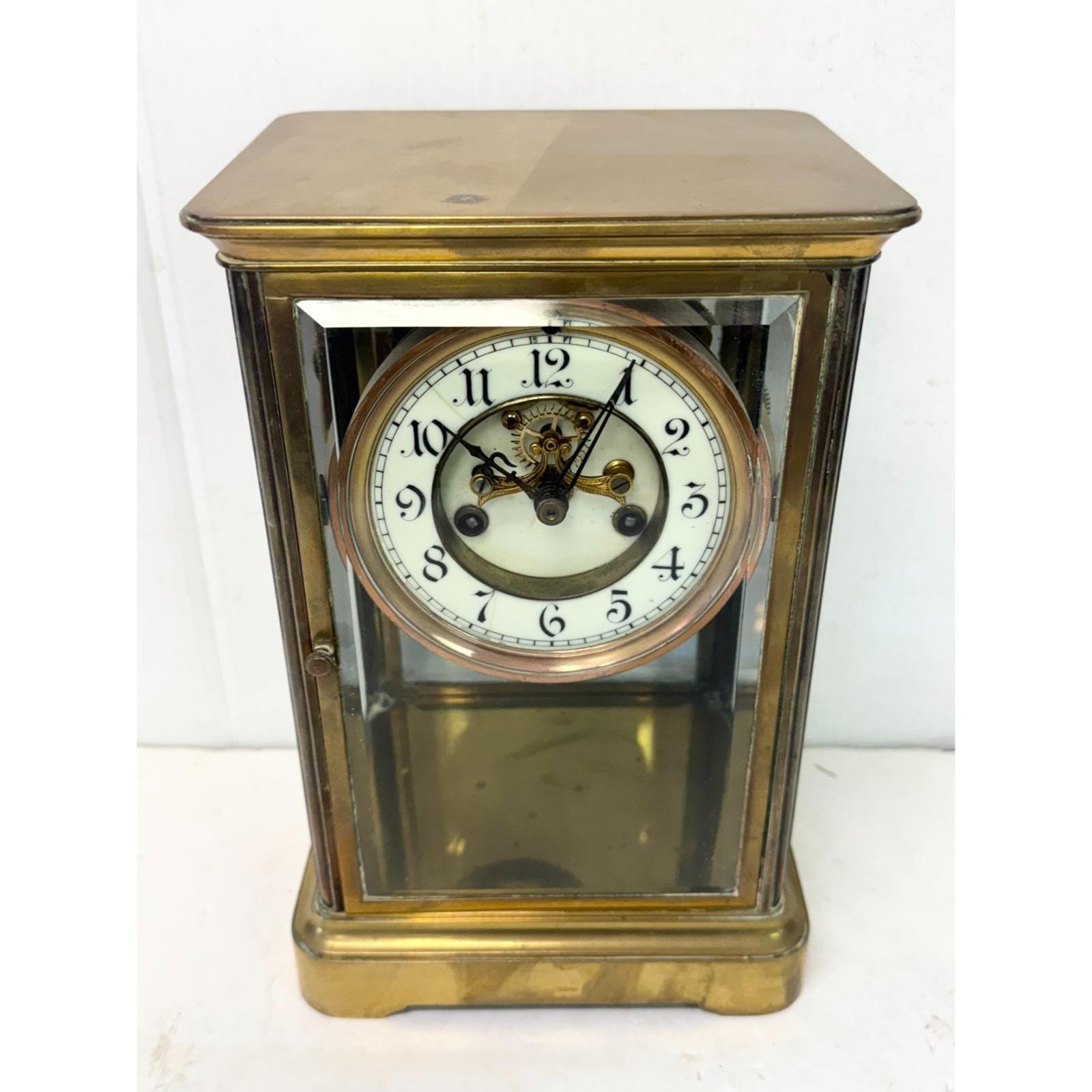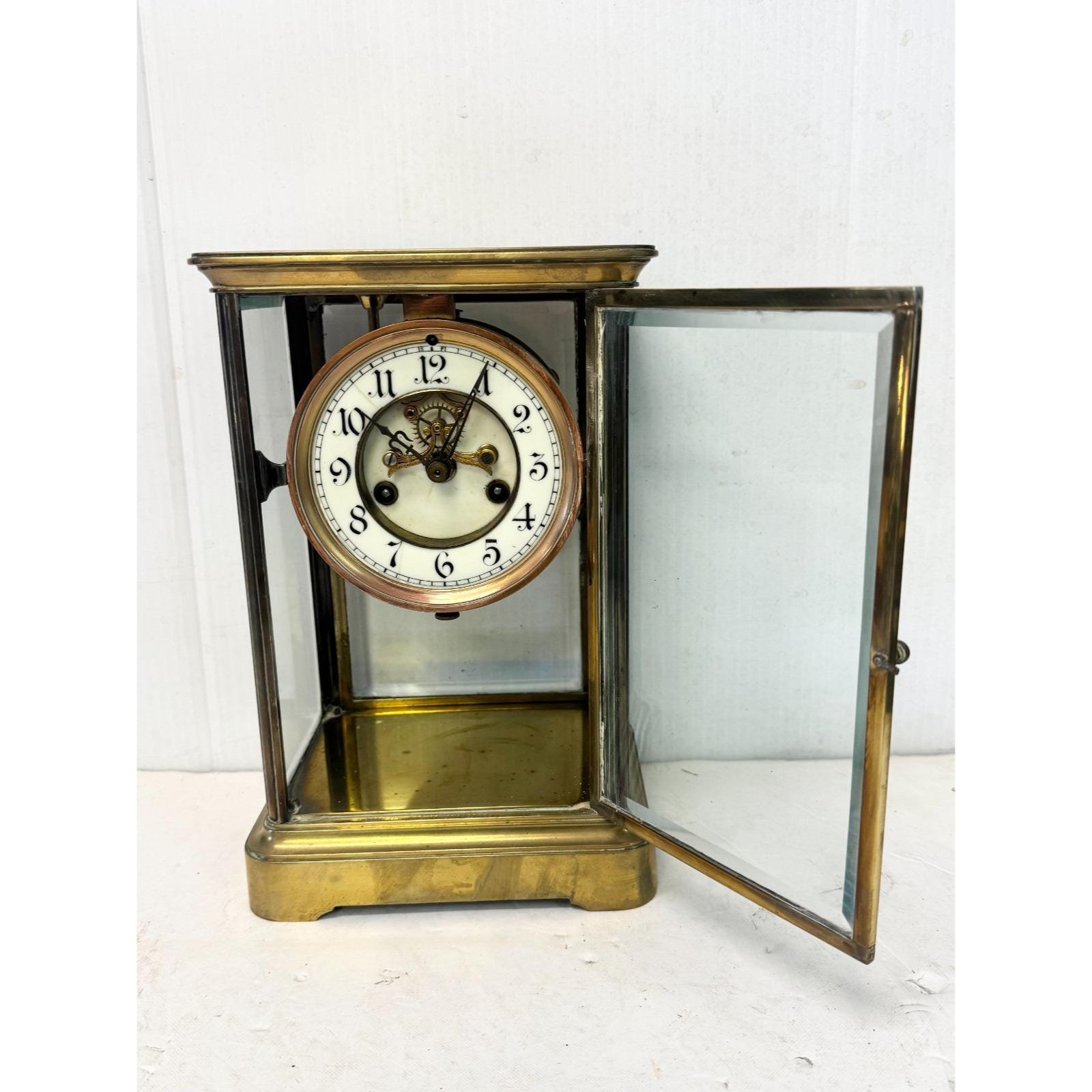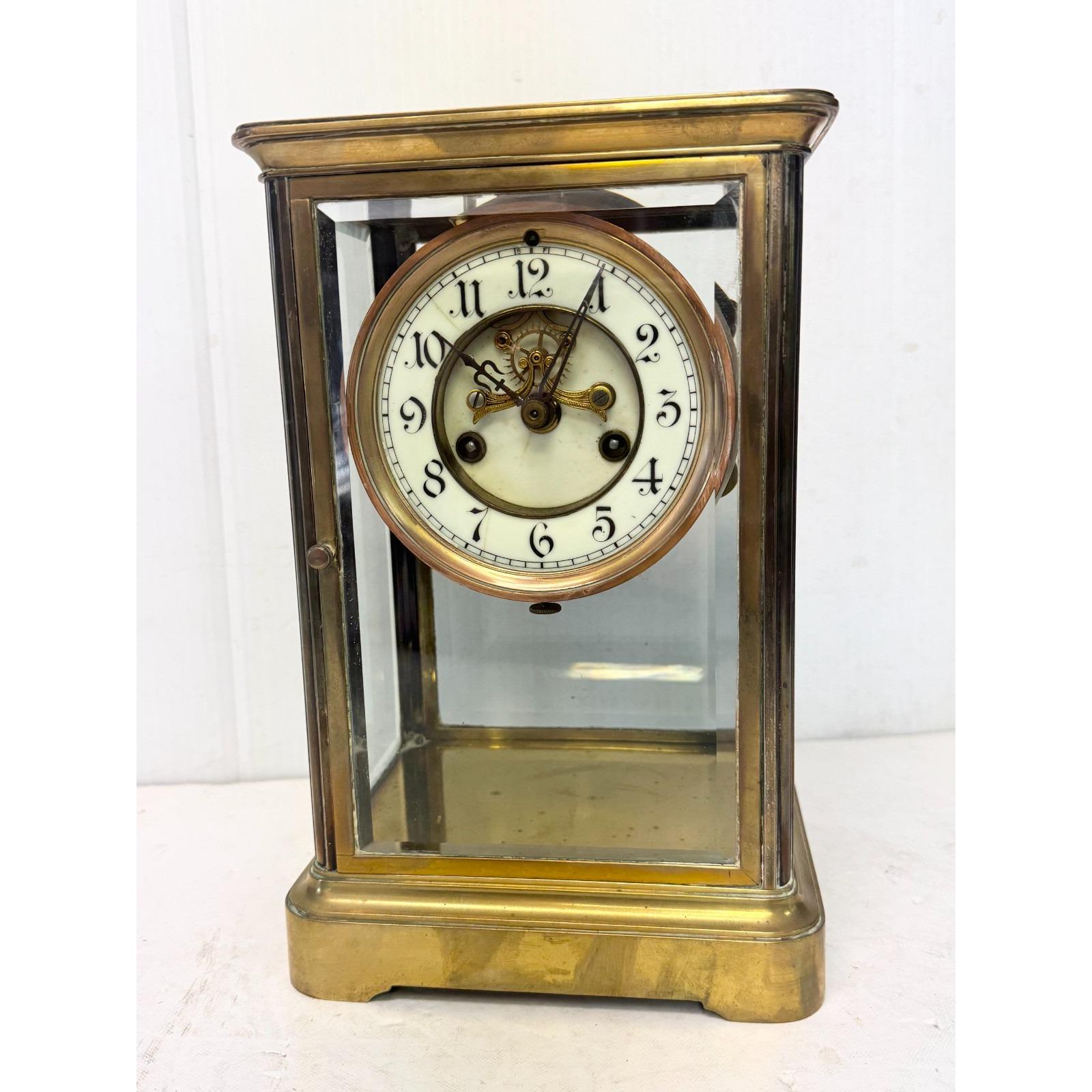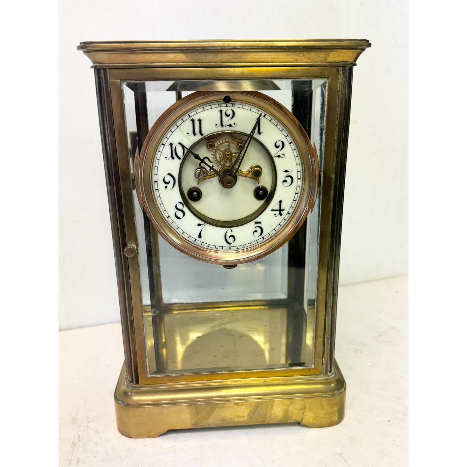 Two doors that open and close with latch on front and back. Marked Waterbury Pat 1989. Antique glass mantle clock. Beveled glass. 10.5 inches tall. 6.5 inches wide. Depth is 5.5 inches. 11 lbs. Selling "as is." Not sure if it is in working condition.