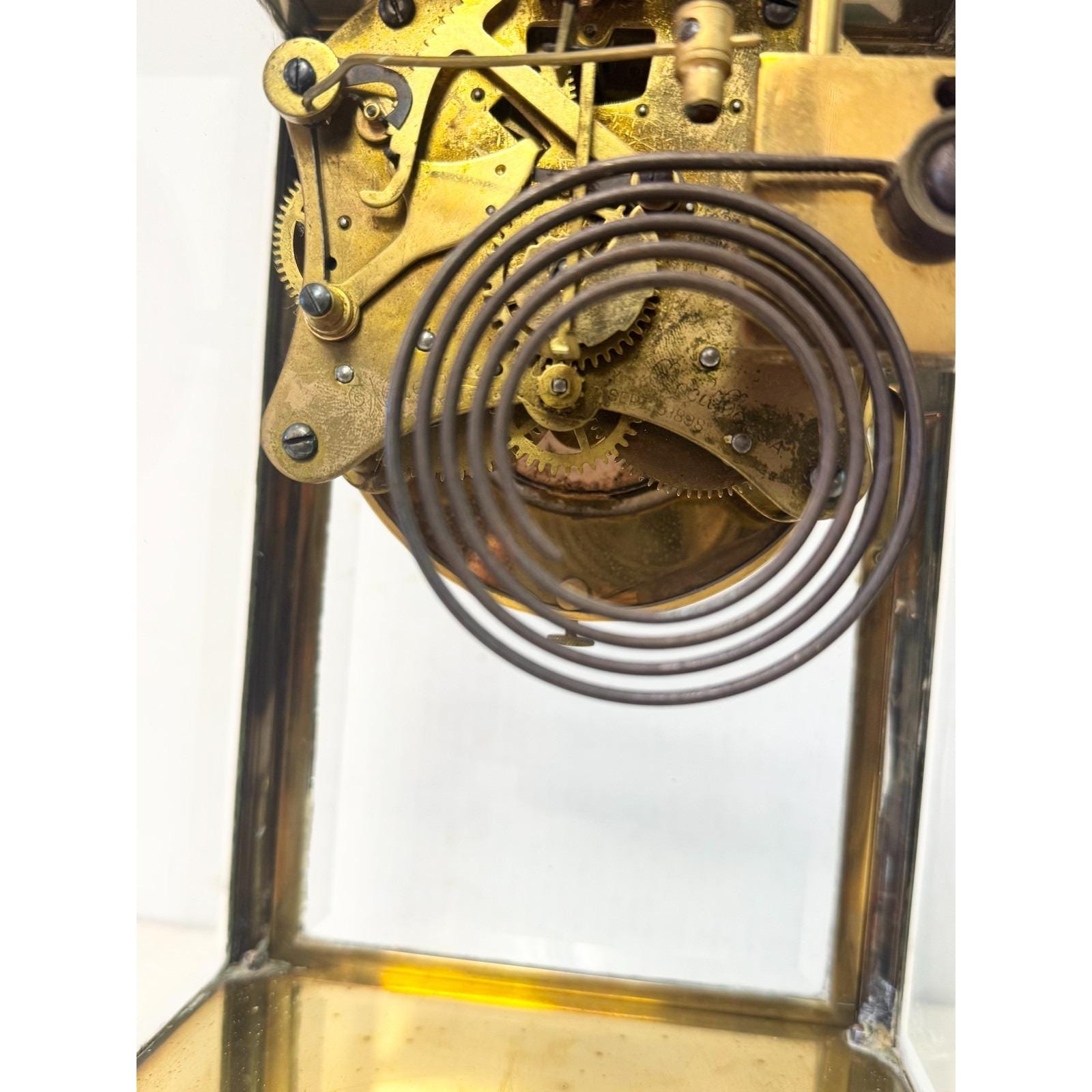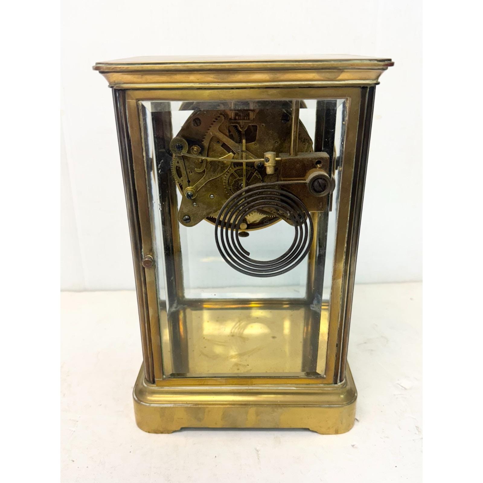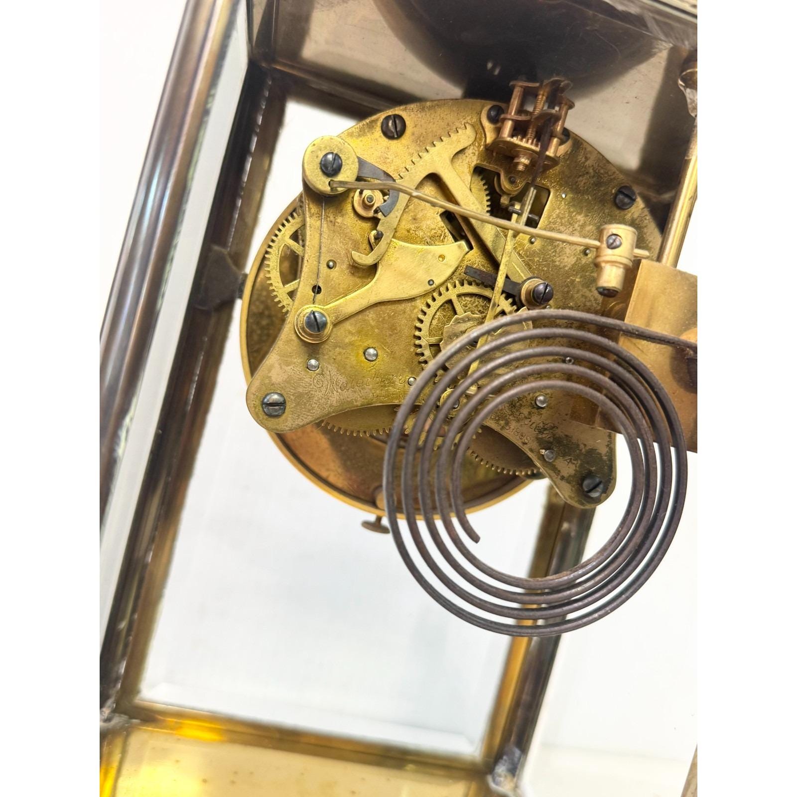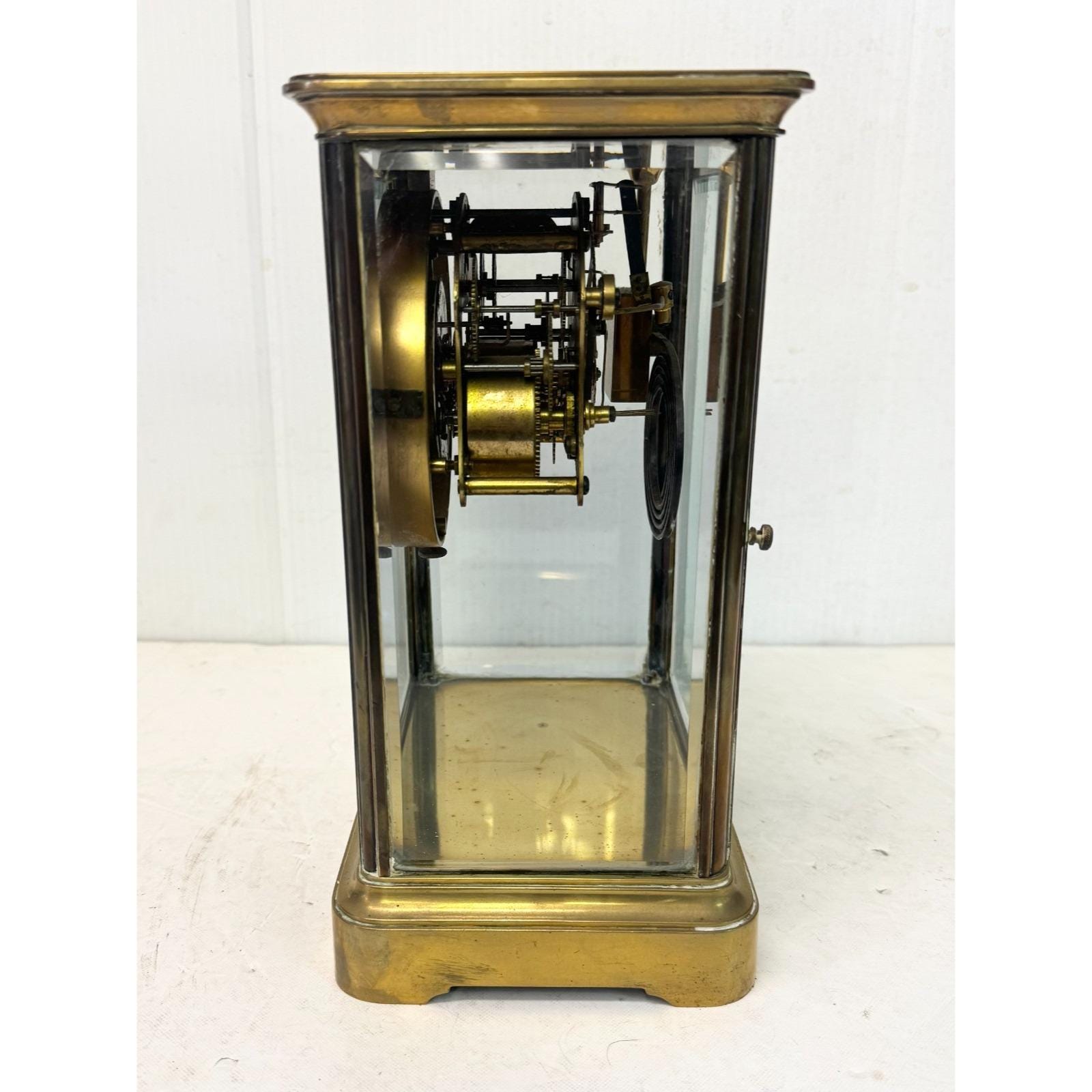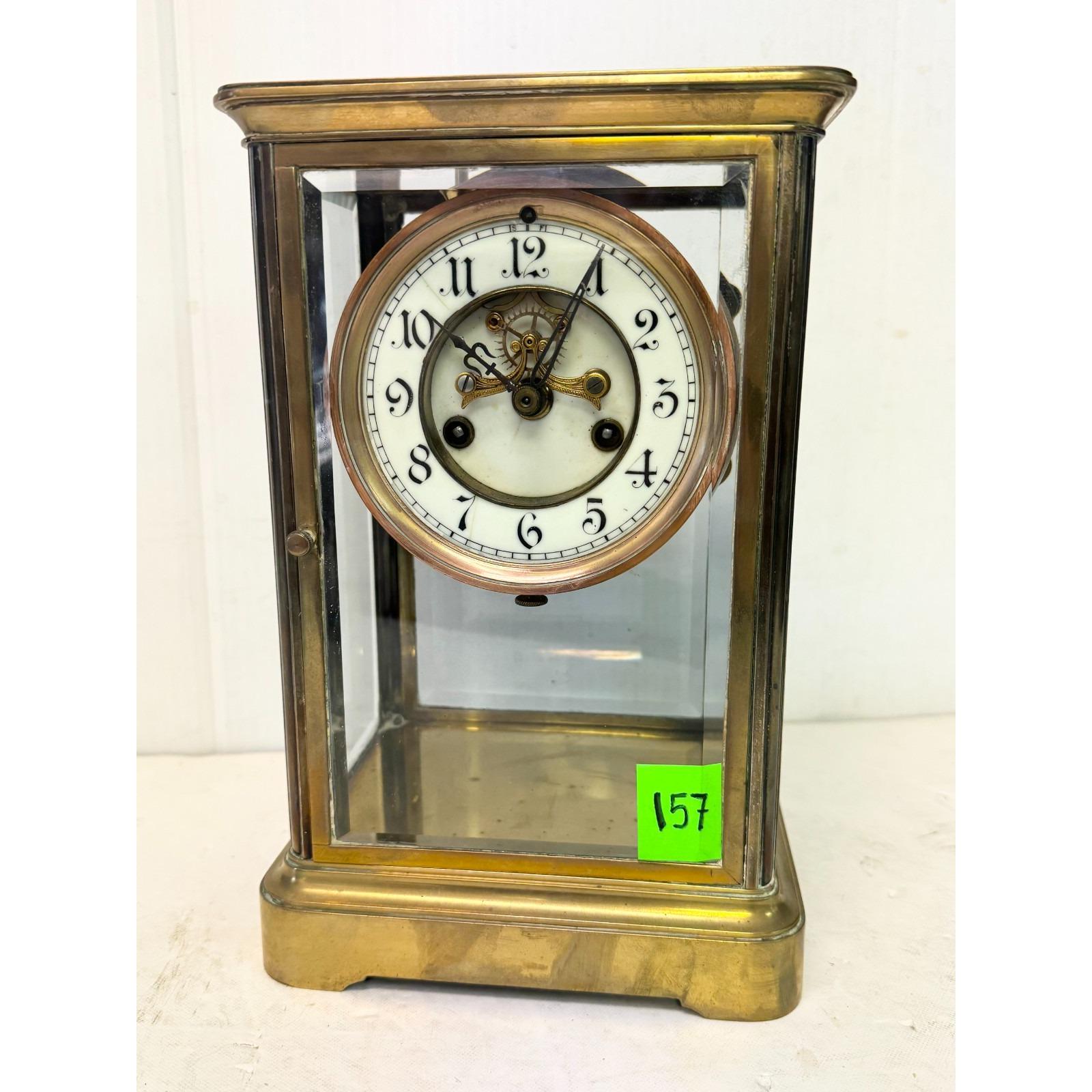 Two doors that open and close with latch on front and back. Marked Waterbury Pat 1989. Antique glass mantle clock. Beveled glass. 10.5 inches tall. 6.5 inches wide. Depth is 5.5 inches. 11 lbs. Selling "as is." Not sure if it is in working condition.