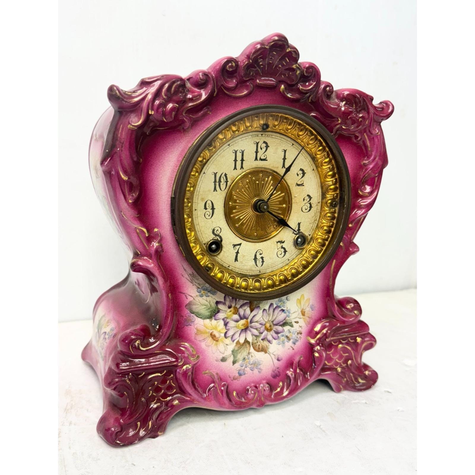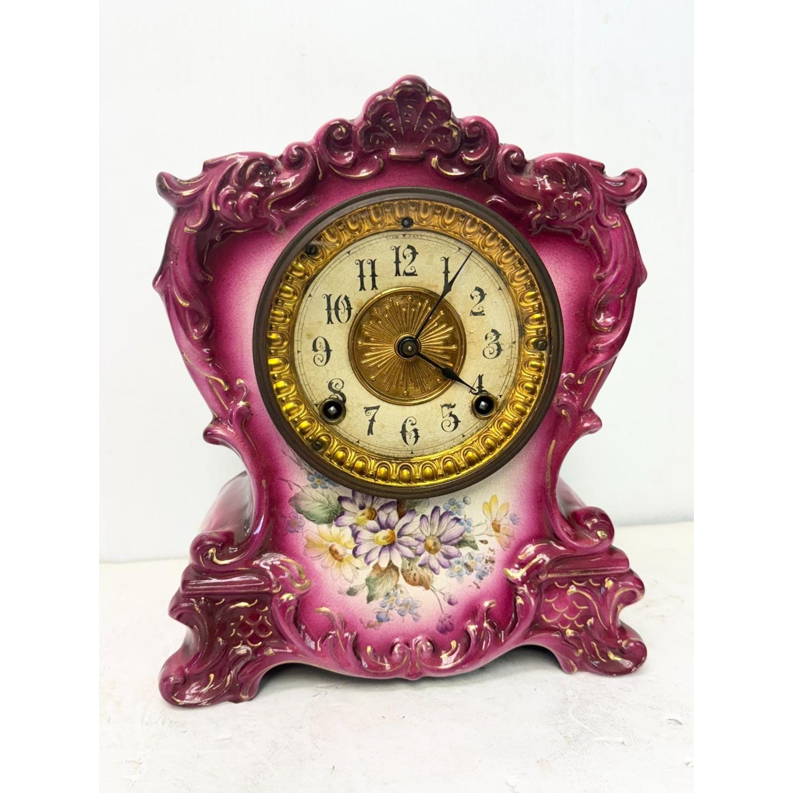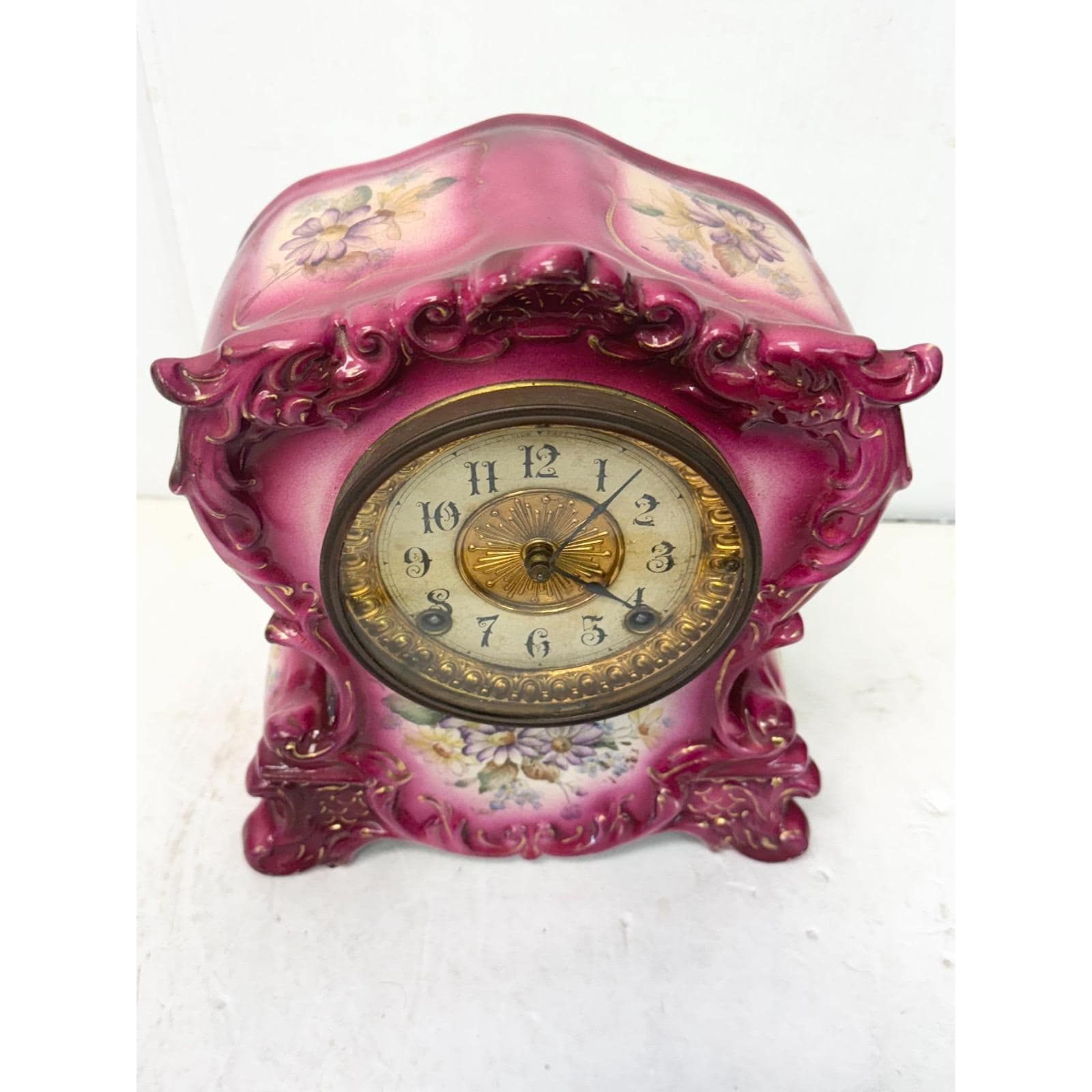 Hand painted. Beautiful porcelain clock marked Richie on back. Ansonia Clock Co New York marked on inner mechanism. Beautiful shape and hand painted design. Pink clock. Hinged glass cover over clock face. Stunning clock. 10.5 inches tall, 9 inches wide, depth is 5 inches. 10 lbs. Selling "as is." Not sure if it is in working condition.