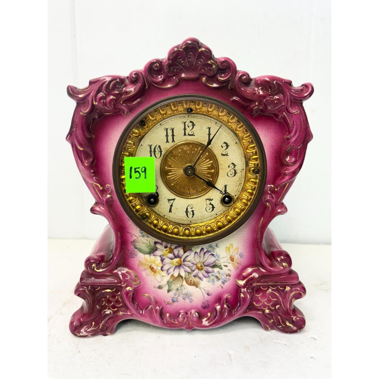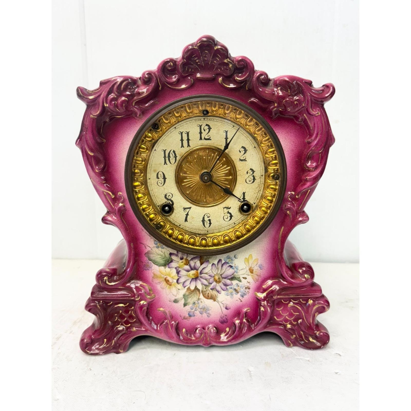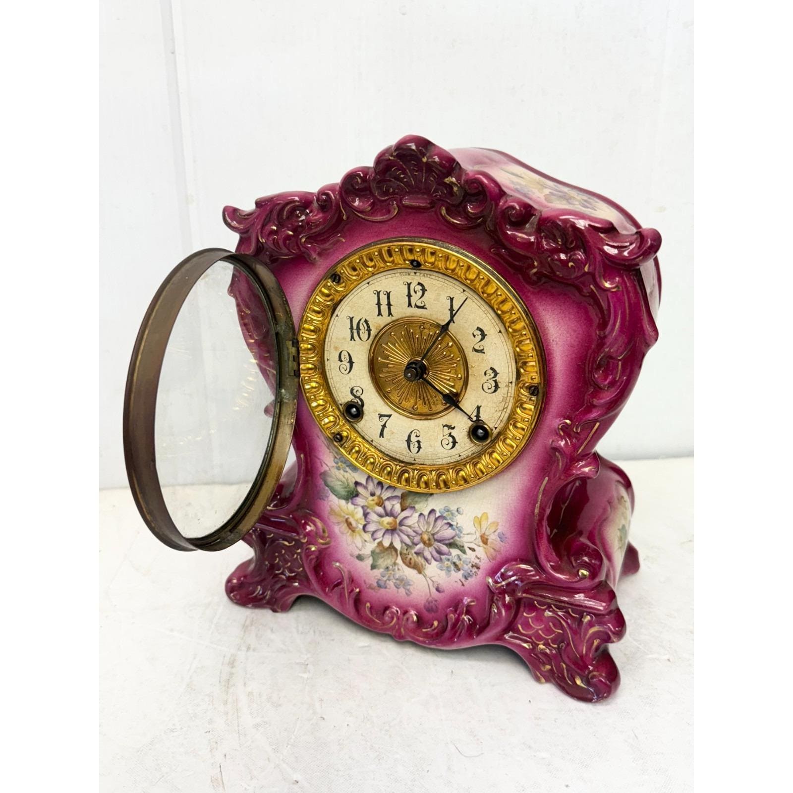 Hand painted. Beautiful porcelain clock marked Richie on back. Ansonia Clock Co New York marked on inner mechanism. Beautiful shape and hand painted design. Pink clock. Hinged glass cover over clock face. Stunning clock. 10.5 inches tall, 9 inches wide, depth is 5 inches. 10 lbs. Selling "as is." Not sure if it is in working condition.