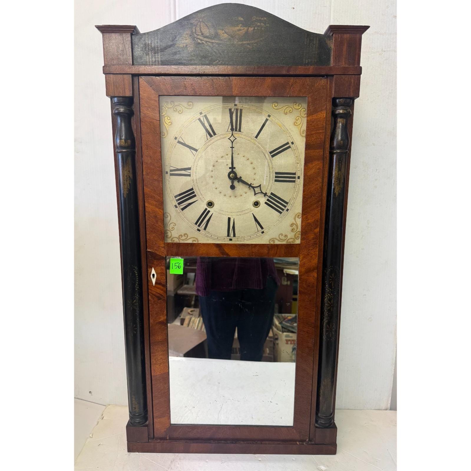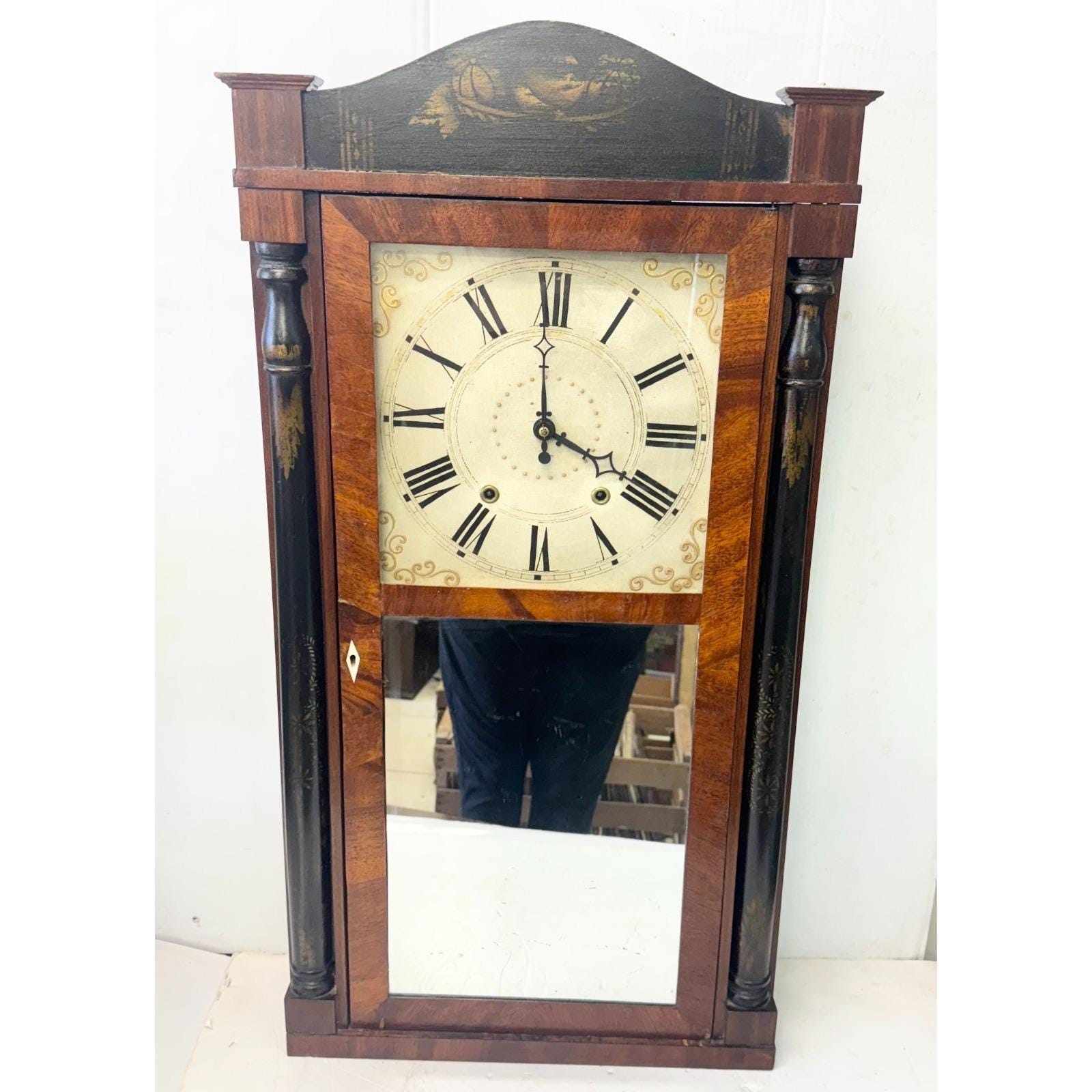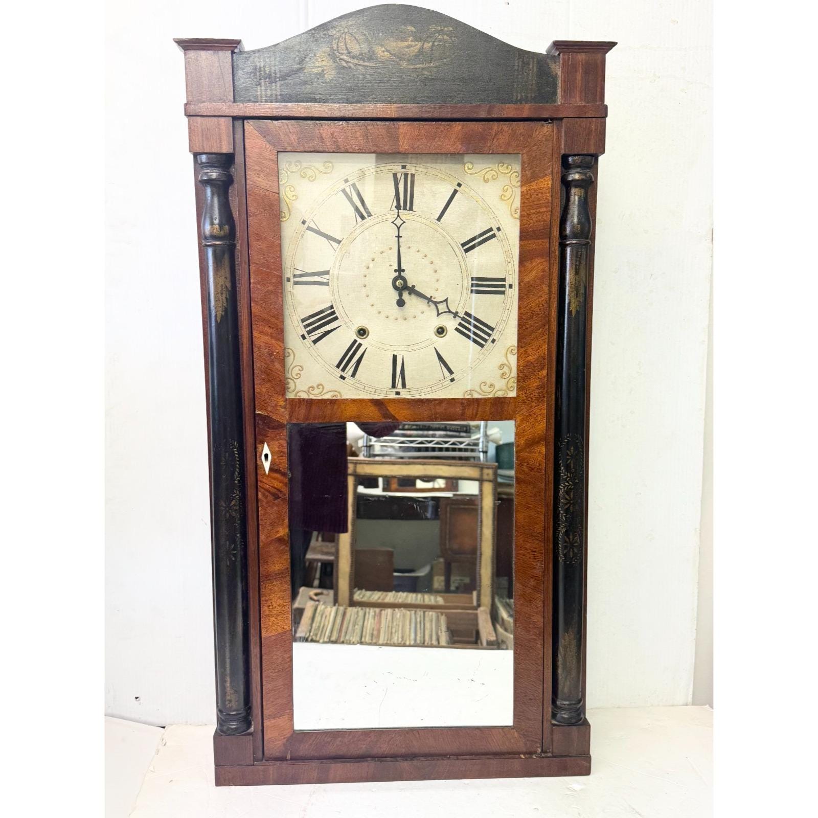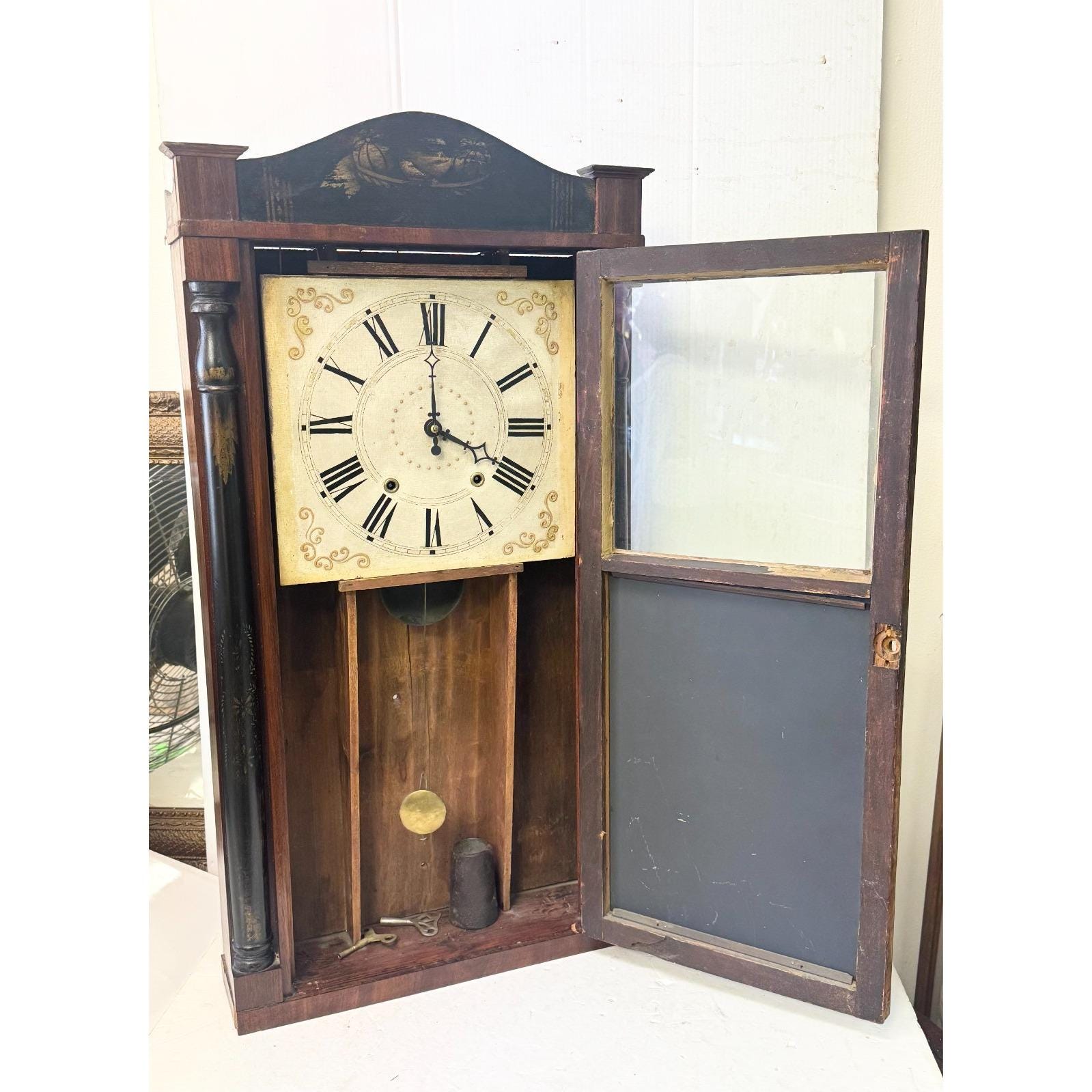Antique wood clock with Roman numerals and both dials, beautiful artwork. Glass and mirror on door. Painted wood top and sides. Weighted clock. Has weight, pendulum and two keys inside. Hooks for hanging in back. 34.5 inches tall. 17.5 inches wide. Depth is 5 inches. 24 lbs. Selling "as is." Not sure if it is in working condition.