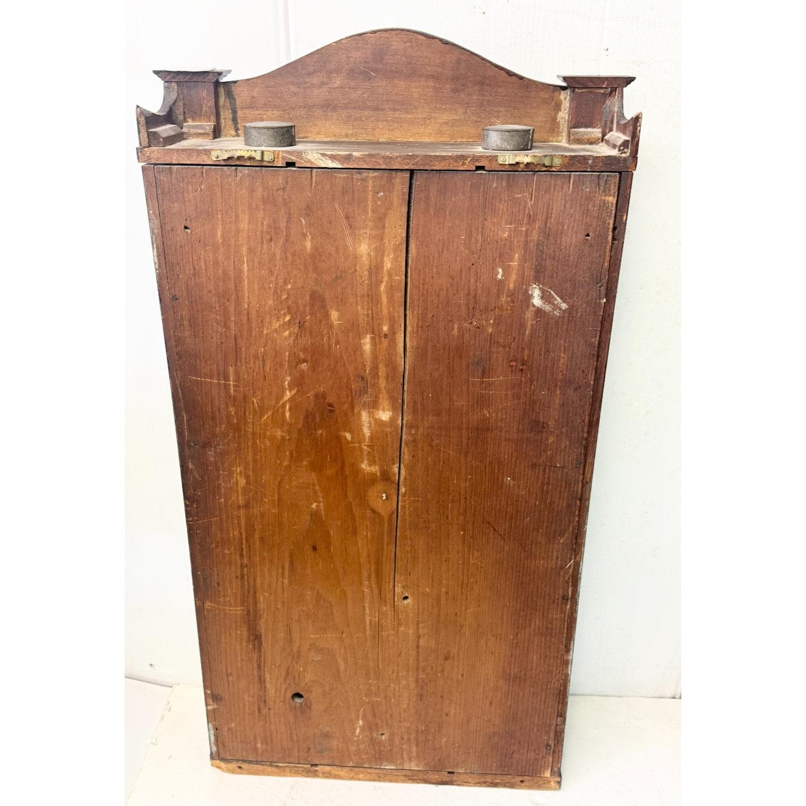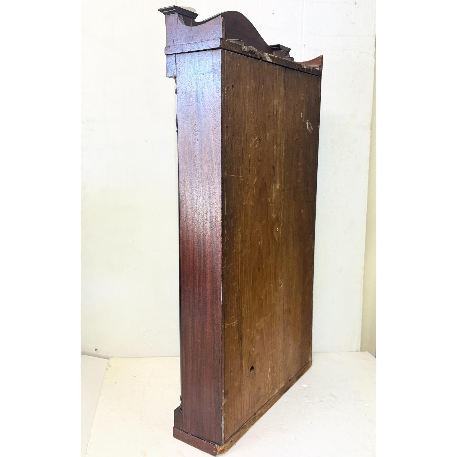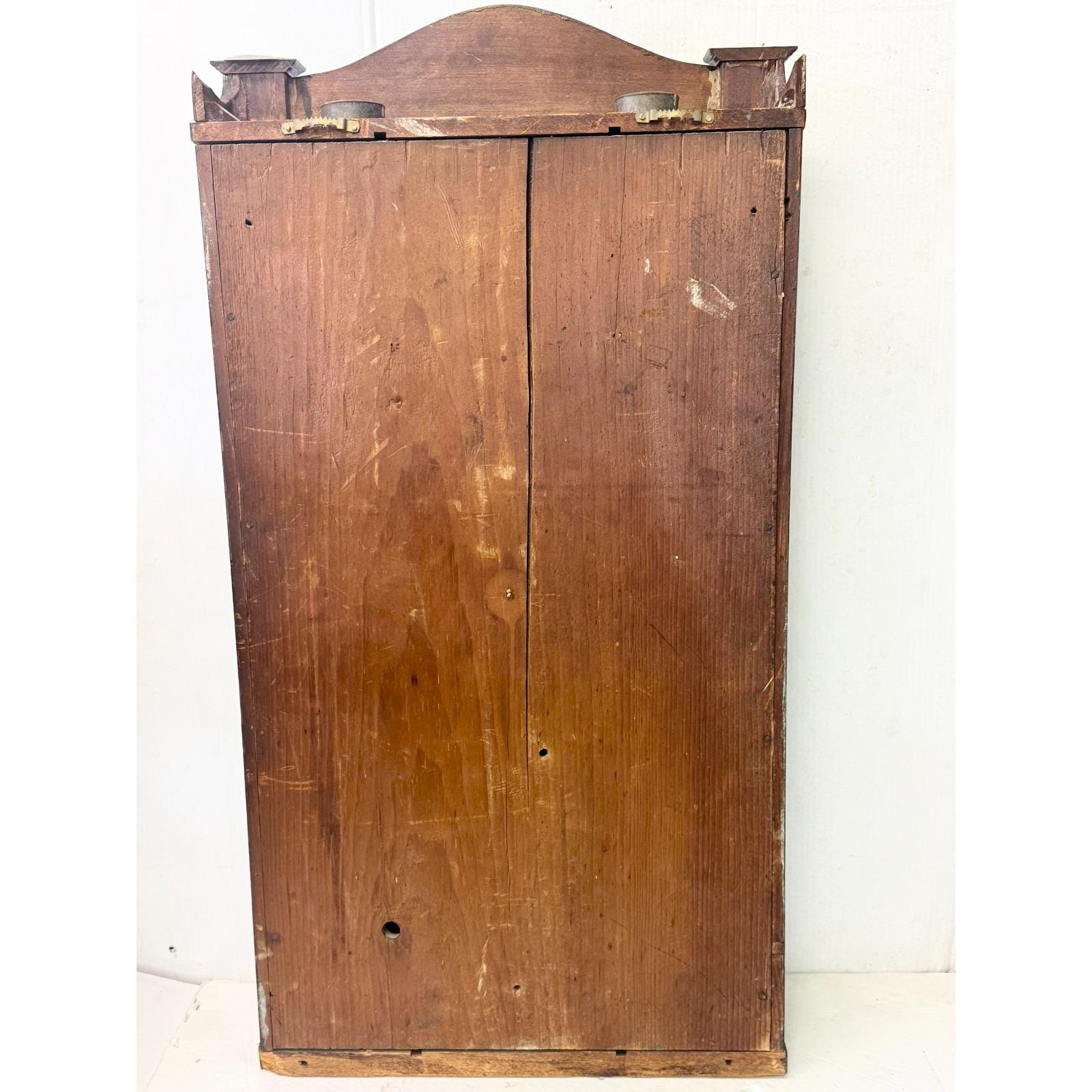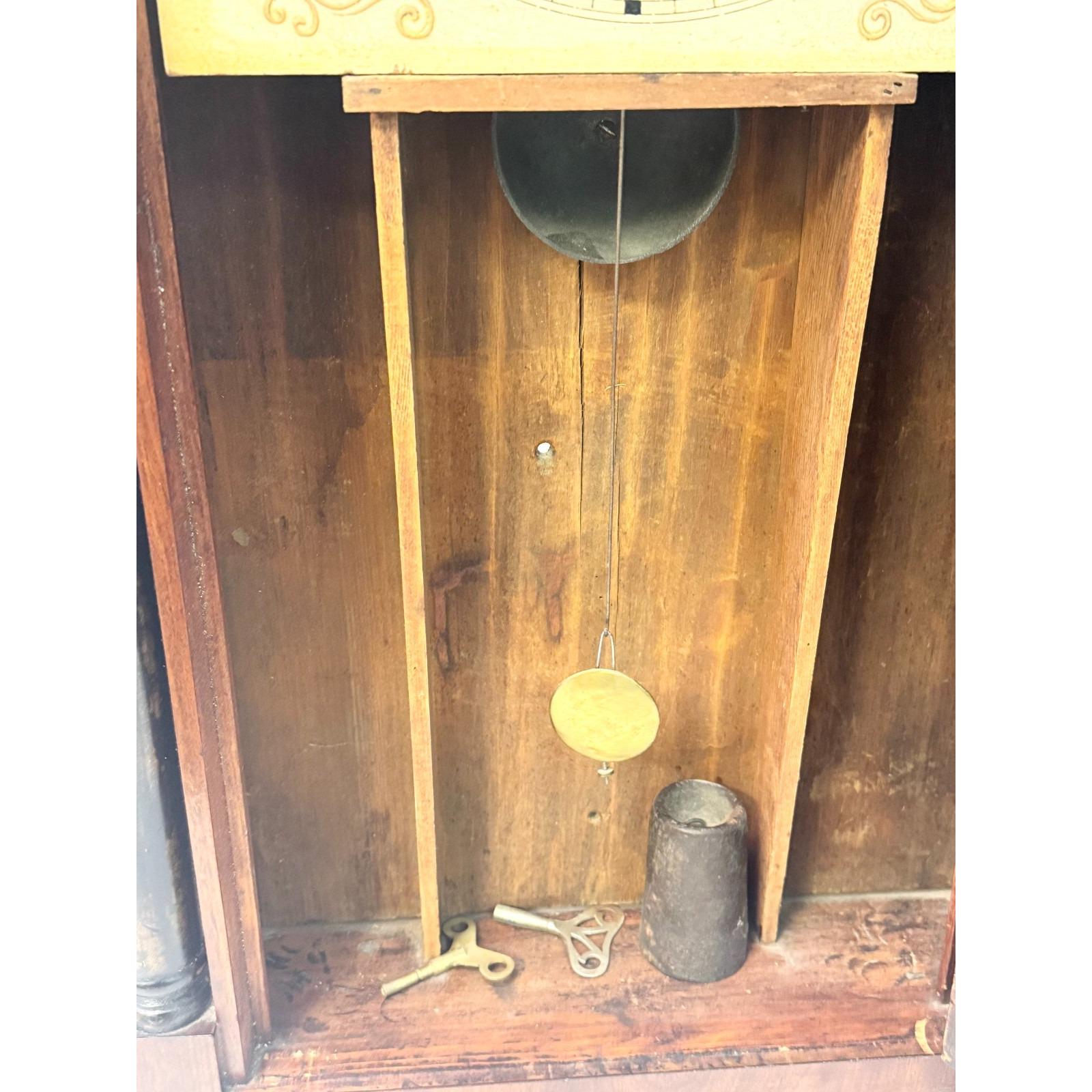 Antique wood clock with Roman numerals and both dials, beautiful artwork. Glass and mirror on door. Painted wood top and sides. Weighted clock. Has weight, pendulum and two keys inside. Hooks for hanging in back. 34.5 inches tall. 17.5 inches wide. Depth is 5 inches. 24 lbs. Selling "as is." Not sure if it is in working condition.