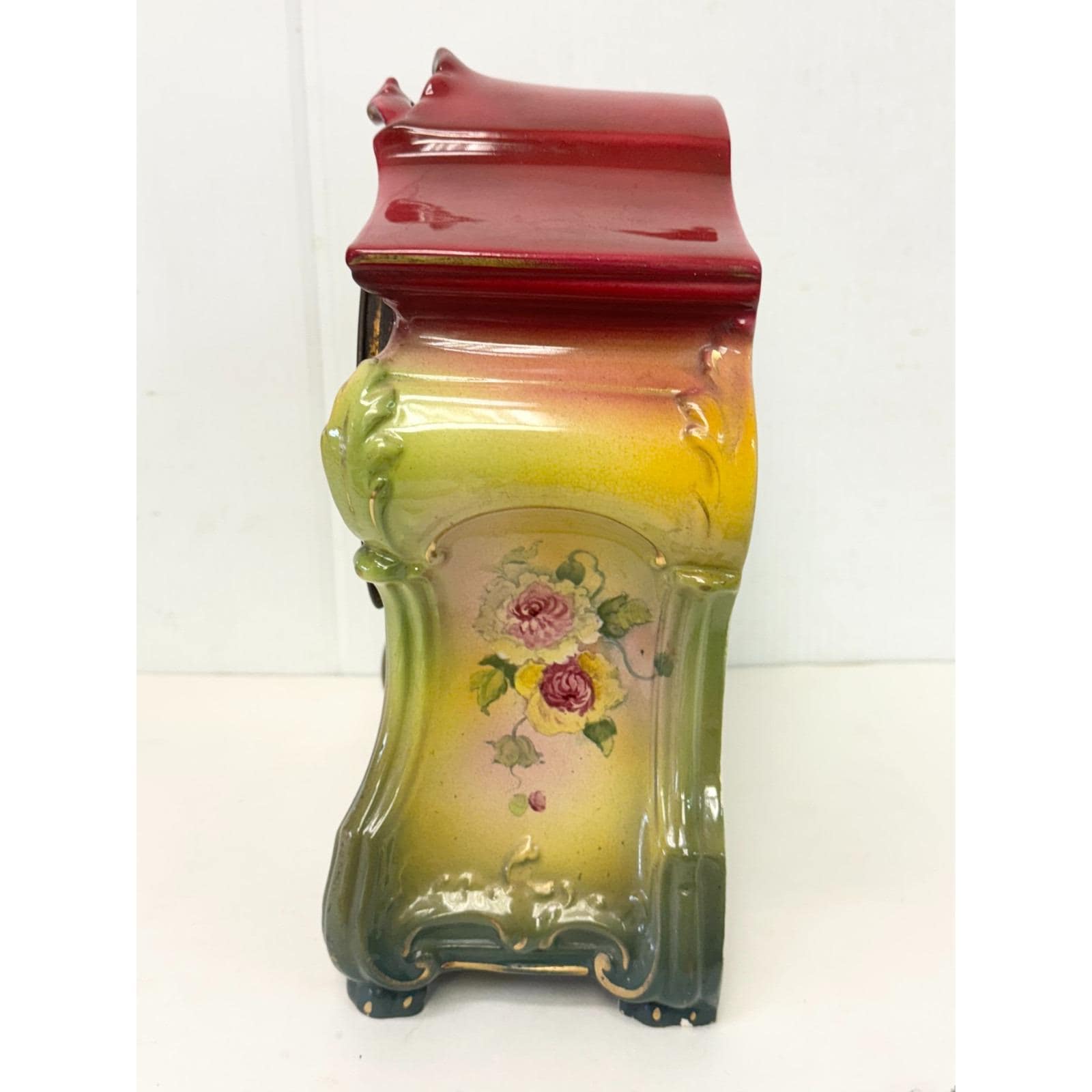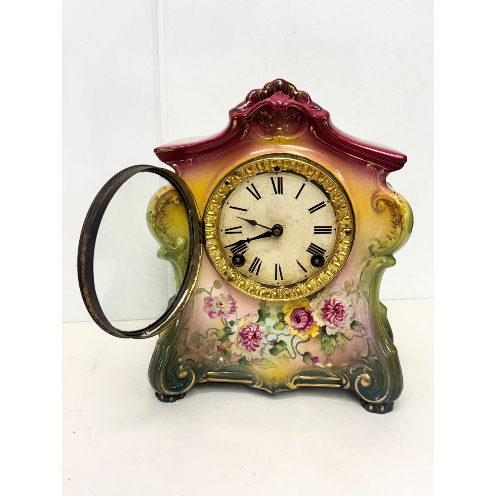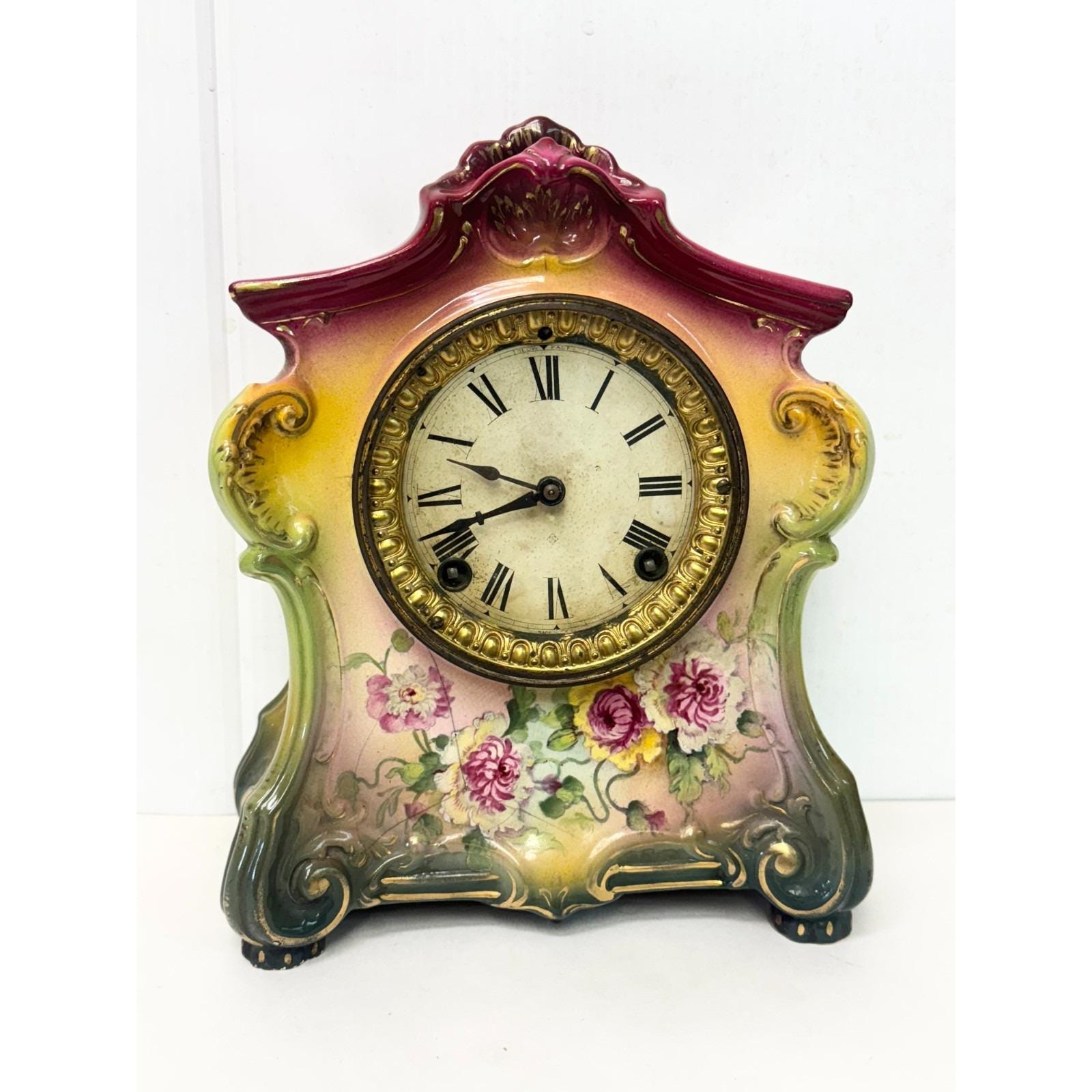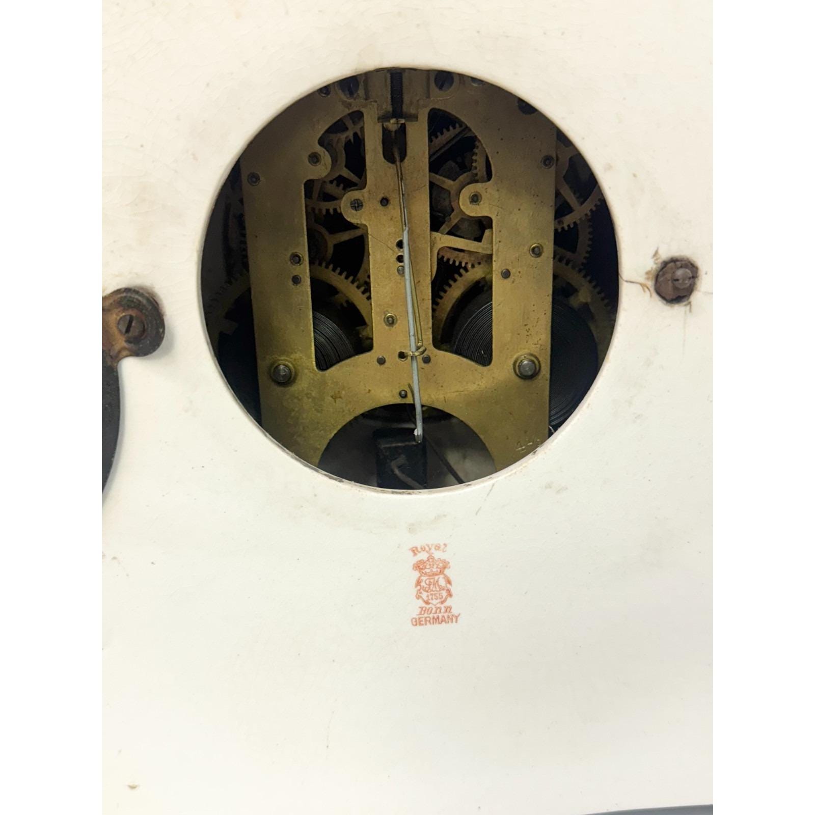 Signed on back Royal Bonn Germany. Floral hand painted porcelain clock. Inner clock mechanism. Signed 1103 on back. Back cover. Has cracks but all together. Beautiful hand painted flowers and colorful clock. Glass cover over clock face. Footed porcelain clock. 11.25 inches tall, 10 inches wide, depth is just under 5 inches. 10 lbs. Selling "as is." Not sure if it is in working condition.