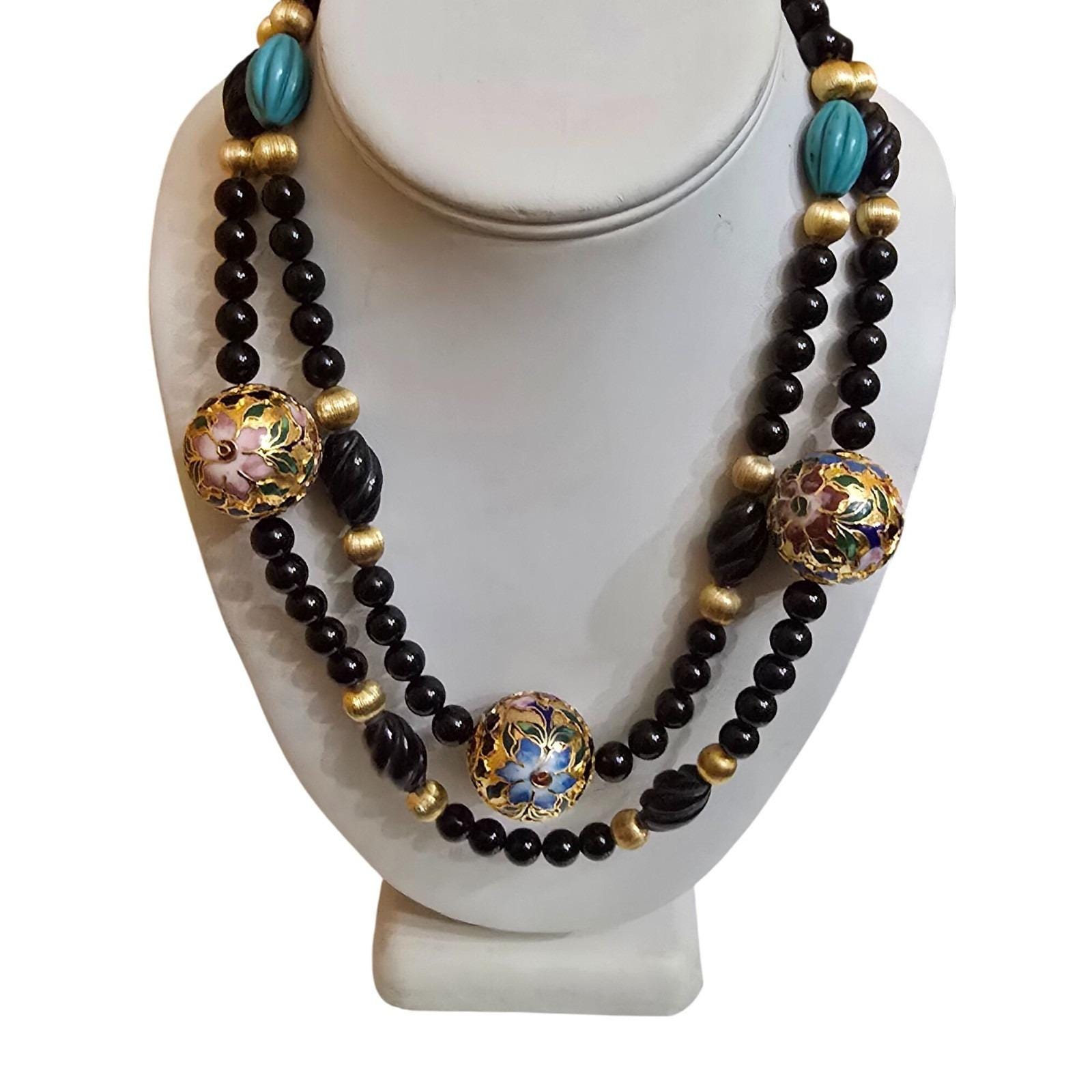 Vintage Signed Glass And Cloisonne Beautiful Double Strand Necklace (A9425)