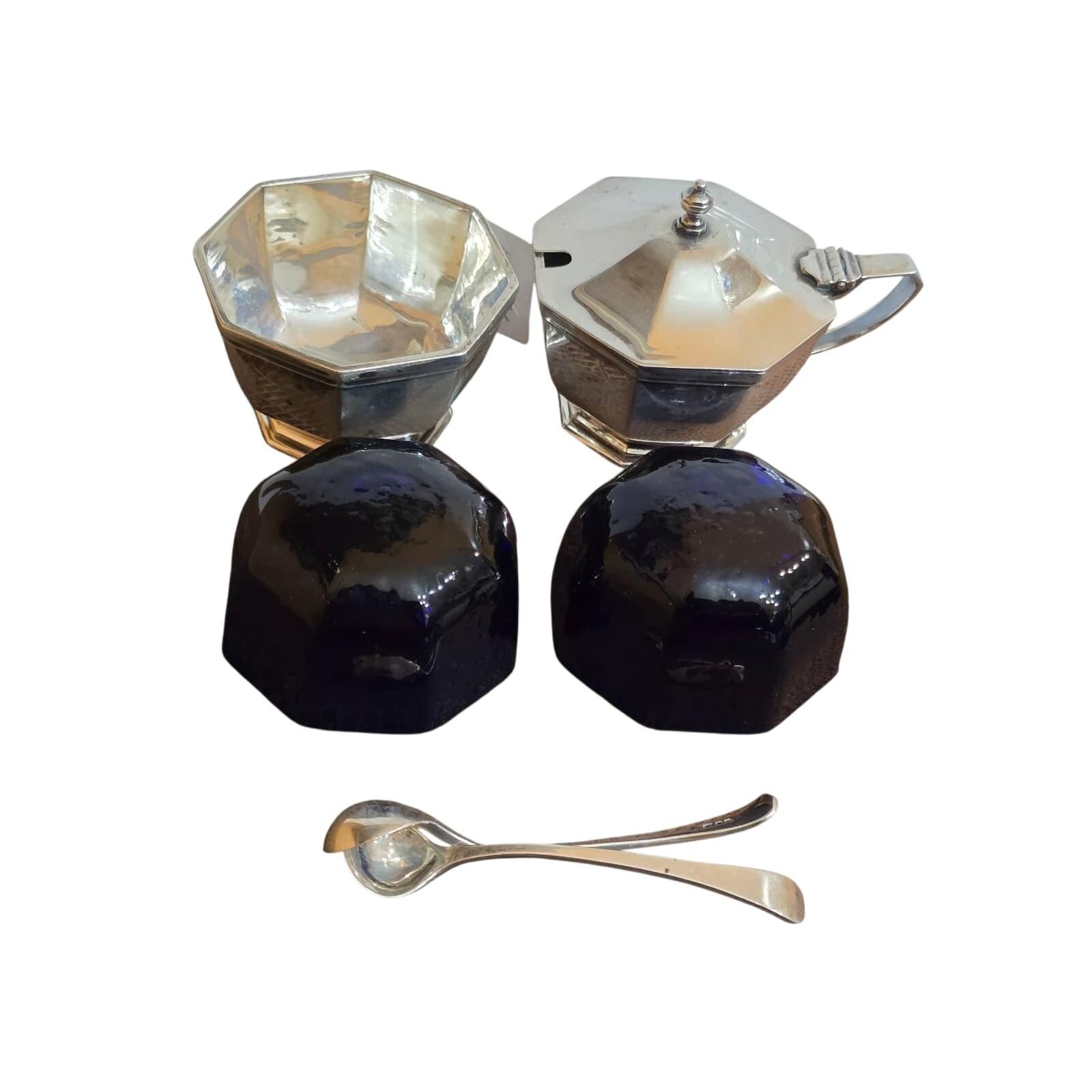 Antique Early 1900's T&Co Tiffany Made In England Hallmarked Sterling & Cobalt Blue Glass Lined Salt/Jam Servers W/ Spoons (A9403)