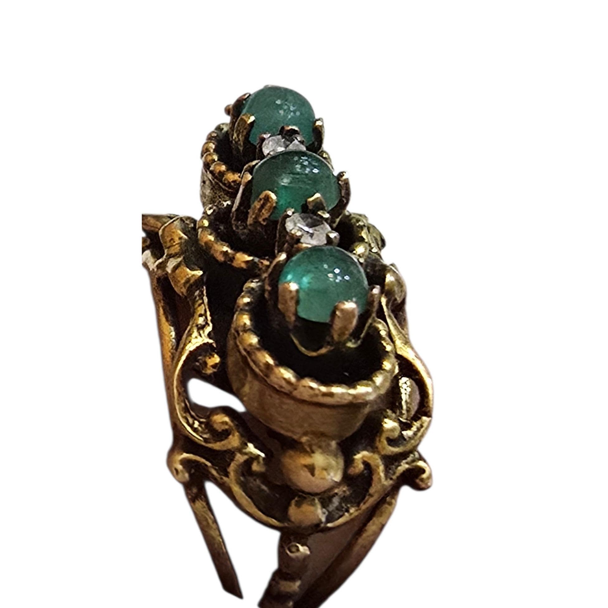 Details: Weight is 6.29 grams with stones. All stones go much higher than glass on the presidium gem tester. Exquisite workmanship & all stones are prong set. I believe this is marked; it's hard to tell. It tests as 14kt gold.