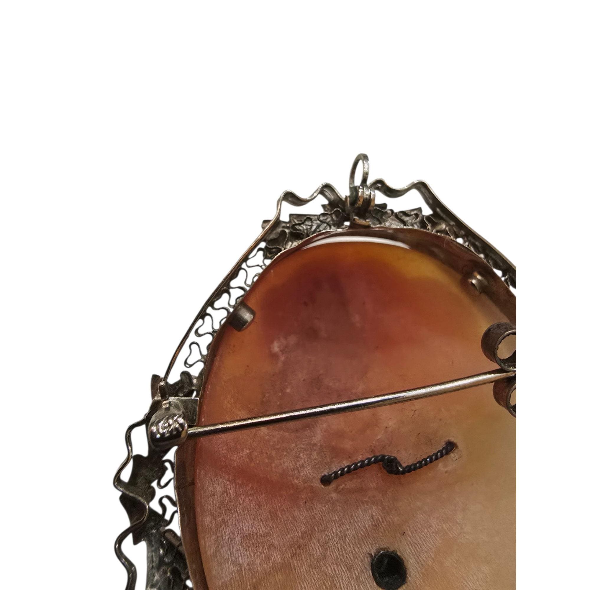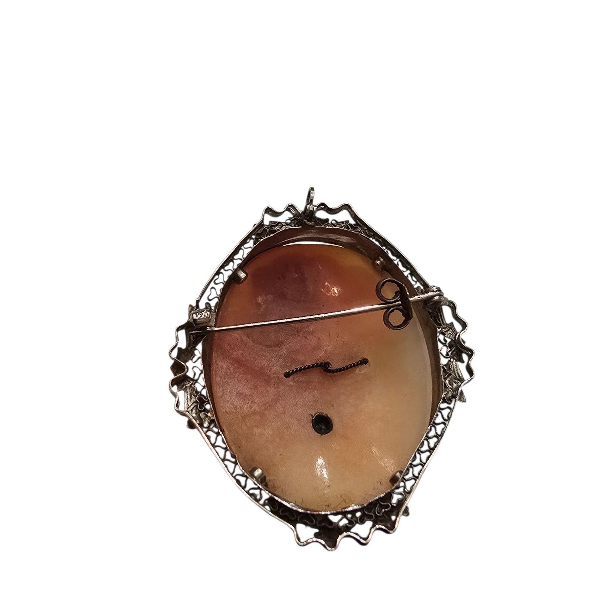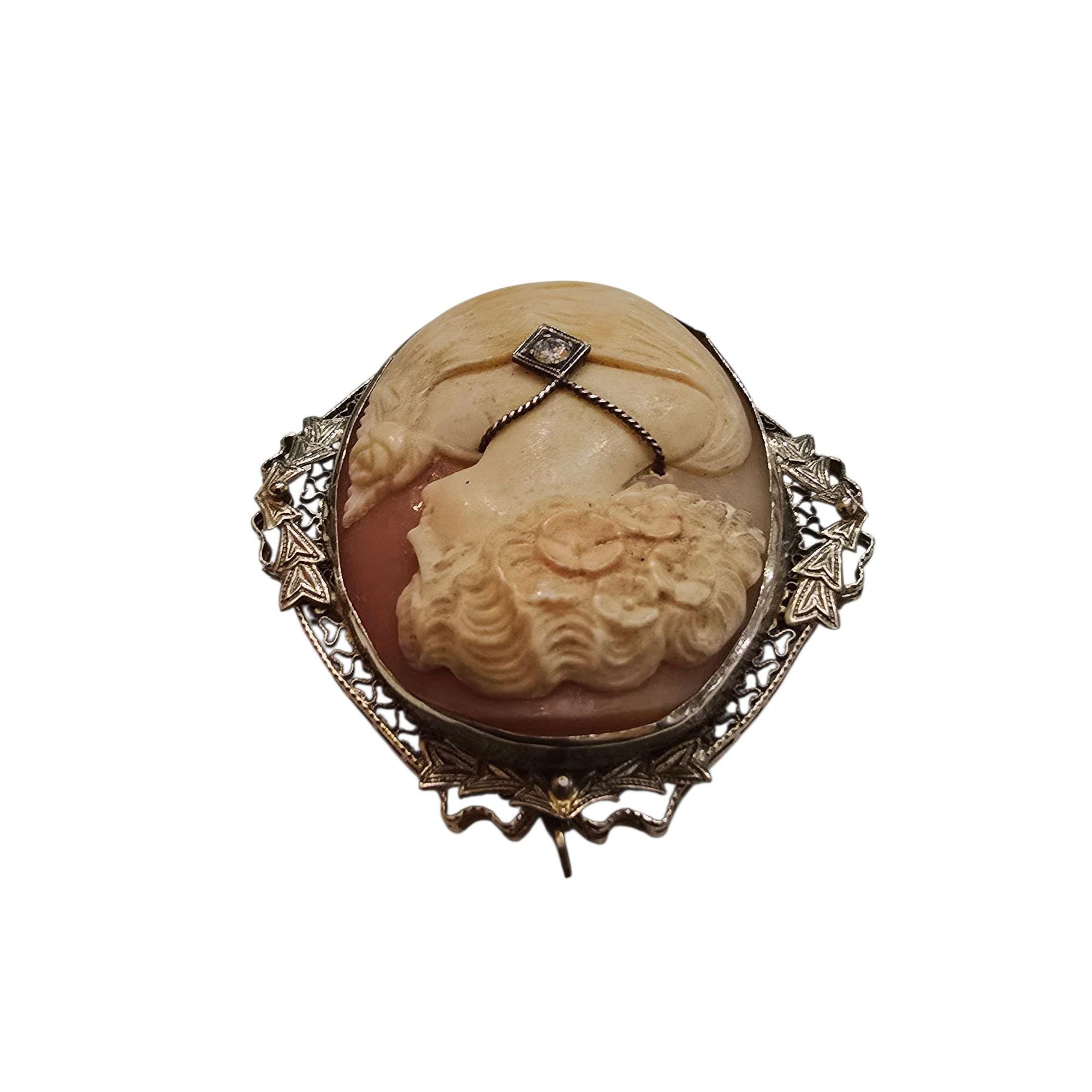 Details: Weighs 11.85 grams with cameo. Beautiful detailing, stunning hair & nice diamond. Marked on the pin/also a pendant & has a stopper on the pin stem.