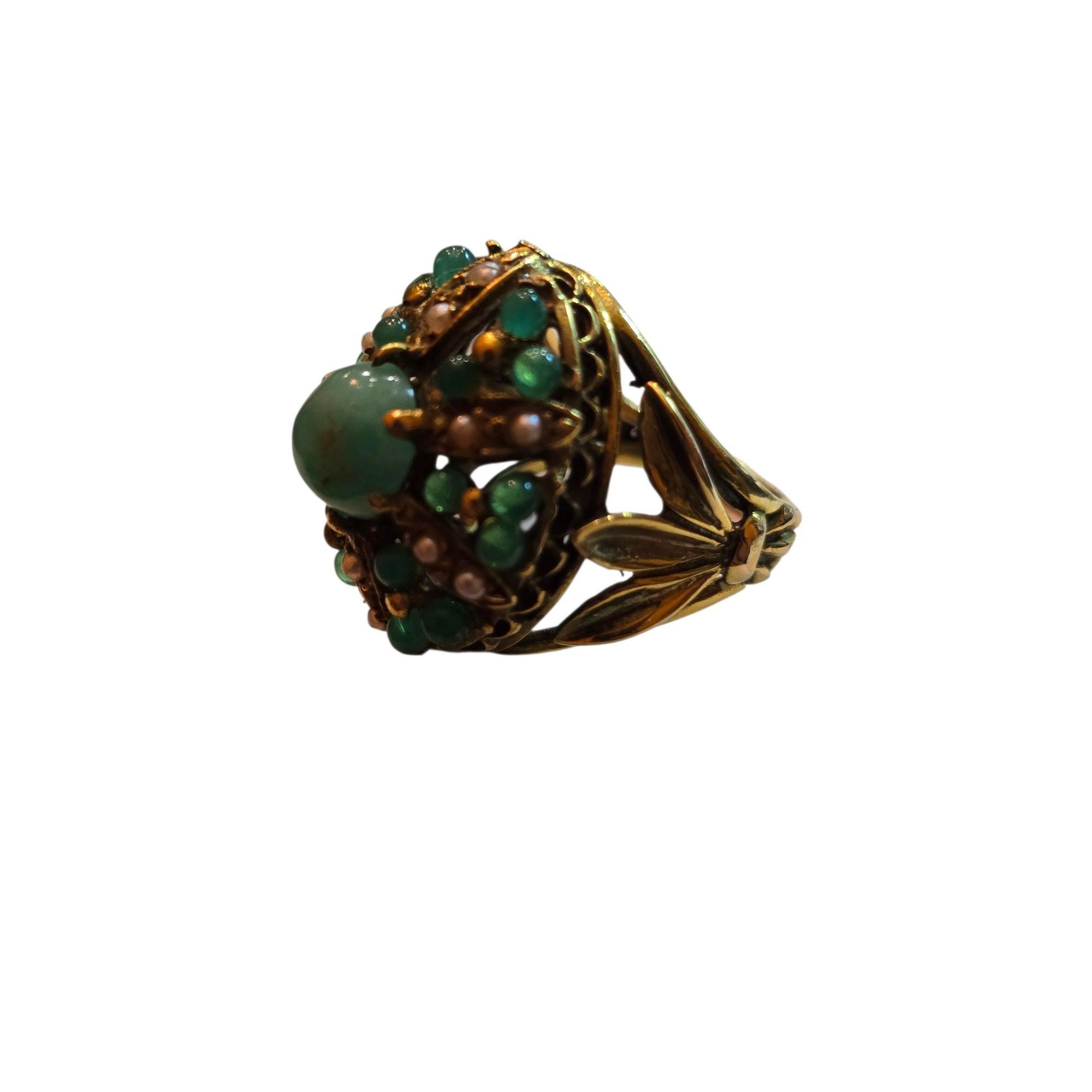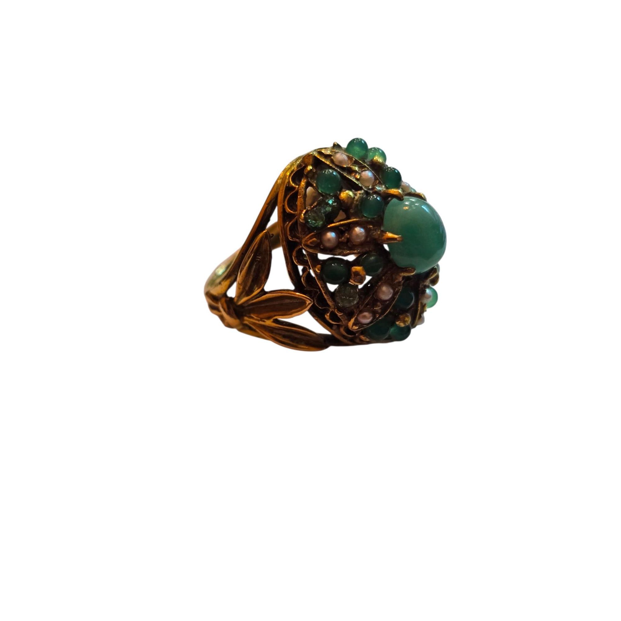 Vintage Jadeite (Jade?) & Pearl 14kt Gold Size 4 Ring (7769)