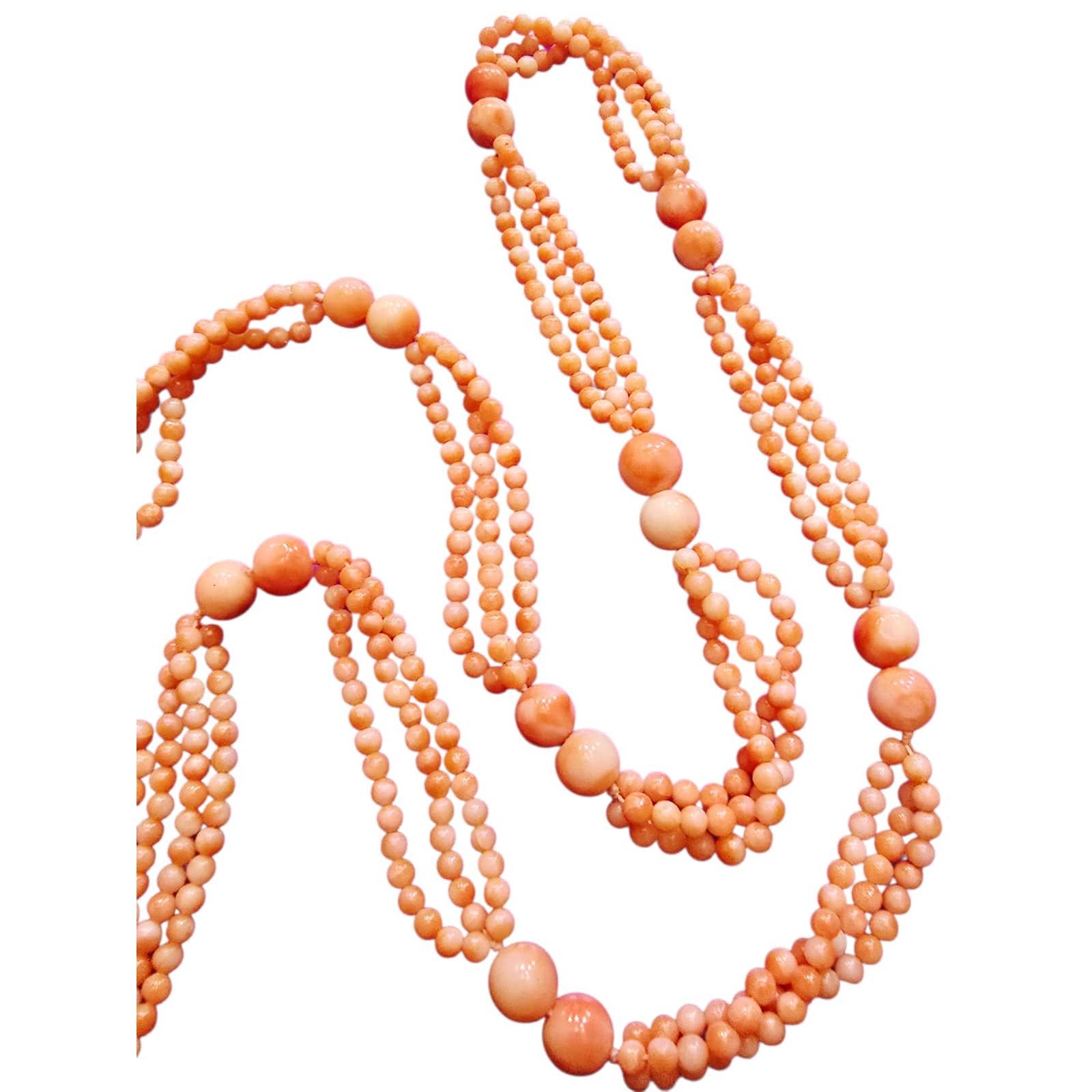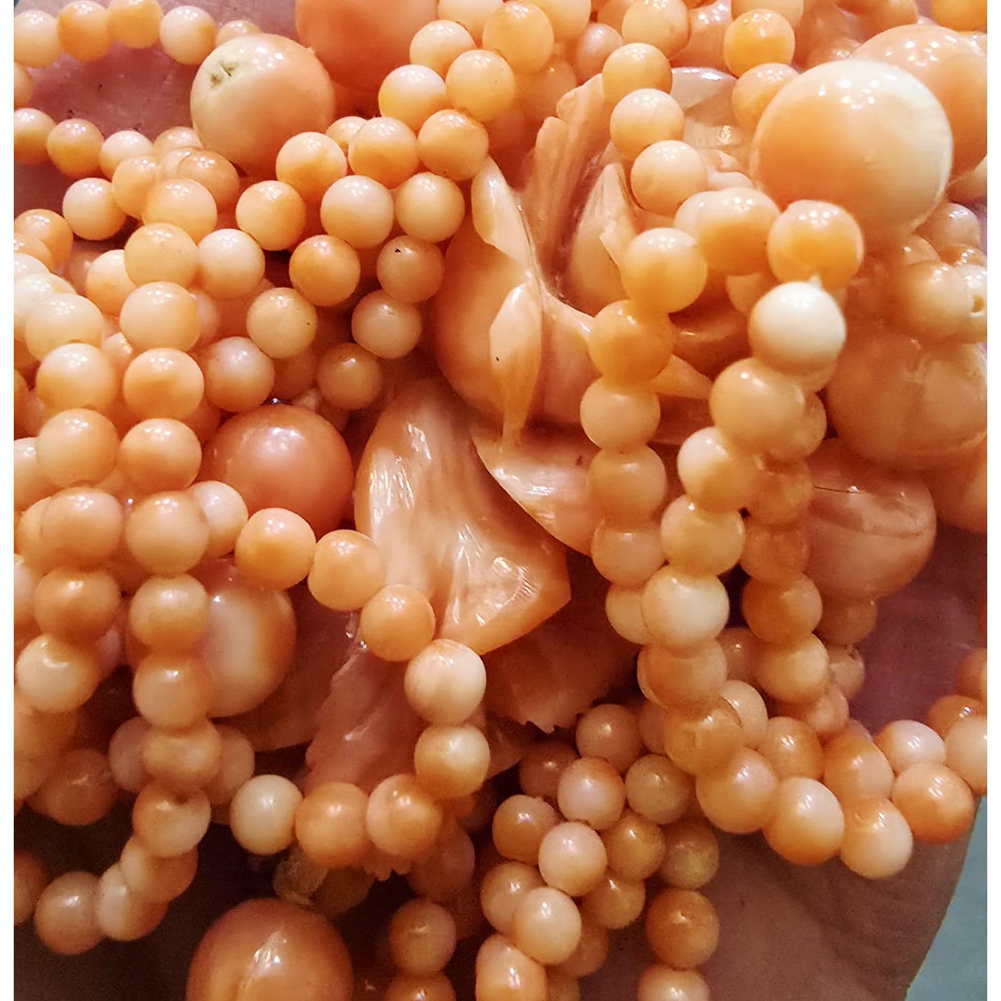 Details: Loop over and absolutely stunning. A few beads are angel skin coral. Hand beaded, a mix of 3 strands of 2 or 3 mm beads and 8 mm beads.