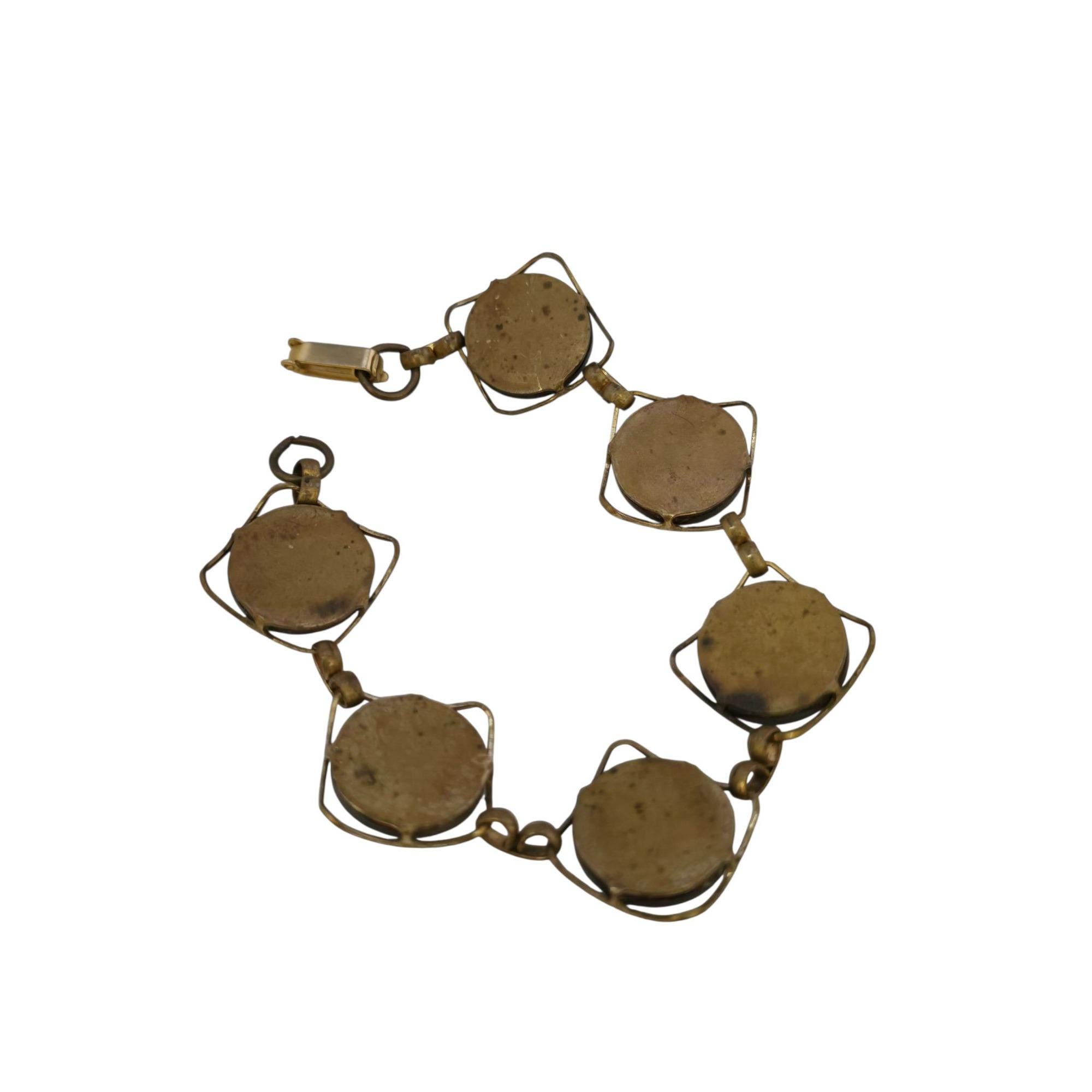 Details: It features brass and circle glass. The fold-over clasp is new to the piece and should have a small jump ring.