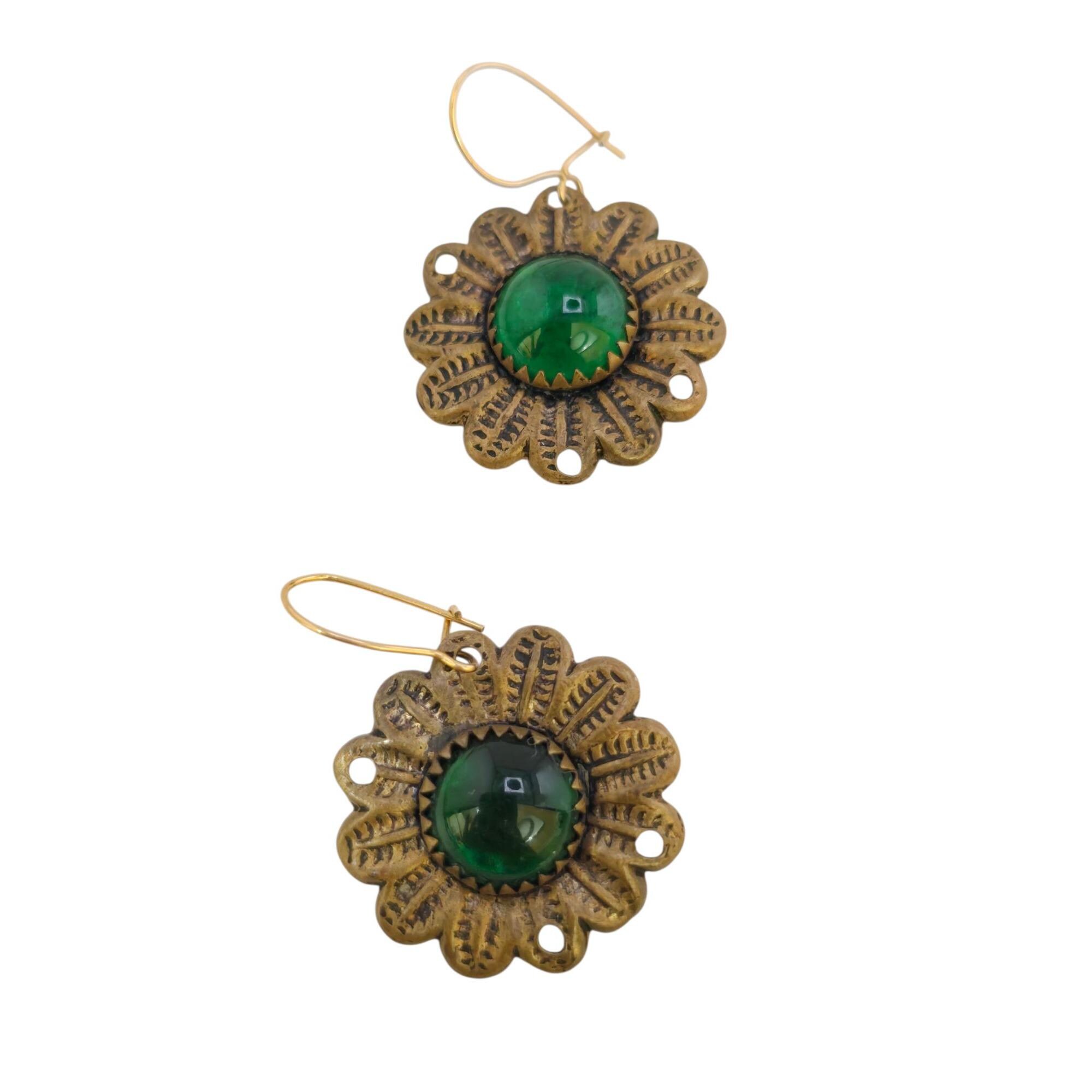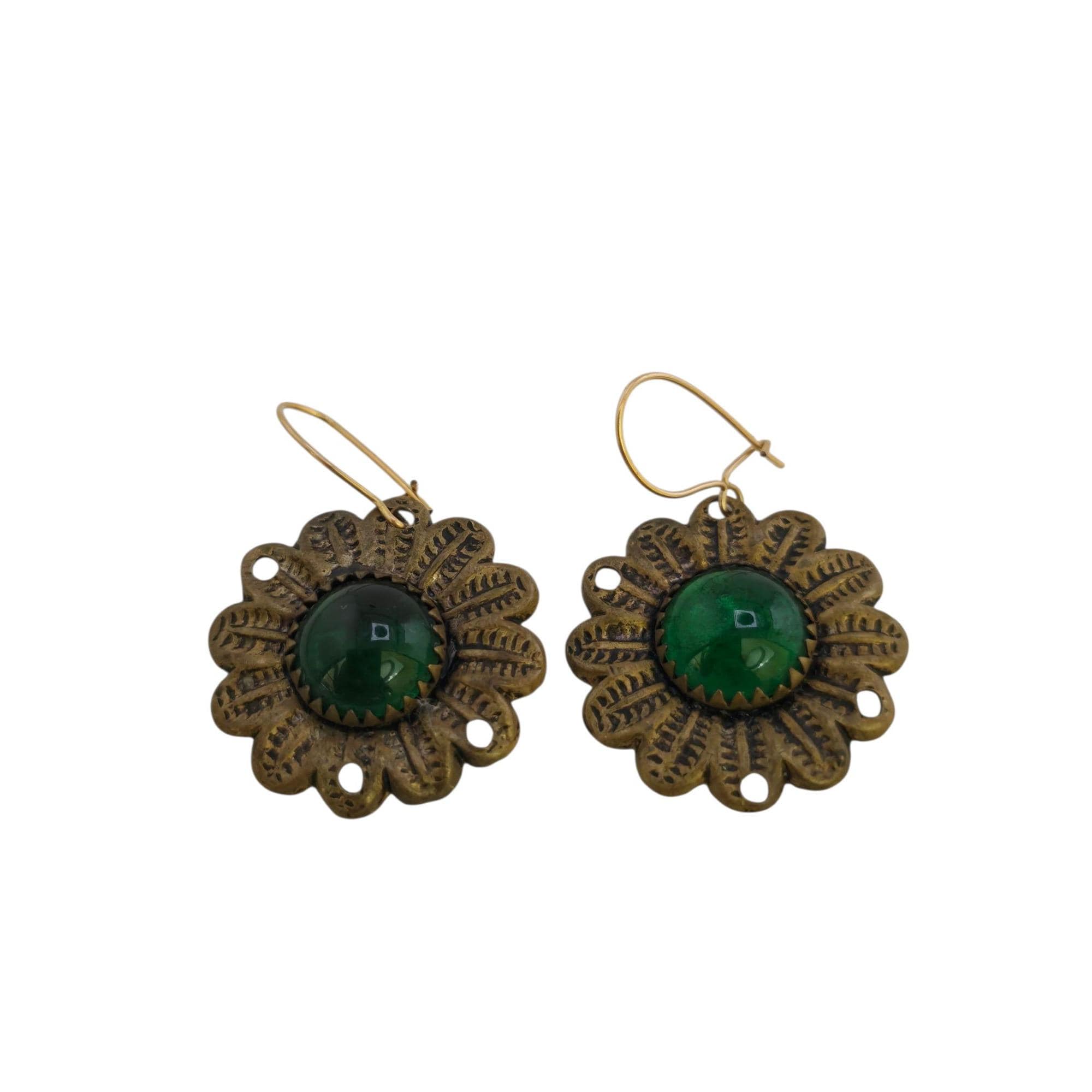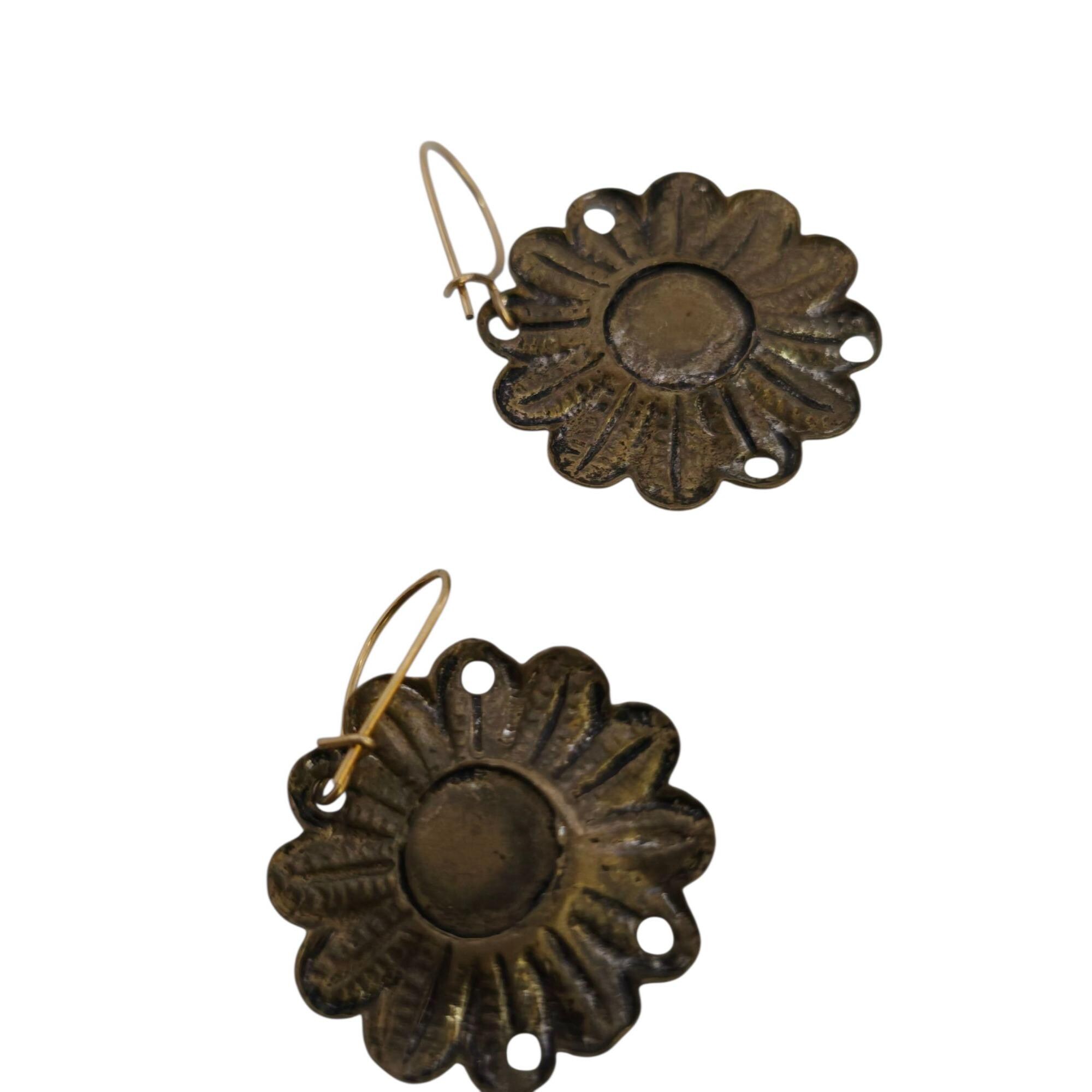 Details: Fishhooks are newer to flowers. The flowers are brass, domed glass, and sawtooth bezel set. There are holes on the edges of flowers