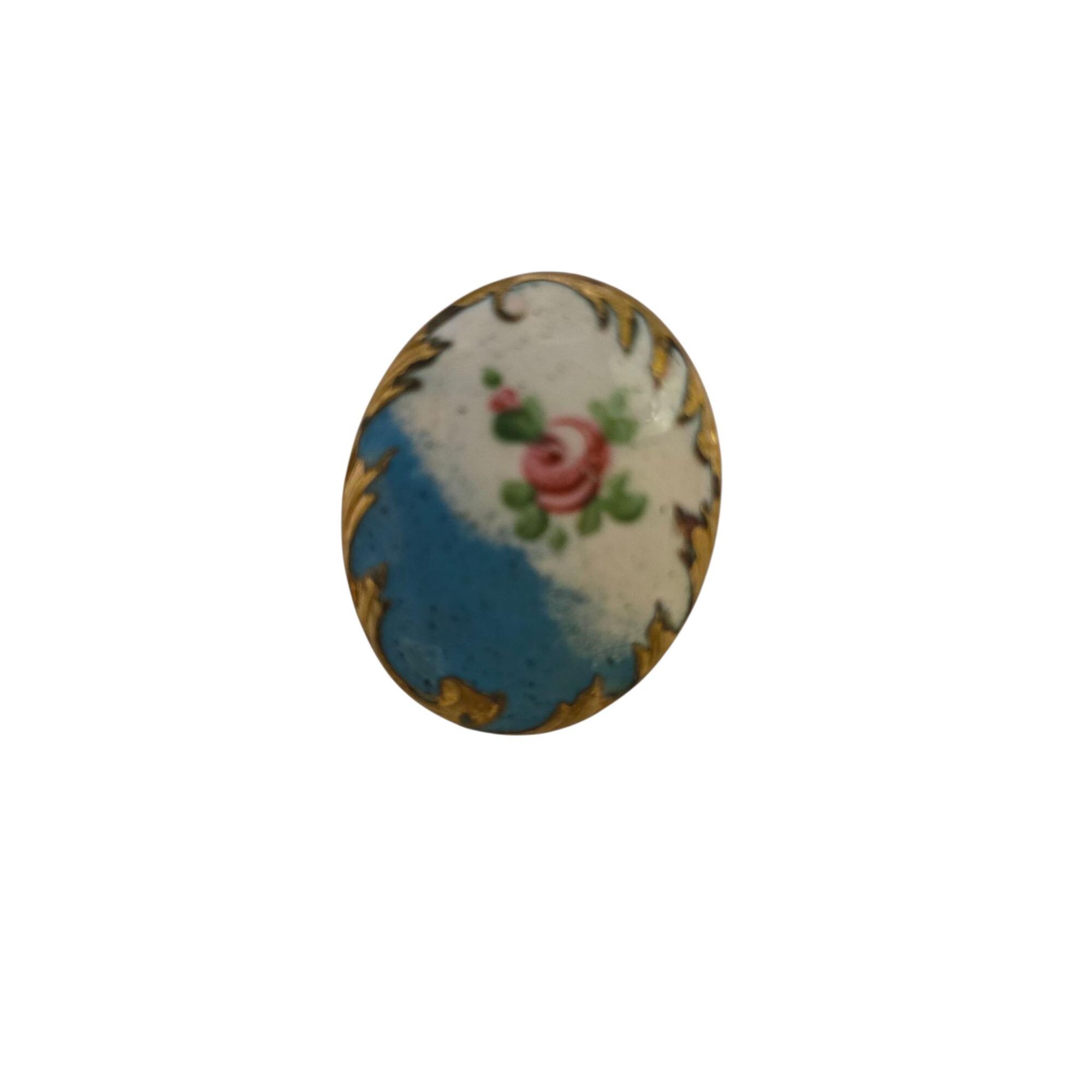 Details: Beautiful design; interesting brass bezel around enamel. There are a few scrapes to the enamel.