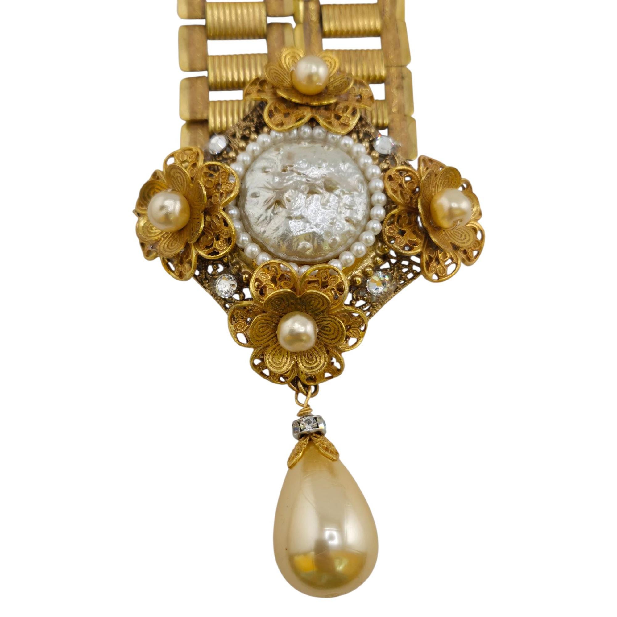 Details: Signed. Pearl cabochons have designs on them and a few light scratches.